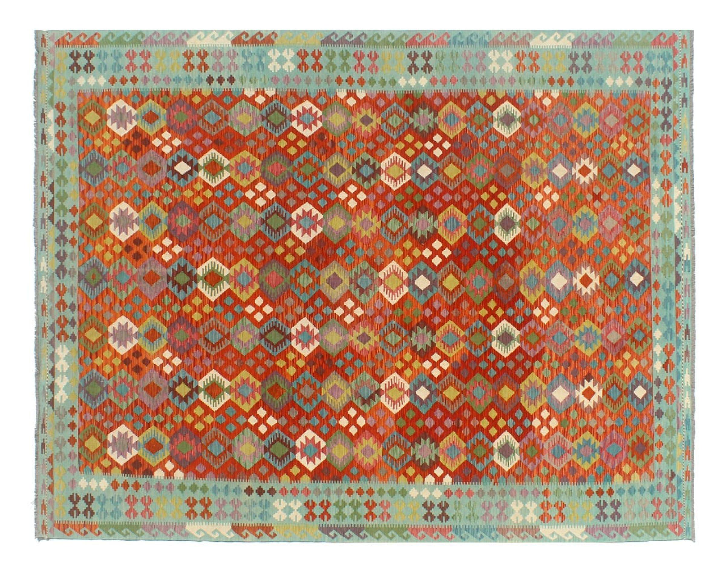 Estas alfombras kilim muestran una diferencia decisiva con las alfombras anudadas a mano - son tejidas a mano. Por lo tanto, no tienen un montón alto de lana y son a menudo más planos y más ásperos que las alfombras de lana anudada. Su fabricación es menos elaborada y por eso suelen ser mucho más baratas. Como ventaja, las alfombras de kilim son también mucho más ligeras y pueden ser colocadas por delante y por detrás. Los kilims tejidos a mano provienen originalmente de la antigua Persia y ahora también se fabrican a menudo en el Afganistán. Tienen patrones bastante simples y directos, que se deben a su técnica de tejido.