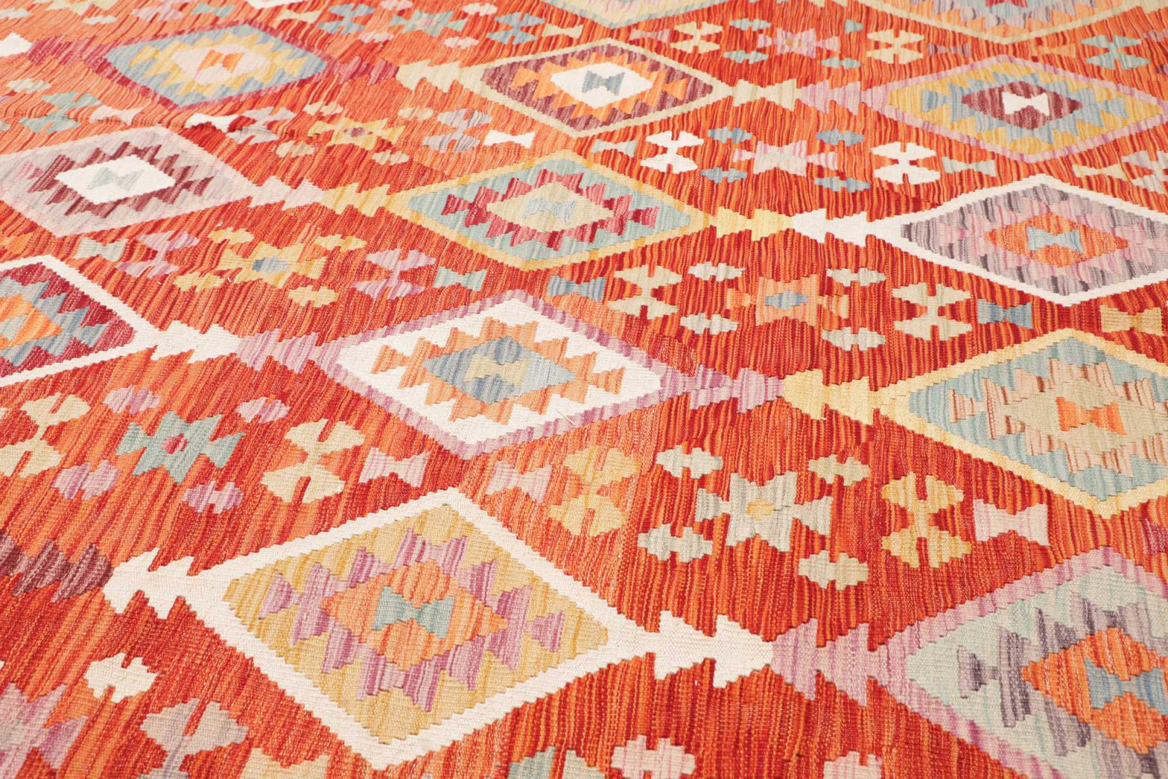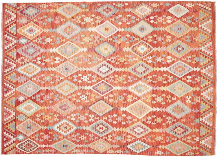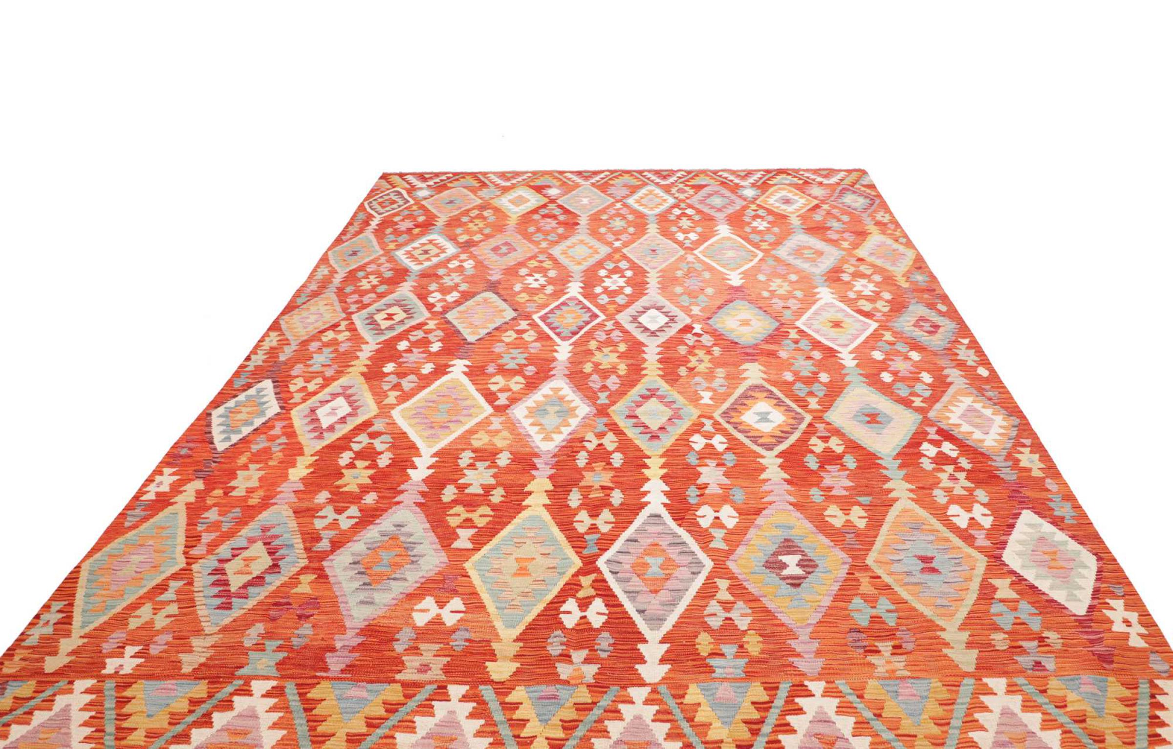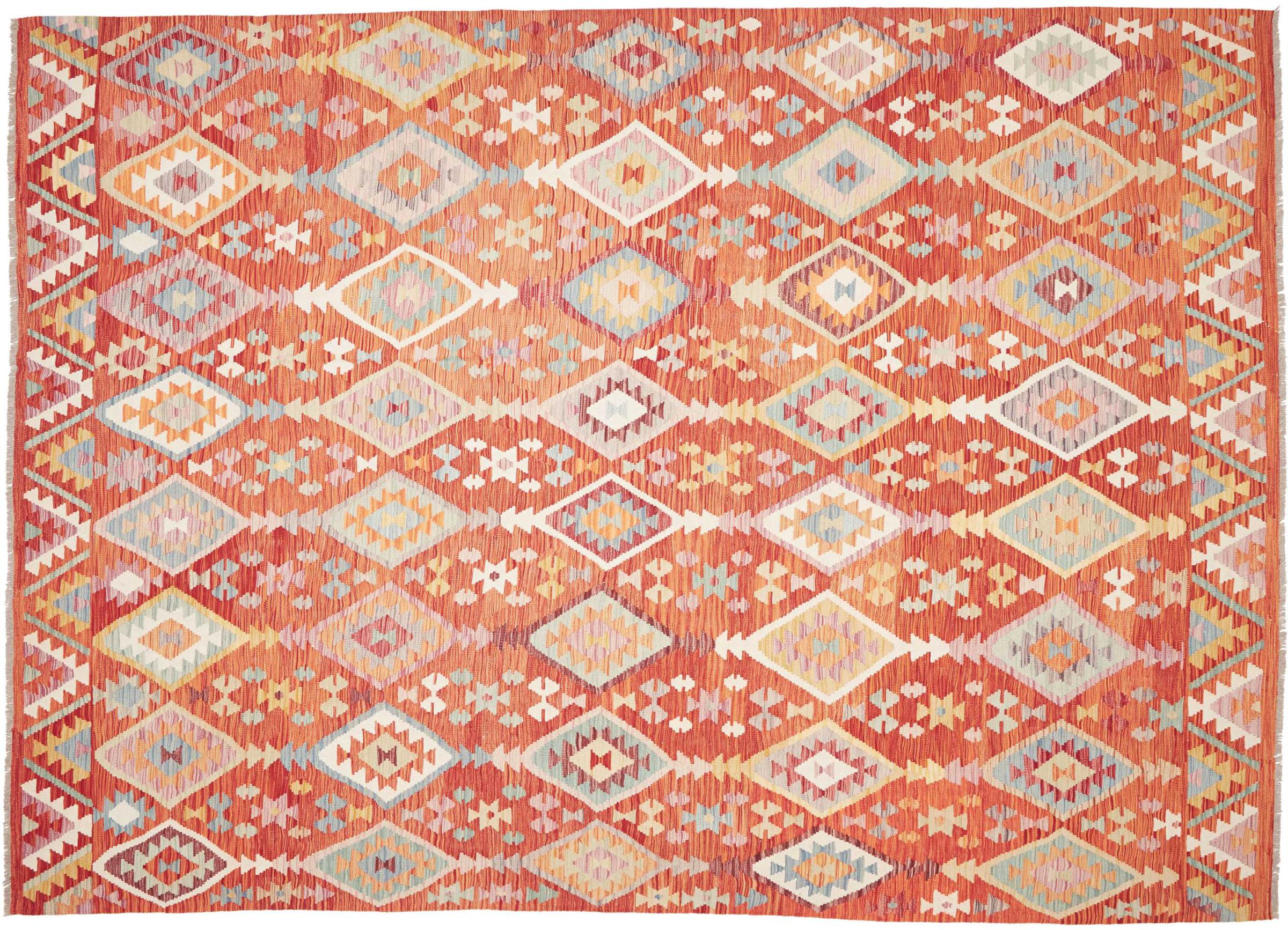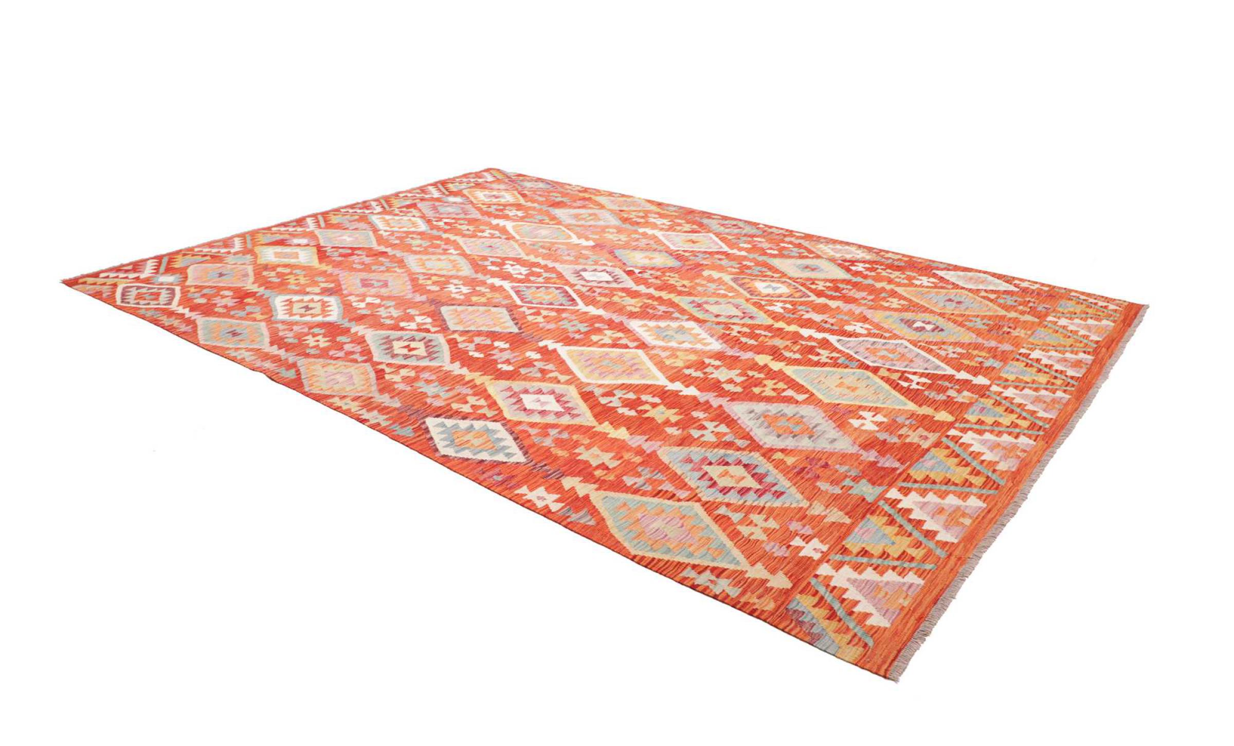 Estas alfombras kilim muestran una diferencia decisiva con las alfombras anudadas a mano - son tejidas a mano. Por lo tanto, no tienen un montón alto de lana y son a menudo más planos y más ásperos que las alfombras de lana anudada. Su fabricación es menos elaborada y por eso suelen ser mucho más baratas. Como ventaja, las alfombras de kilim son también mucho más ligeras y pueden ser colocadas por delante y por detrás. Los kilims tejidos a mano provienen originalmente de la antigua Persia y ahora también se fabrican a menudo en el Afganistán. Tienen patrones bastante simples y directos, que se deben a su técnica de tejido.