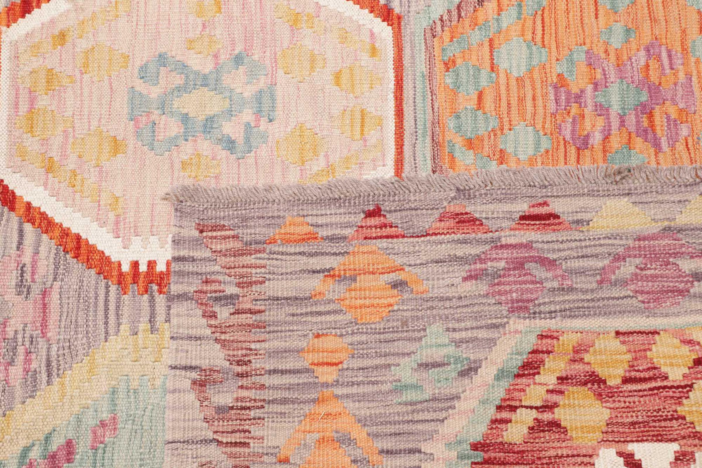 Estas alfombras kilim muestran una diferencia decisiva con las alfombras anudadas a mano - son tejidas a mano. Por lo tanto, no tienen un montón alto de lana y son a menudo más planos y más ásperos que las alfombras de lana anudada. Su fabricación es menos elaborada y por eso suelen ser mucho más baratas. Como ventaja, las alfombras de kilim son también mucho más ligeras y pueden ser colocadas por delante y por detrás. Los kilims tejidos a mano provienen originalmente de la antigua Persia y ahora también se fabrican a menudo en el Afganistán. Tienen patrones bastante simples y directos, que se deben a su técnica de tejido.