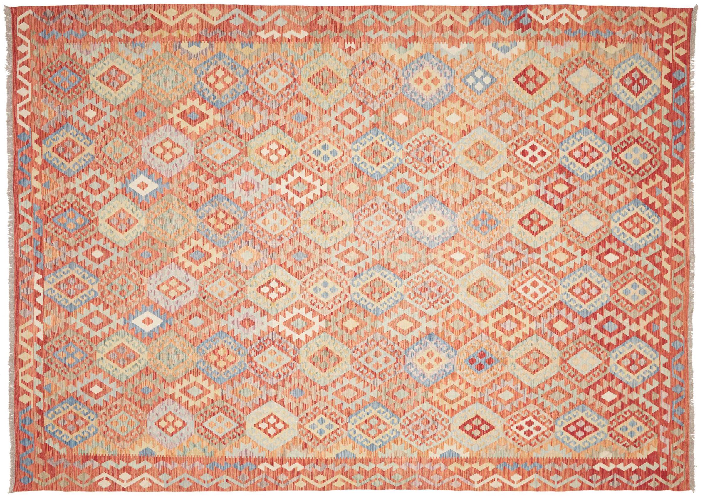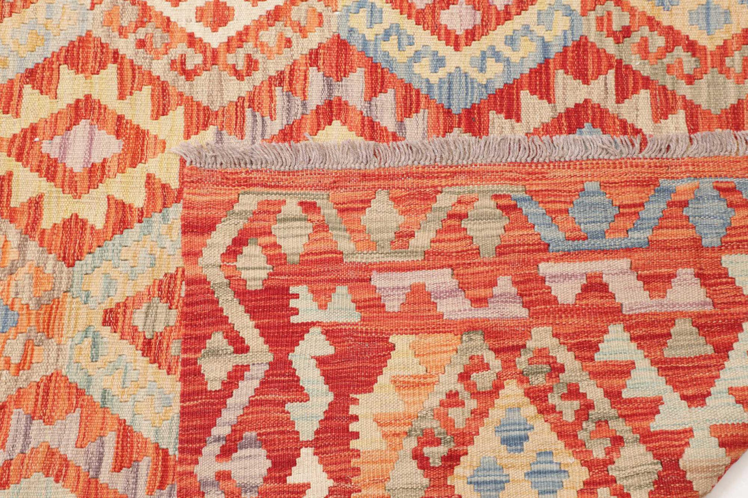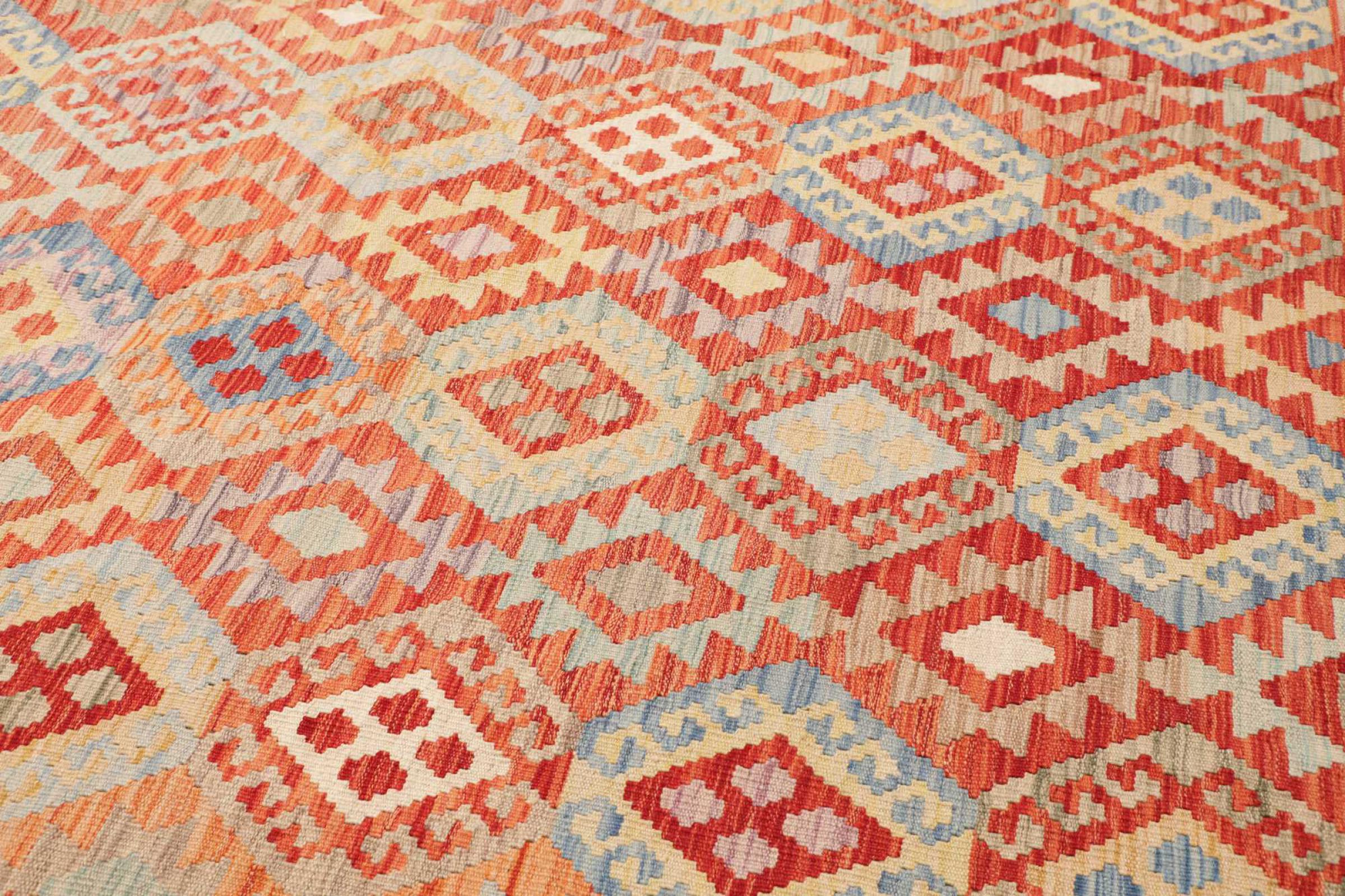 Estas alfombras kilim muestran una diferencia decisiva con las alfombras anudadas a mano - son tejidas a mano. Por lo tanto, no tienen un montón alto de lana y son a menudo más planos y más ásperos que las alfombras de lana anudada. Su fabricación es menos elaborada y por eso suelen ser mucho más baratas. Como ventaja, las alfombras de kilim son también mucho más ligeras y pueden ser colocadas por delante y por detrás. Los kilims tejidos a mano provienen originalmente de la antigua Persia y ahora también se fabrican a menudo en el Afganistán. Tienen patrones bastante simples y directos, que se deben a su técnica de tejido.