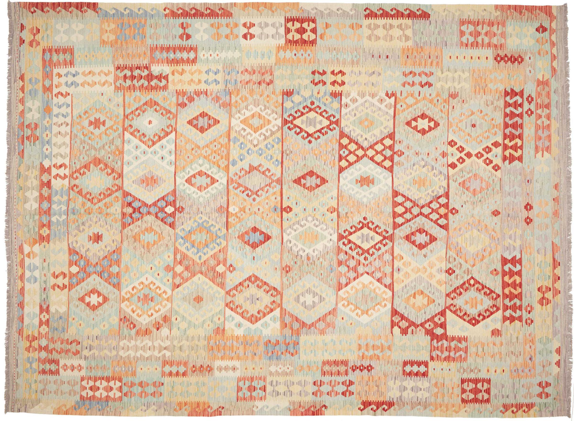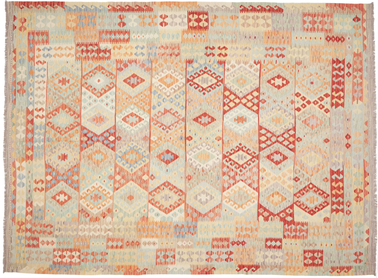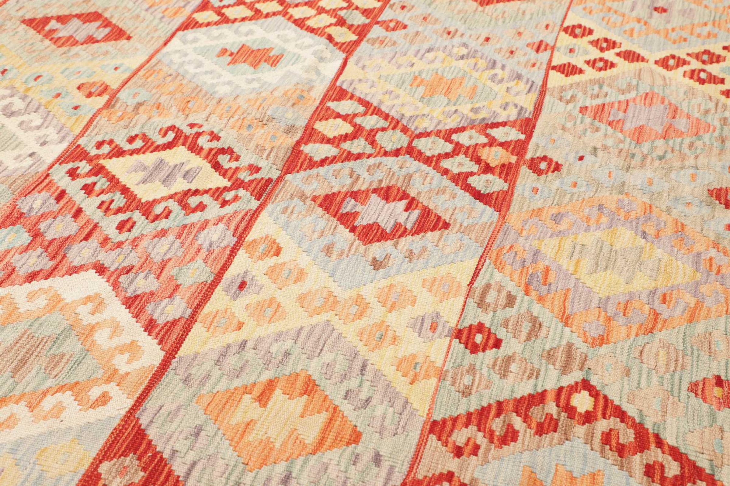 Estas alfombras kilim muestran una diferencia decisiva con las alfombras anudadas a mano - son tejidas a mano. Por lo tanto, no tienen un montón alto de lana y son a menudo más planos y más ásperos que las alfombras de lana anudada. Su fabricación es menos elaborada y por eso suelen ser mucho más baratas. Como ventaja, las alfombras de kilim son también mucho más ligeras y pueden ser colocadas por delante y por detrás. Los kilims tejidos a mano provienen originalmente de la antigua Persia y ahora también se fabrican a menudo en el Afganistán. Tienen patrones bastante simples y directos, que se deben a su técnica de tejido.