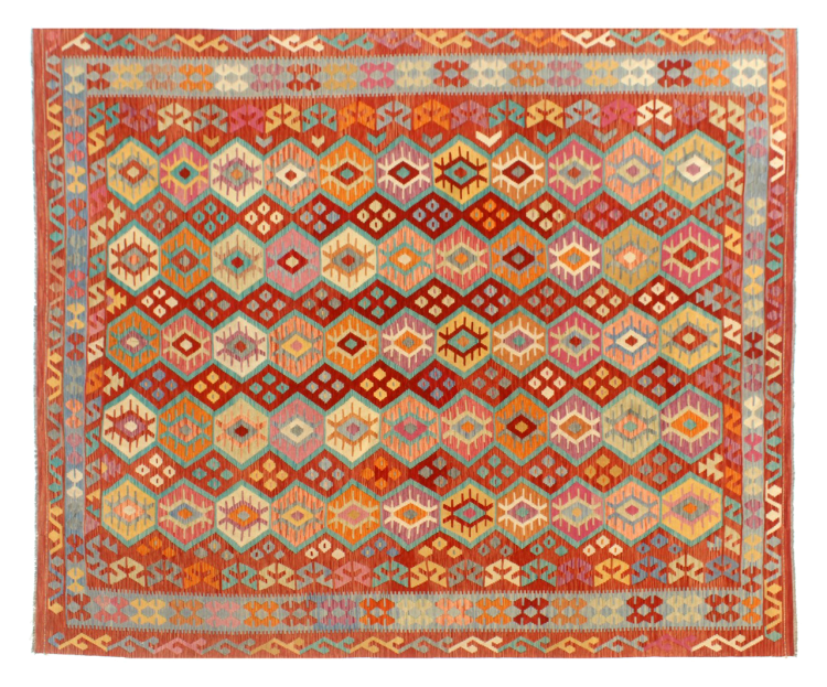 Estas alfombras kilim muestran una diferencia decisiva con las alfombras anudadas a mano - son tejidas a mano. Por lo tanto, no tienen un montón alto de lana y son a menudo más planos y más ásperos que las alfombras de lana anudada. Su fabricación es menos elaborada y por eso suelen ser mucho más baratas. Como ventaja, las alfombras de kilim son también mucho más ligeras y pueden ser colocadas por delante y por detrás. Los kilims tejidos a mano provienen originalmente de la antigua Persia y ahora también se fabrican a menudo en el Afganistán. Tienen patrones bastante simples y directos, que se deben a su técnica de tejido.