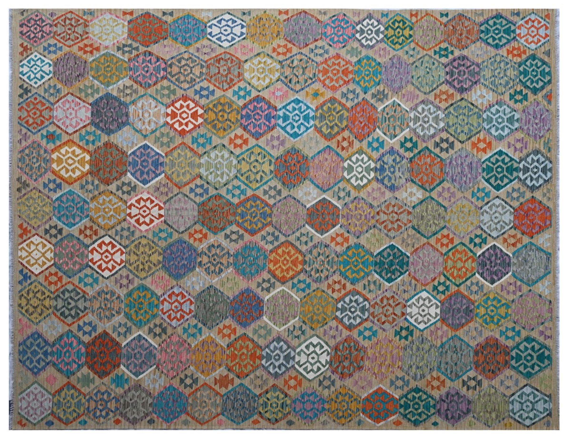 Estas alfombras kilim muestran una diferencia decisiva con las alfombras anudadas a mano - son tejidas a mano. Por lo tanto, no tienen un montón alto de lana y son a menudo más planos y más ásperos que las alfombras de lana anudada. Su fabricación es menos elaborada y por eso suelen ser mucho más baratas. Como ventaja, las alfombras de kilim son también mucho más ligeras y pueden ser colocadas por delante y por detrás. Los kilims tejidos a mano provienen originalmente de la antigua Persia y ahora también se fabrican a menudo en el Afganistán. Tienen patrones bastante simples y directos, que se deben a su técnica de tejido.