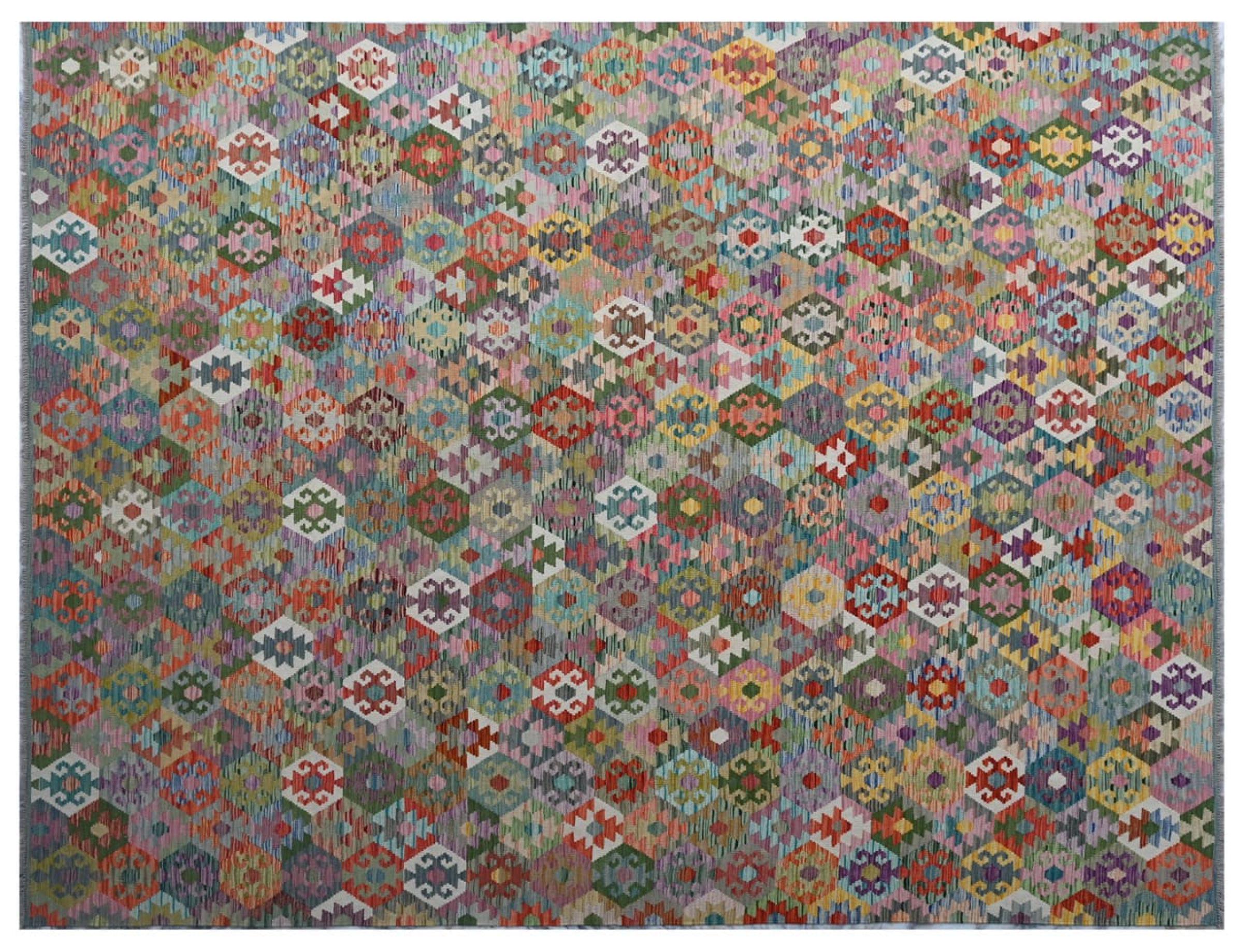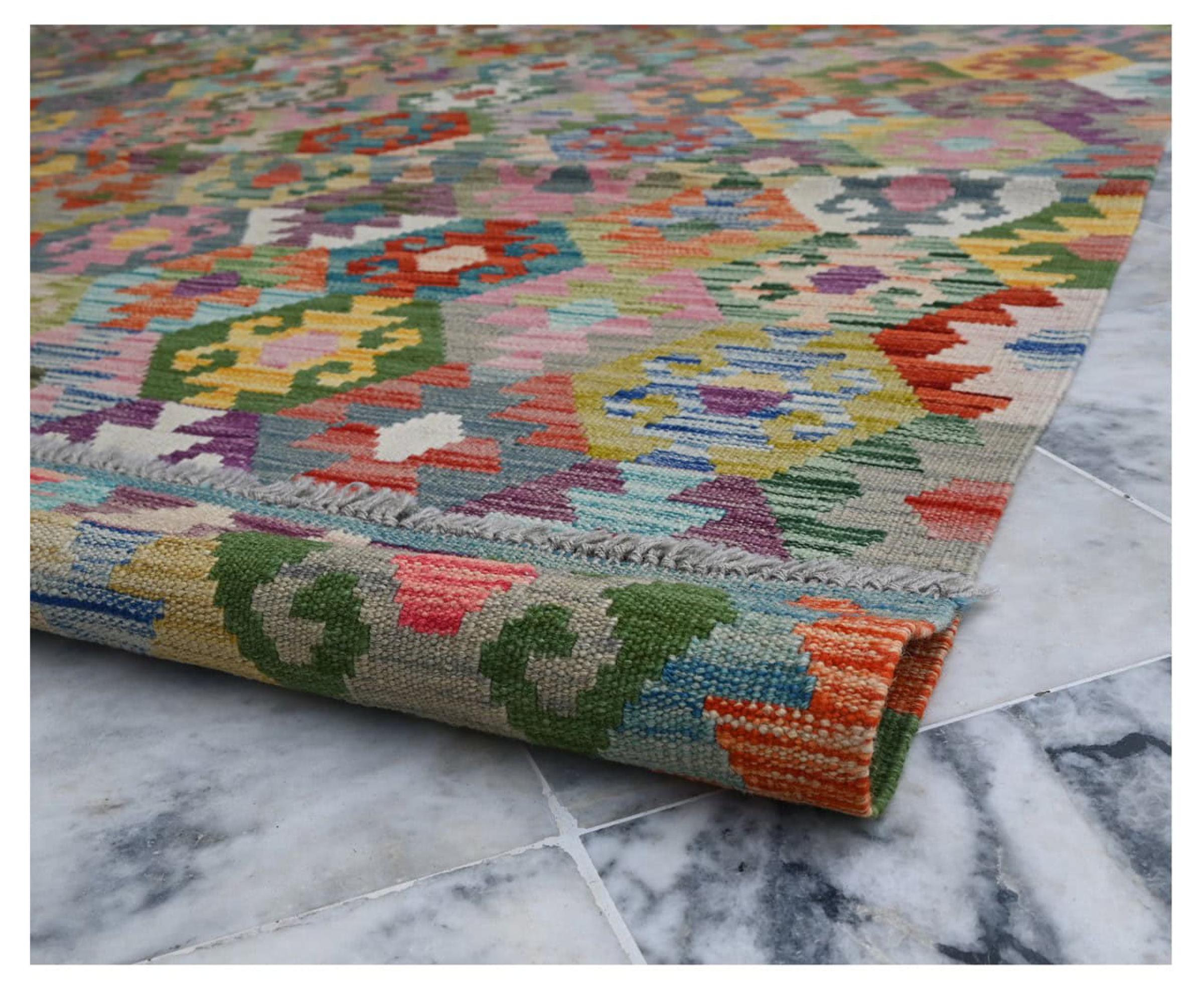 Estas alfombras kilim muestran una diferencia decisiva con las alfombras anudadas a mano - son tejidas a mano. Por lo tanto, no tienen un montón alto de lana y son a menudo más planos y más ásperos que las alfombras de lana anudada. Su fabricación es menos elaborada y por eso suelen ser mucho más baratas. Como ventaja, las alfombras de kilim son también mucho más ligeras y pueden ser colocadas por delante y por detrás. Los kilims tejidos a mano provienen originalmente de la antigua Persia y ahora también se fabrican a menudo en el Afganistán. Tienen patrones bastante simples y directos, que se deben a su técnica de tejido.