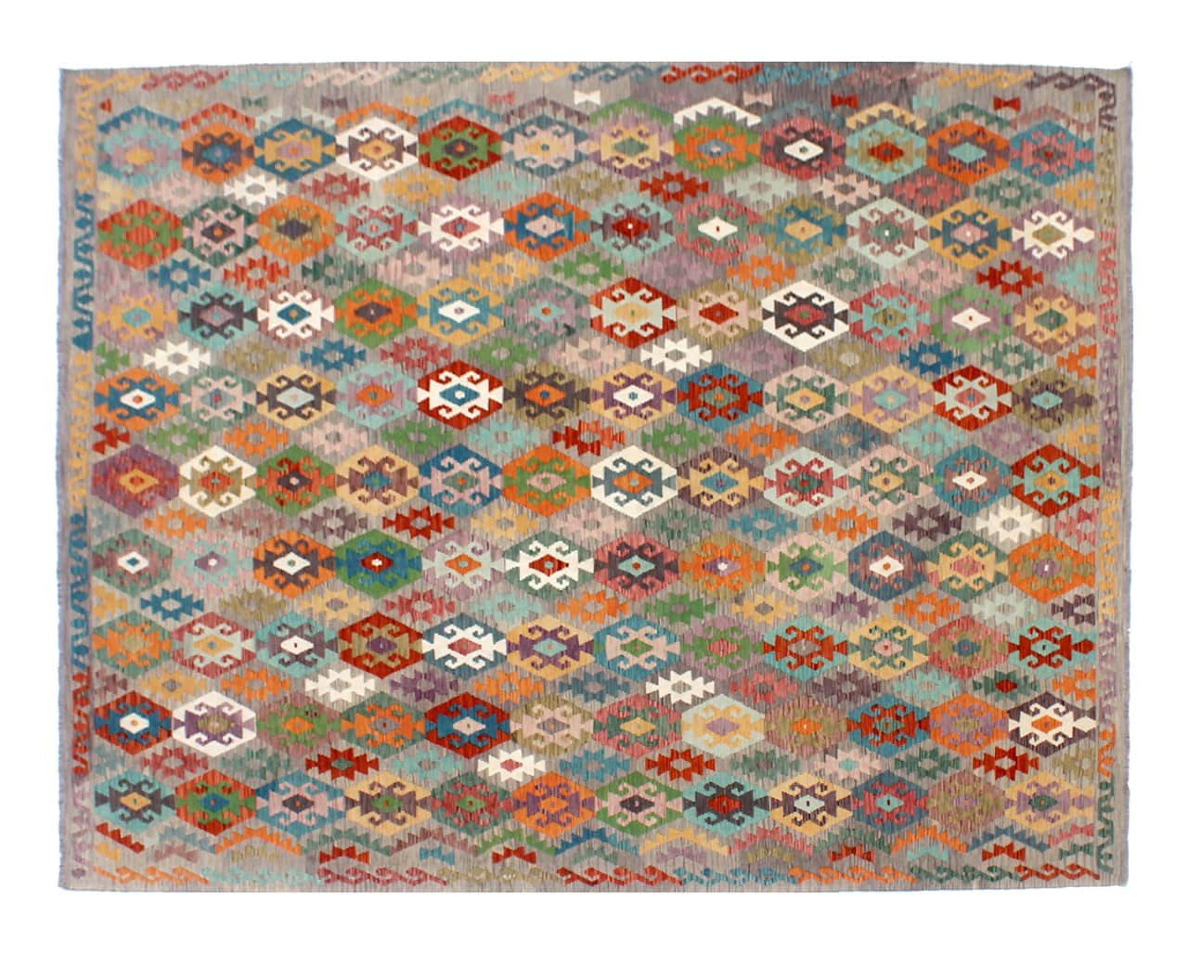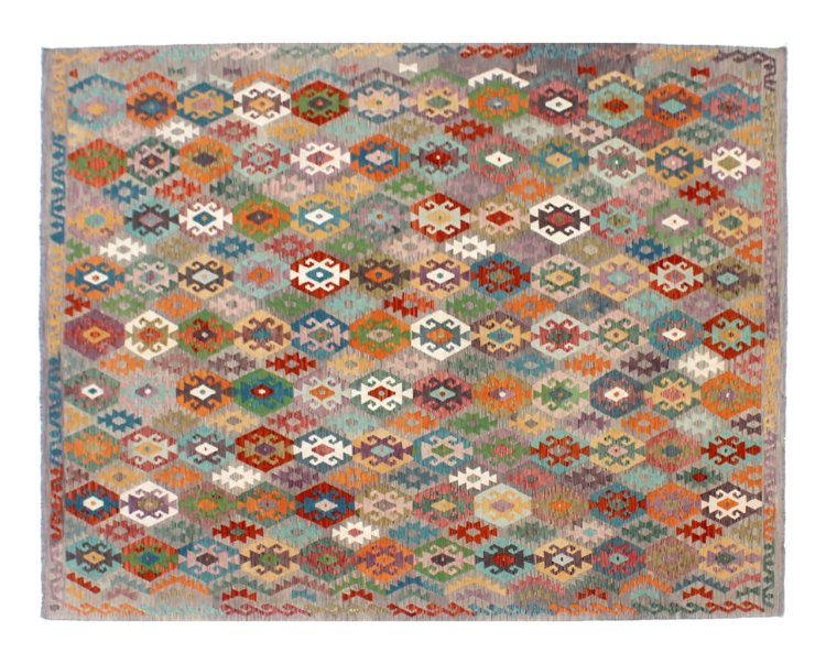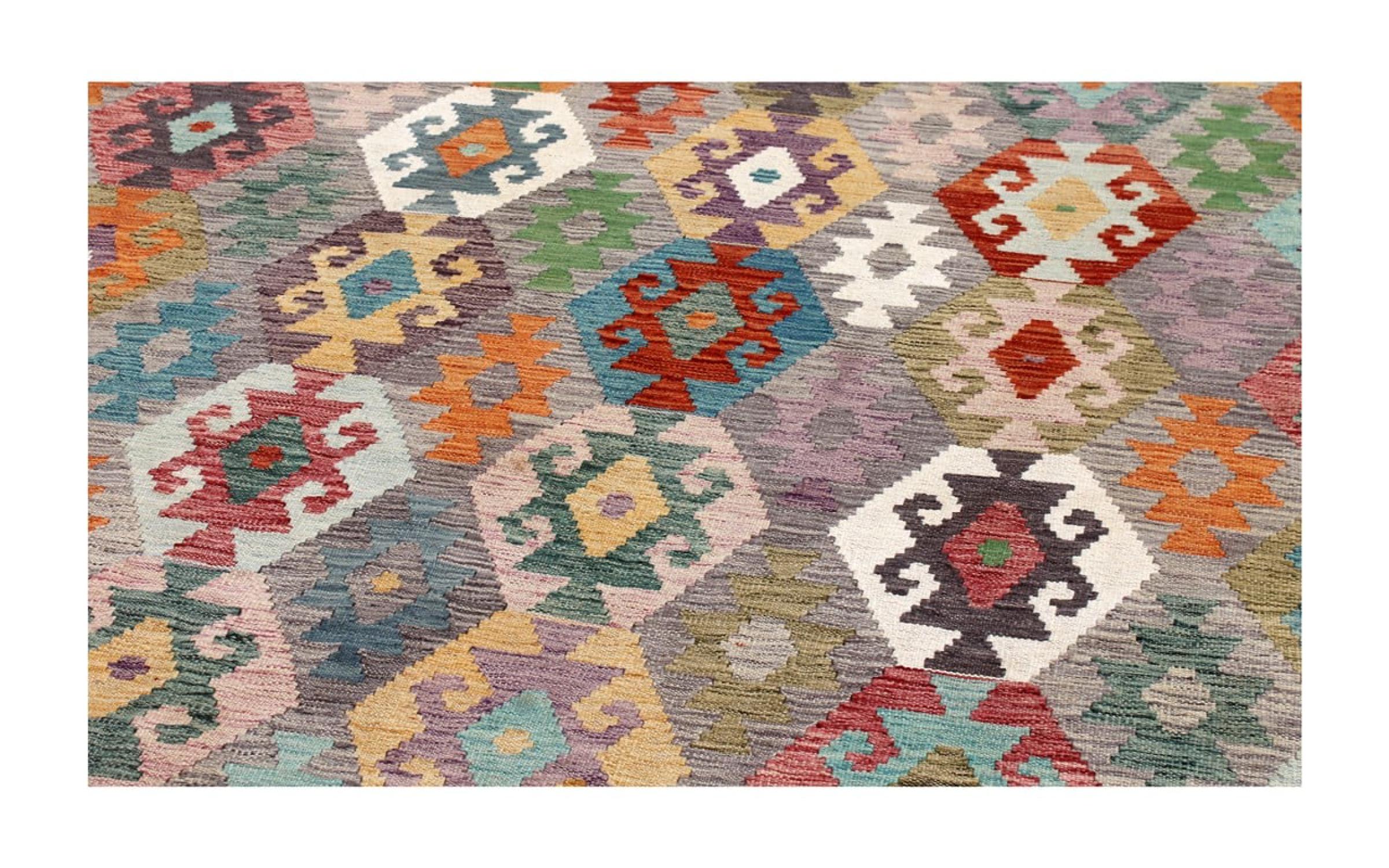 Estas alfombras kilim muestran una diferencia decisiva con las alfombras anudadas a mano - son tejidas a mano. Por lo tanto, no tienen un montón alto de lana y son a menudo más planos y más ásperos que las alfombras de lana anudada. Su fabricación es menos elaborada y por eso suelen ser mucho más baratas. Como ventaja, las alfombras de kilim son también mucho más ligeras y pueden ser colocadas por delante y por detrás. Los kilims tejidos a mano provienen originalmente de la antigua Persia y ahora también se fabrican a menudo en el Afganistán. Tienen patrones bastante simples y directos, que se deben a su técnica de tejido.