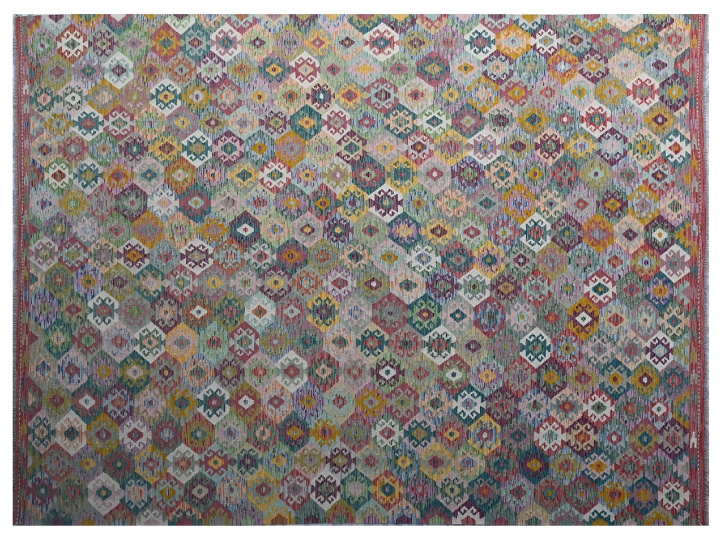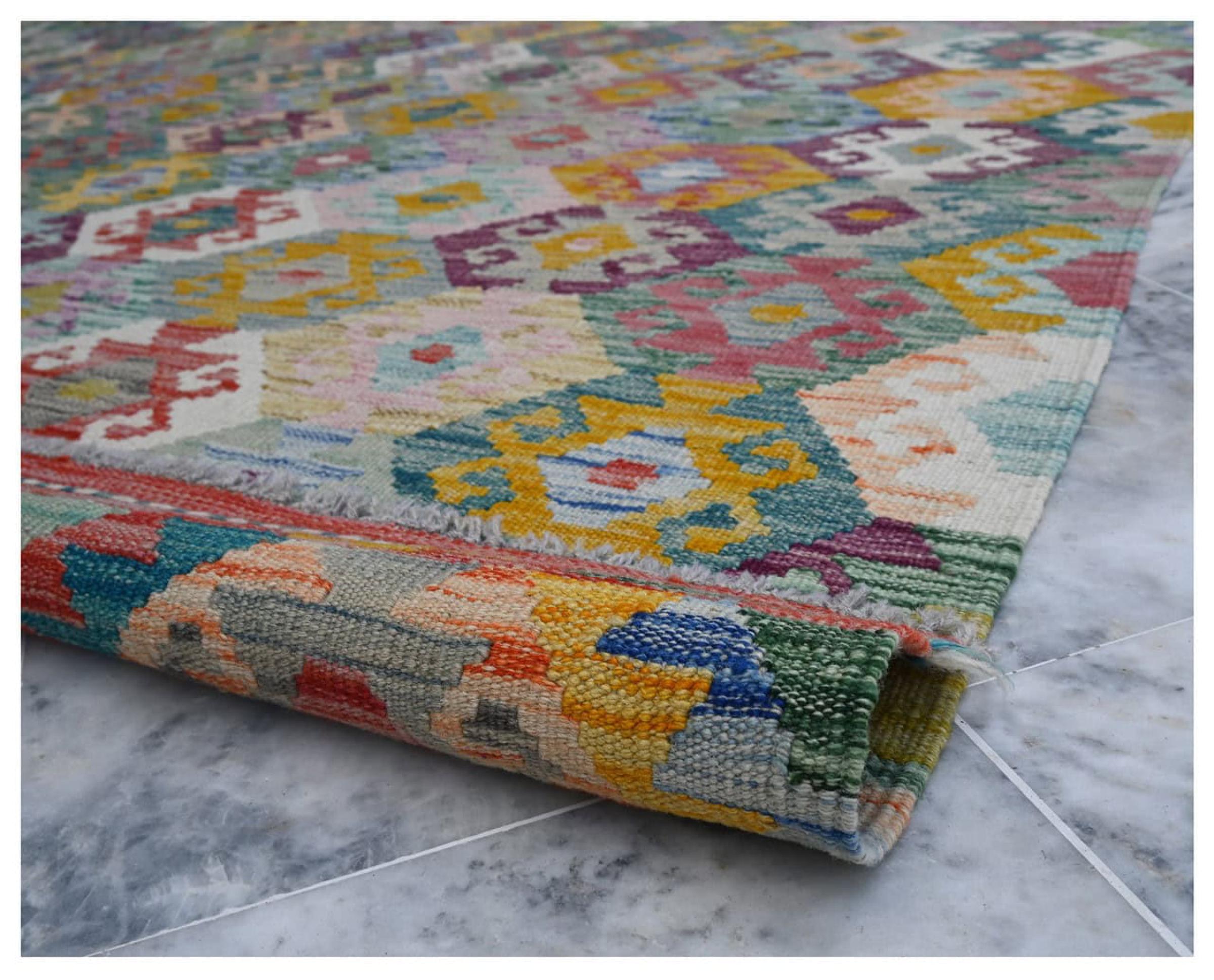 Estas alfombras kilim muestran una diferencia decisiva con las alfombras anudadas a mano - son tejidas a mano. Por lo tanto, no tienen un montón alto de lana y son a menudo más planos y más ásperos que las alfombras de lana anudada. Su fabricación es menos elaborada y por eso suelen ser mucho más baratas. Como ventaja, las alfombras de kilim son también mucho más ligeras y pueden ser colocadas por delante y por detrás. Los kilims tejidos a mano provienen originalmente de la antigua Persia y ahora también se fabrican a menudo en el Afganistán. Tienen patrones bastante simples y directos, que se deben a su técnica de tejido.