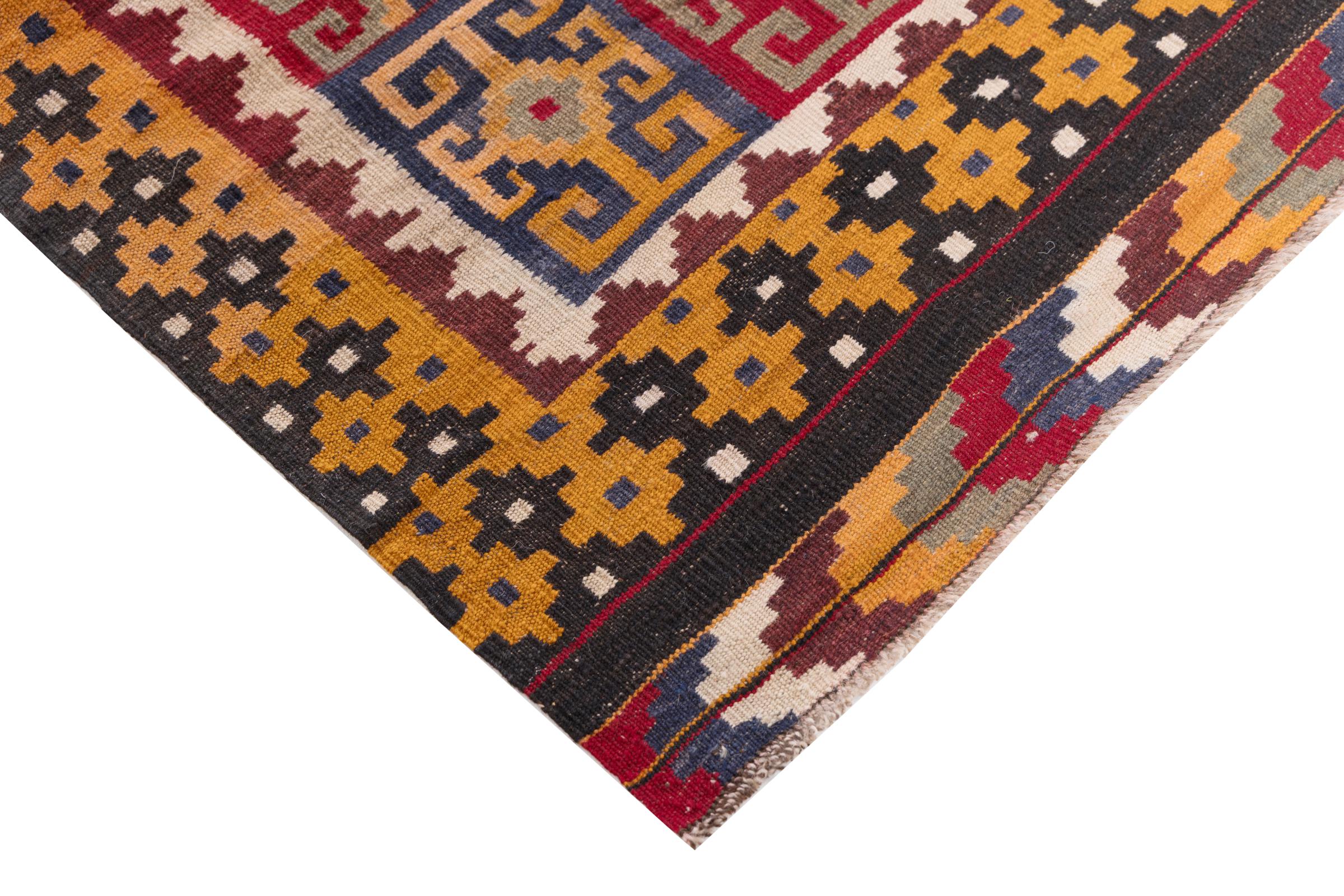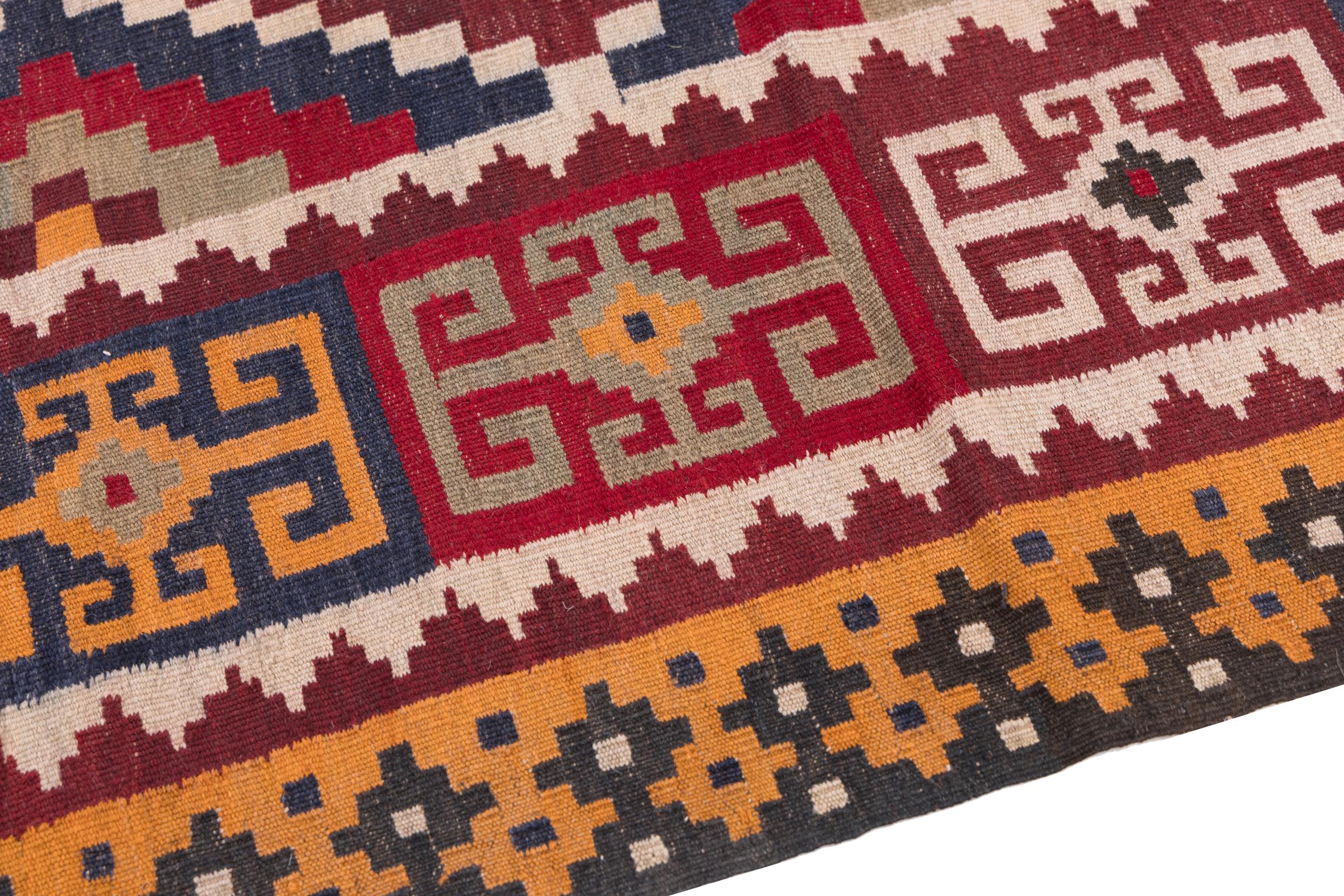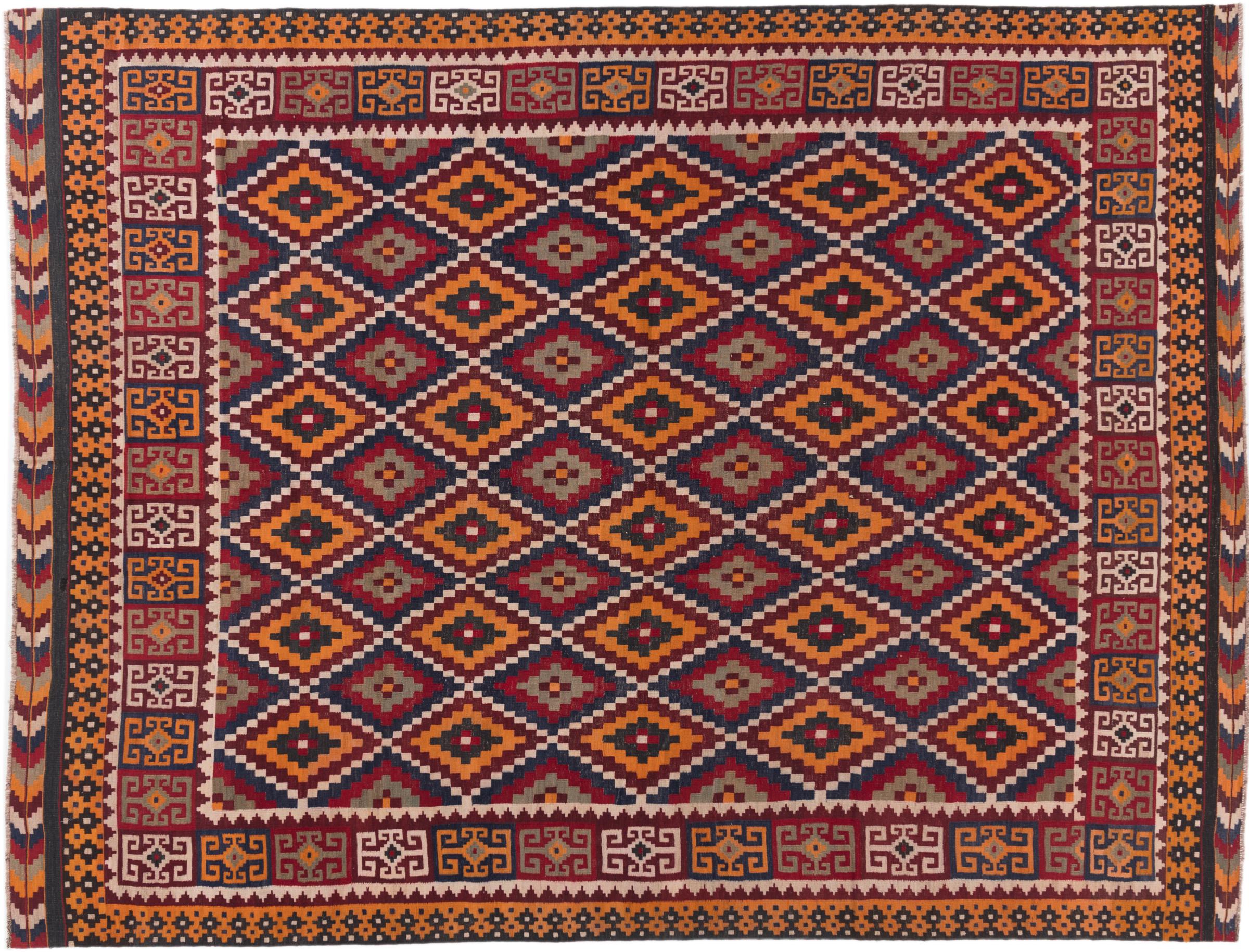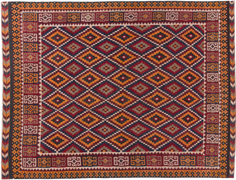 Esta alfombra fue hecha a mano en un telar como un tejido plano. Tejido plano es el término utilizado para describir las alfombras que no tienen pelo. Como el nombre promete, estas alfombras están tejidas y no anudadas. Esto resulta en una alfombra plana con una superficie estructurada. Los tejidos planos no son tan suaves y normalmente más delgados que las alfombras anudadas. Al mismo tiempo, su fabricación es mucho menos compleja y por lo general se pueden disponer por ambos lados (frontal y posterior). Sus patrones suelen ser geométricos, lo cual está determinado por el tejido.