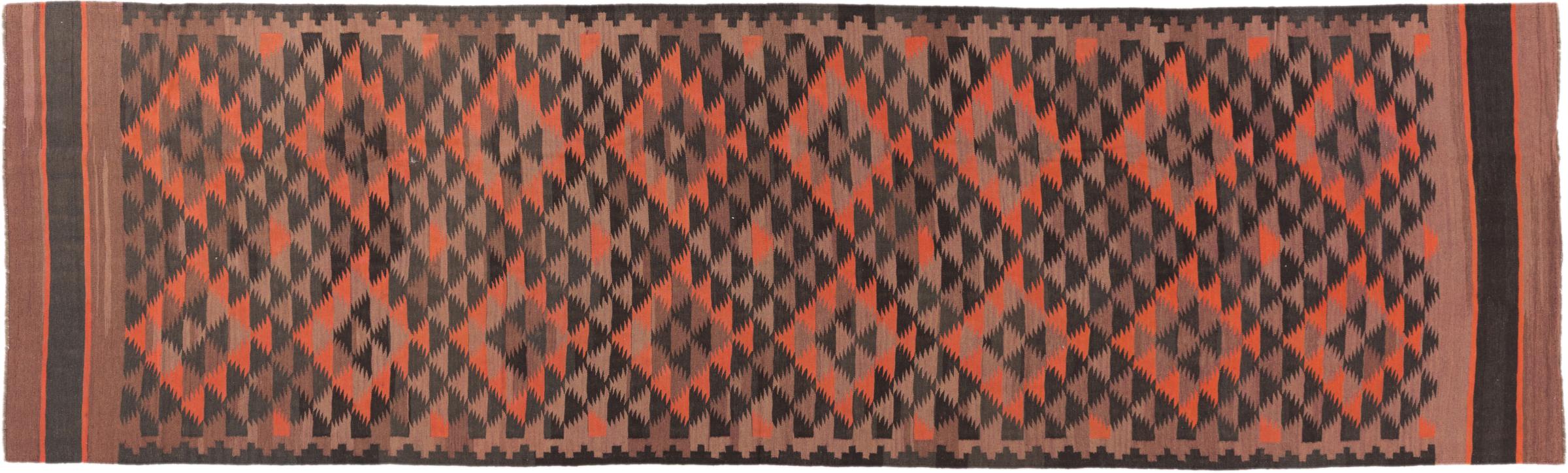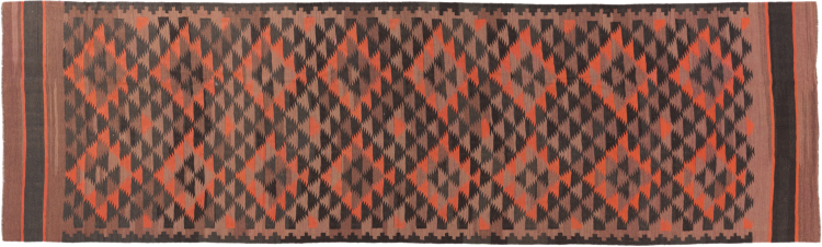 Esta alfombra fue hecha a mano en un telar como un tejido plano. Tejido plano es el término utilizado para describir las alfombras que no tienen pelo. Como el nombre promete, estas alfombras están tejidas y no anudadas. Esto resulta en una alfombra plana con una superficie estructurada. Los tejidos planos no son tan suaves y normalmente más delgados que las alfombras anudadas. Al mismo tiempo, su fabricación es mucho menos compleja y por lo general se pueden disponer por ambos lados (frontal y posterior). Sus patrones suelen ser geométricos, lo cual está determinado por el tejido.