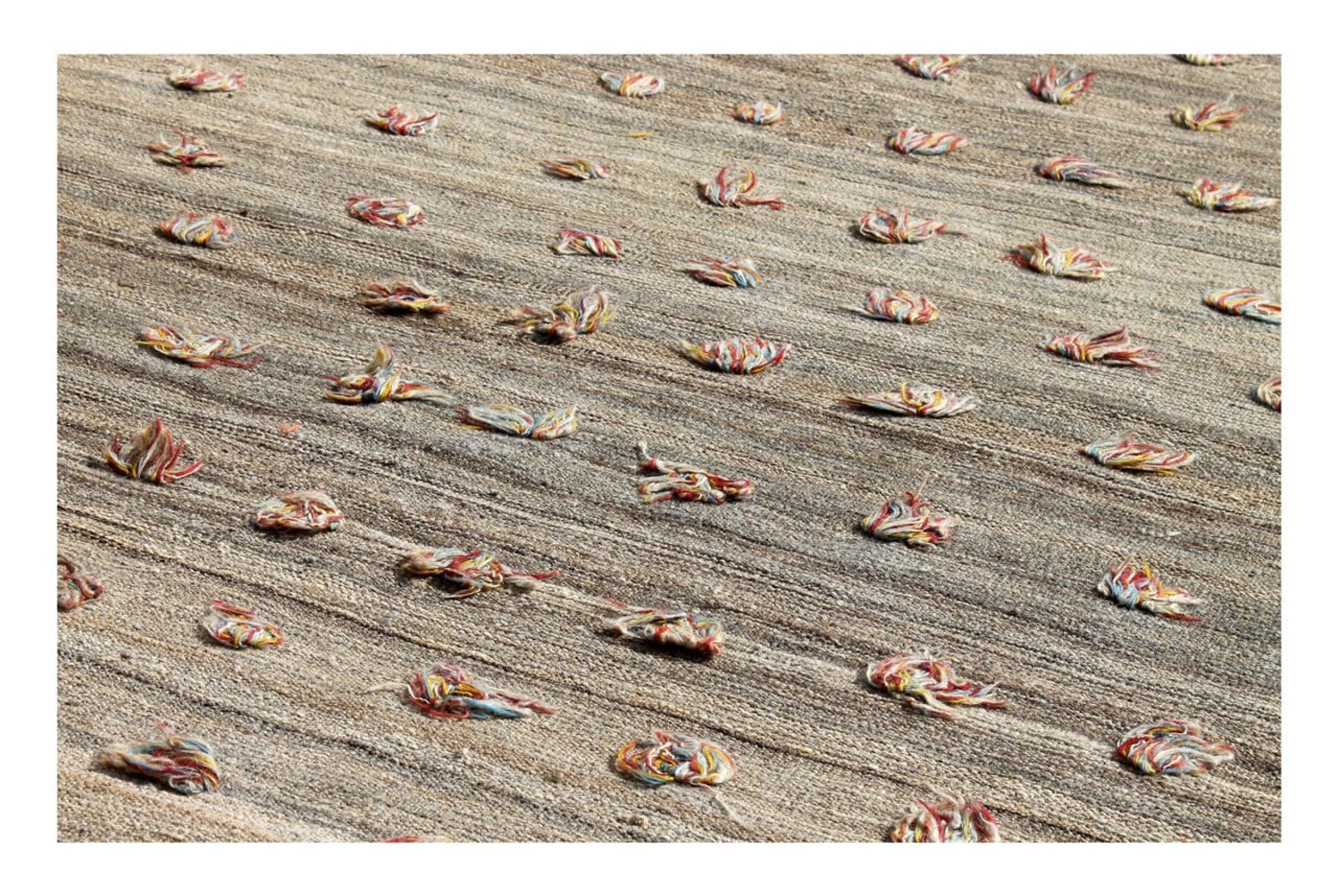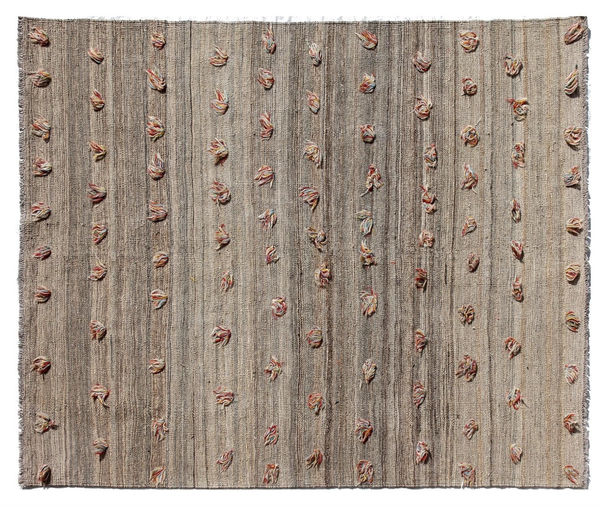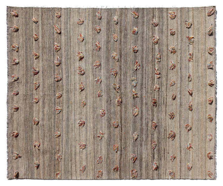 Esta alfombra fue hecha a mano en un telar como un tejido plano. Tejido plano es el término utilizado para describir las alfombras que no tienen pelo. Como el nombre promete, estas alfombras están tejidas y no anudadas. Esto resulta en una alfombra plana con una superficie estructurada. Los tejidos planos no son tan suaves y normalmente más delgados que las alfombras anudadas. Al mismo tiempo, su fabricación es mucho menos compleja y por lo general se pueden disponer por ambos lados (frontal y posterior). Sus patrones suelen ser geométricos, lo cual está determinado por el tejido.