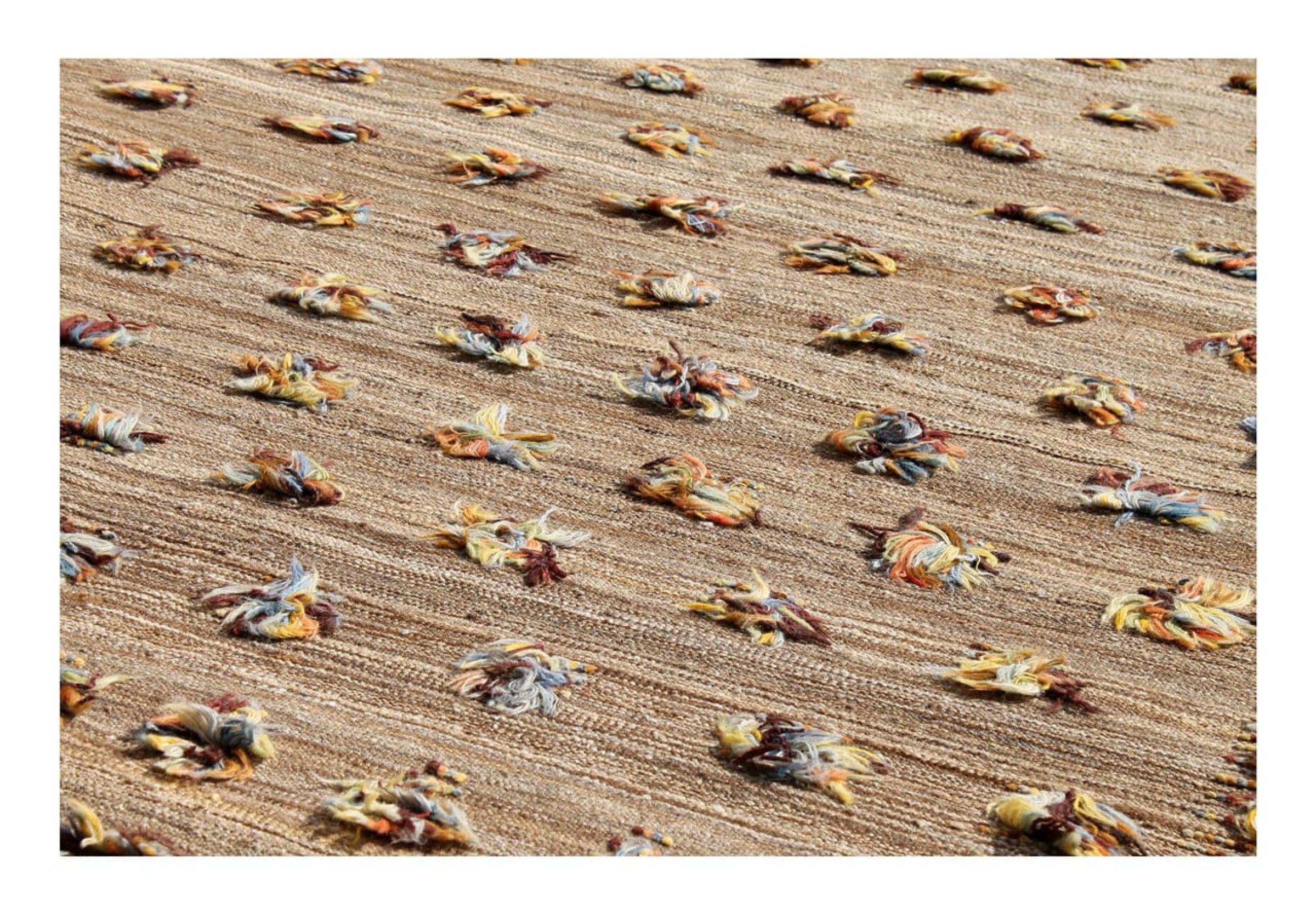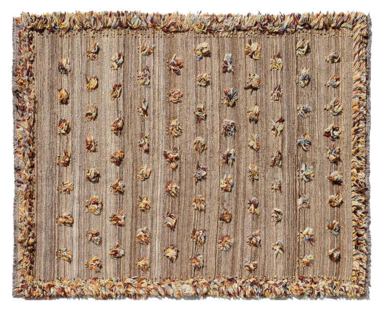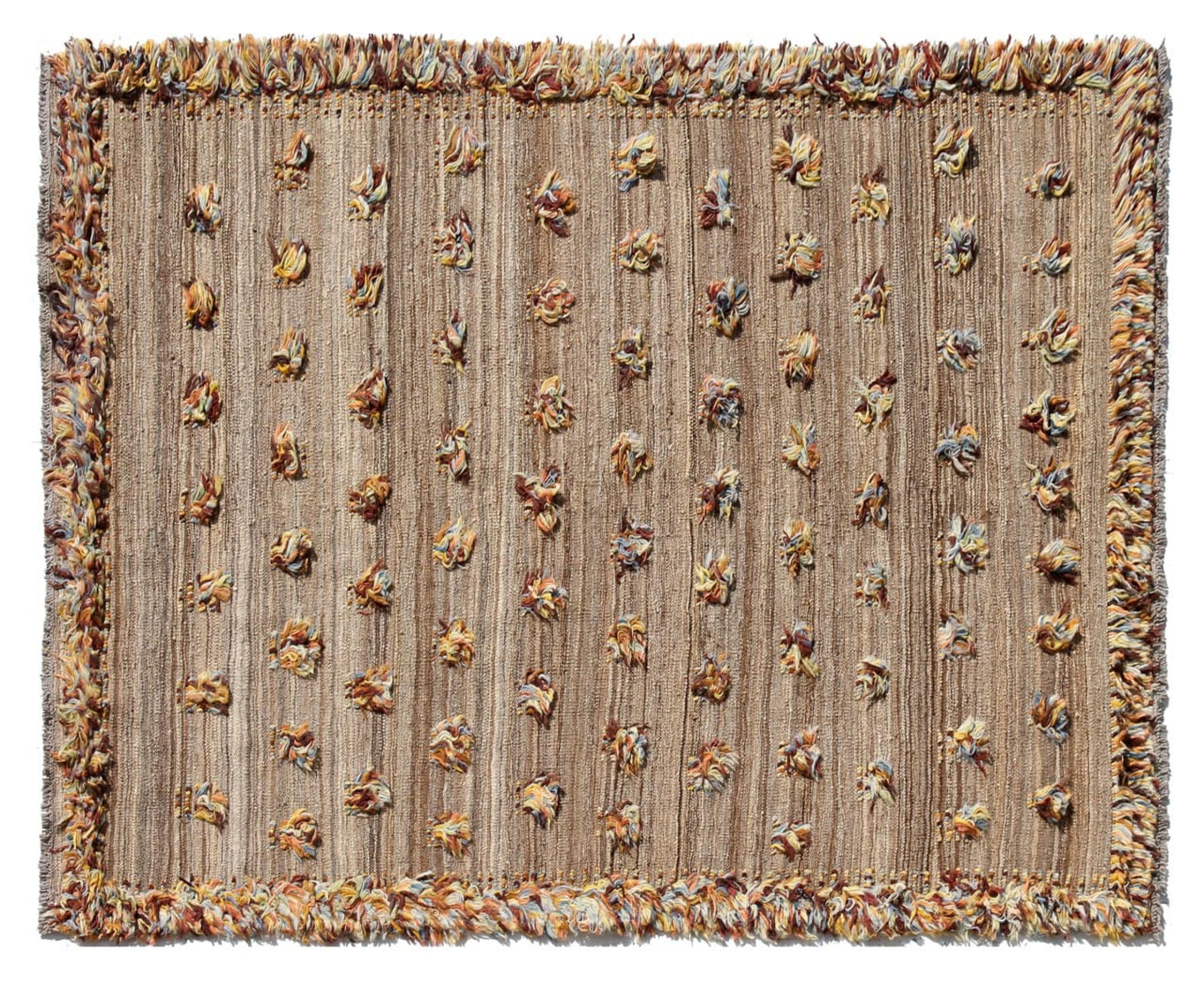Esta alfombra fue hecha a mano en un telar como un tejido plano. Tejido plano es el término utilizado para describir las alfombras que no tienen pelo. Como el nombre promete, estas alfombras están tejidas y no anudadas. Esto resulta en una alfombra plana con una superficie estructurada. Los tejidos planos no son tan suaves y normalmente más delgados que las alfombras anudadas. Al mismo tiempo, su fabricación es mucho menos compleja y por lo general se pueden disponer por ambos lados (frontal y posterior). Sus patrones suelen ser geométricos, lo cual está determinado por el tejido.