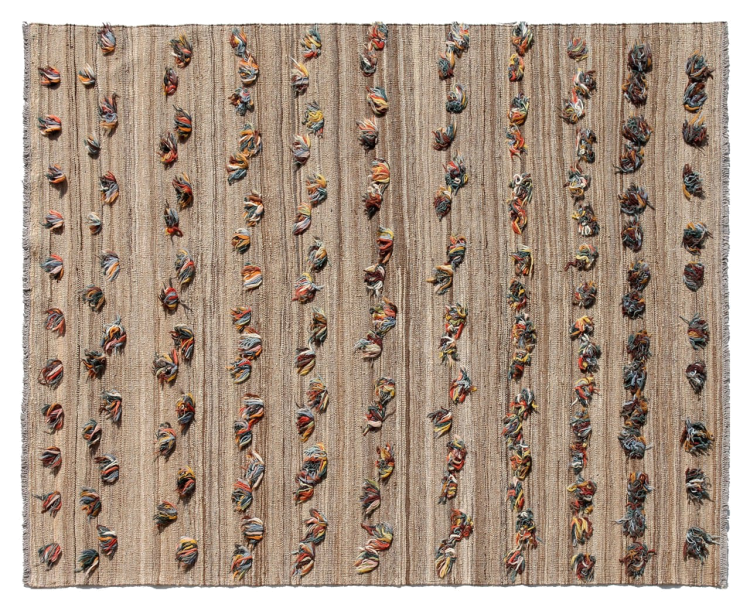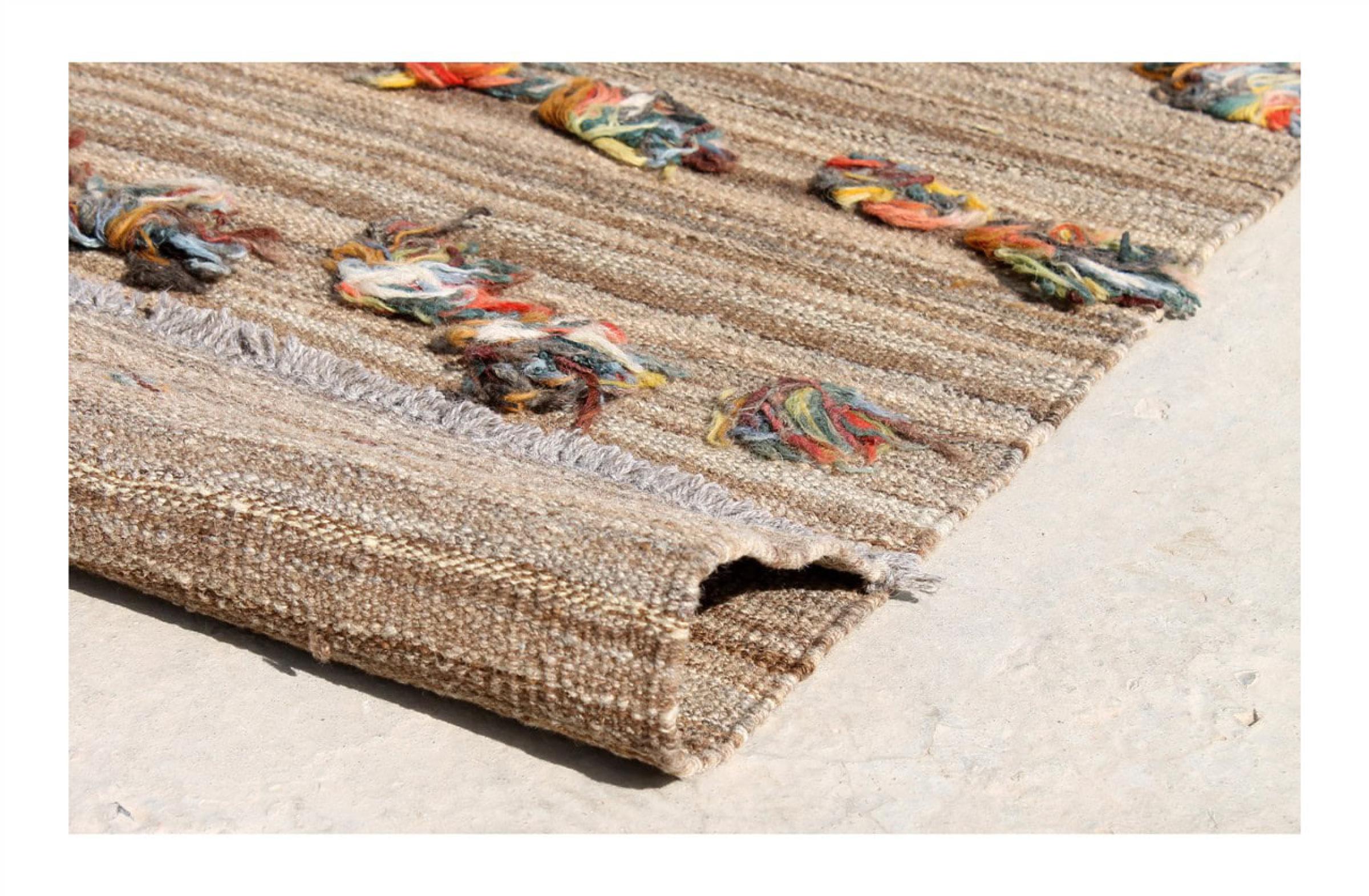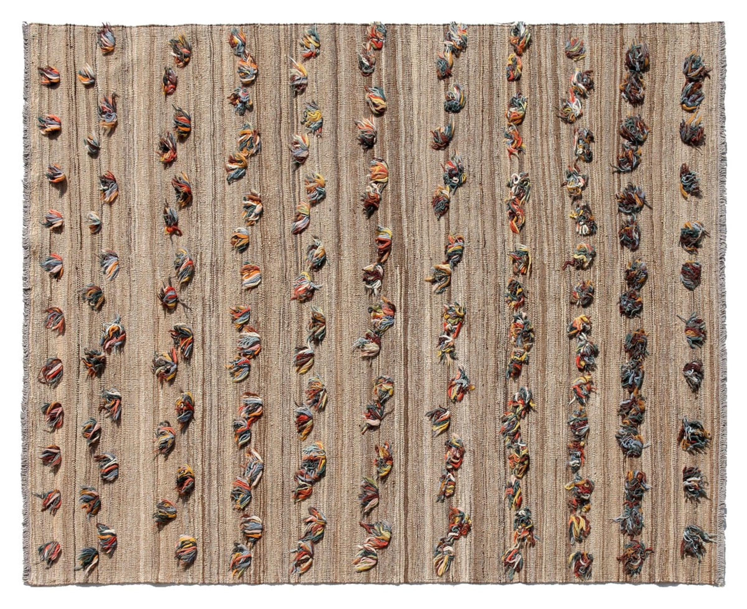 Esta alfombra fue hecha a mano en un telar como un tejido plano. Tejido plano es el término utilizado para describir las alfombras que no tienen pelo. Como el nombre promete, estas alfombras están tejidas y no anudadas. Esto resulta en una alfombra plana con una superficie estructurada. Los tejidos planos no son tan suaves y normalmente más delgados que las alfombras anudadas. Al mismo tiempo, su fabricación es mucho menos compleja y por lo general se pueden disponer por ambos lados (frontal y posterior). Sus patrones suelen ser geométricos, lo cual está determinado por el tejido.