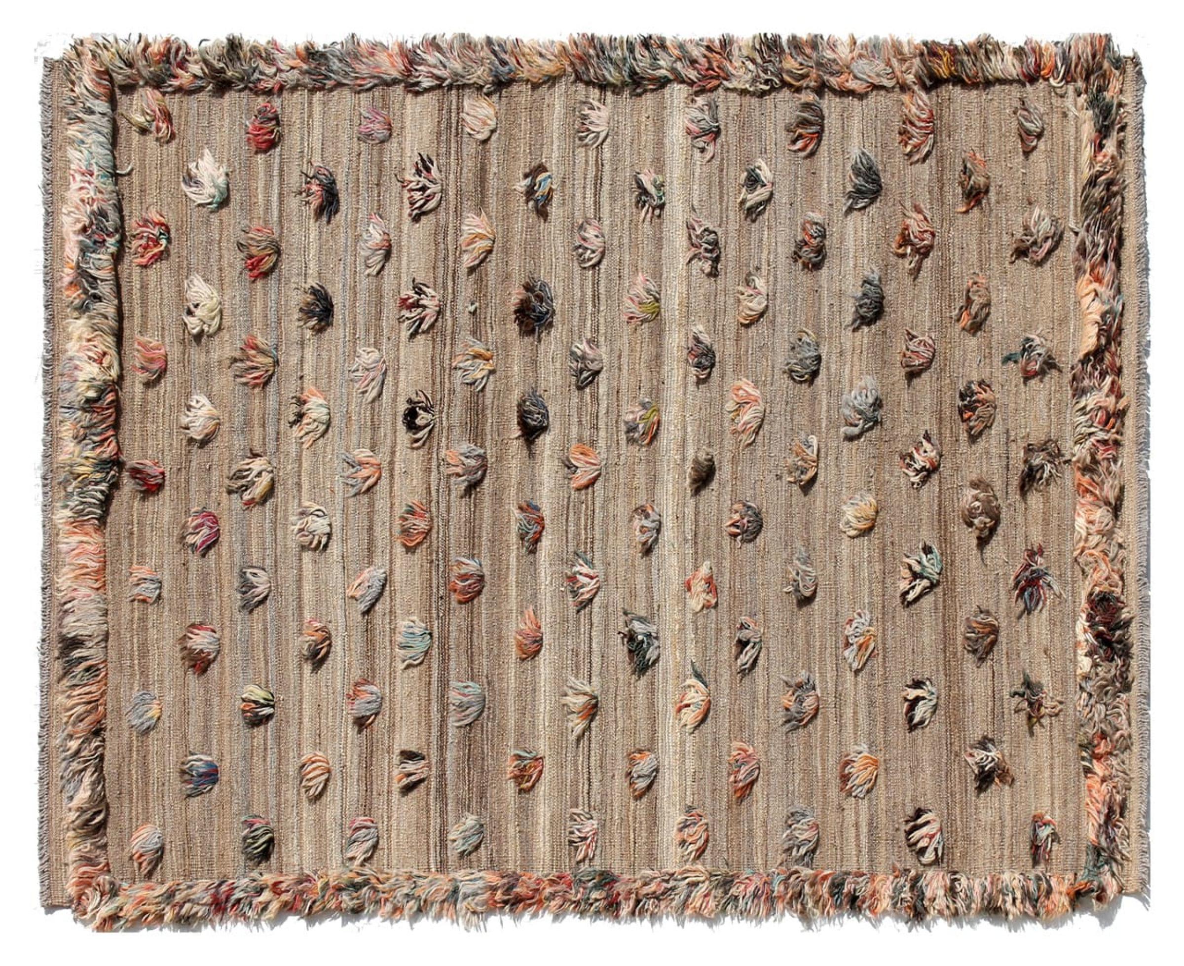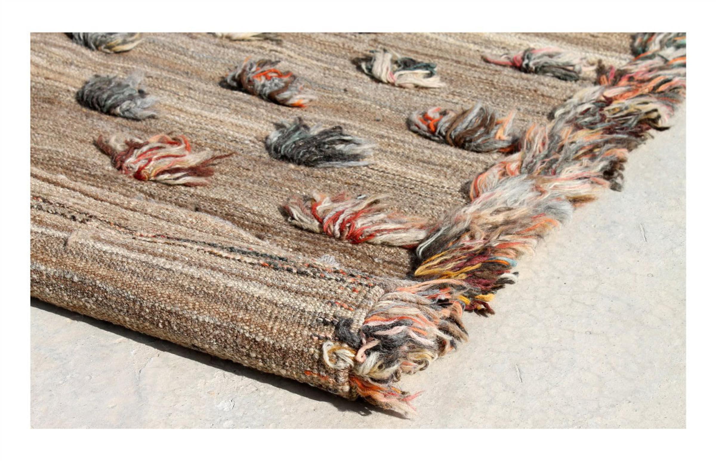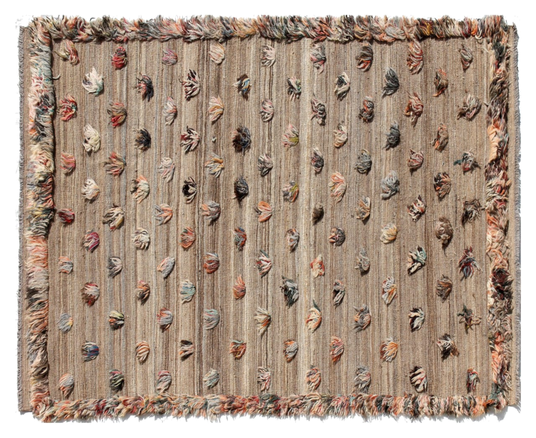 Esta alfombra fue hecha a mano en un telar como un tejido plano. Tejido plano es el término utilizado para describir las alfombras que no tienen pelo. Como el nombre promete, estas alfombras están tejidas y no anudadas. Esto resulta en una alfombra plana con una superficie estructurada. Los tejidos planos no son tan suaves y normalmente más delgados que las alfombras anudadas. Al mismo tiempo, su fabricación es mucho menos compleja y por lo general se pueden disponer por ambos lados (frontal y posterior). Sus patrones suelen ser geométricos, lo cual está determinado por el tejido.