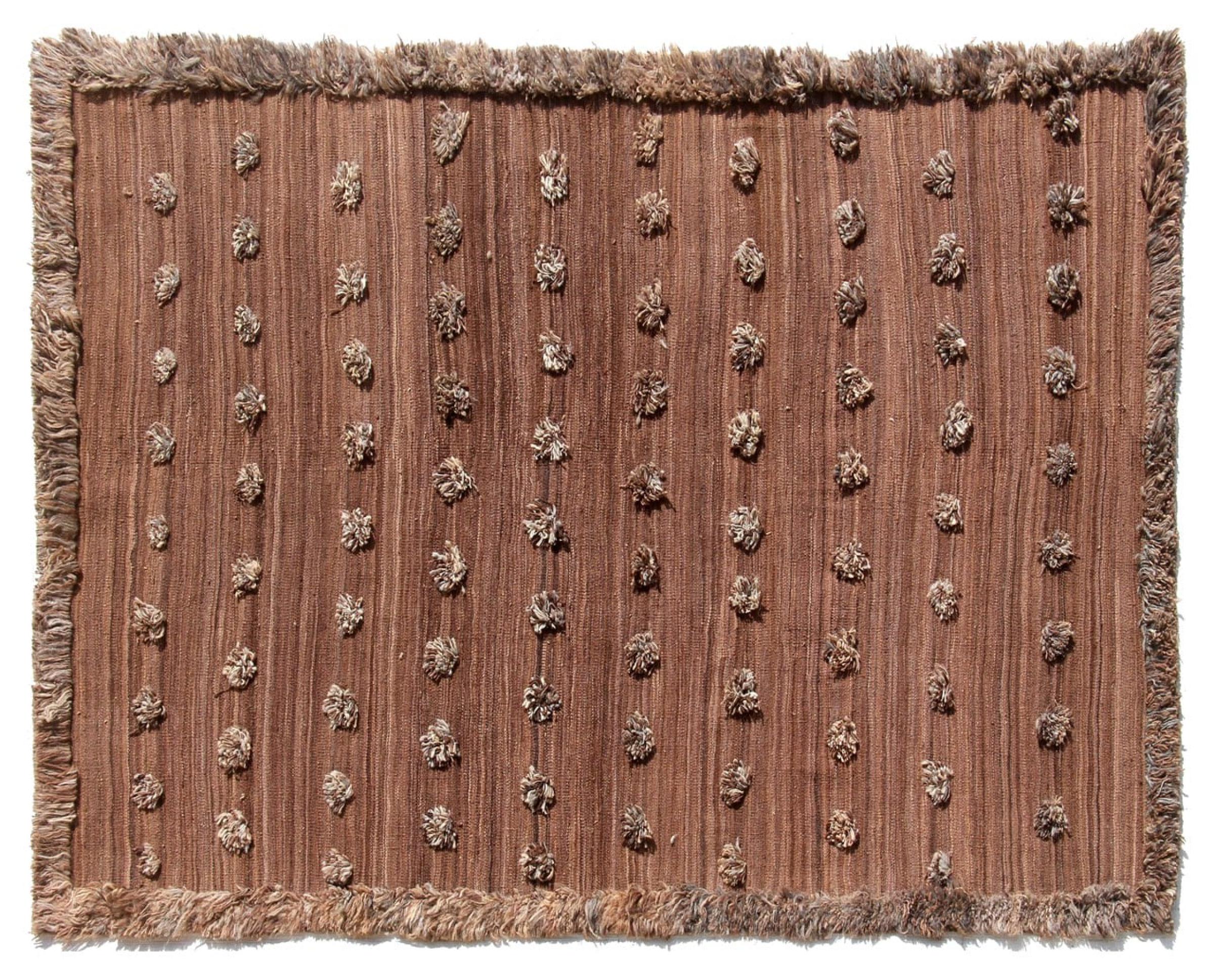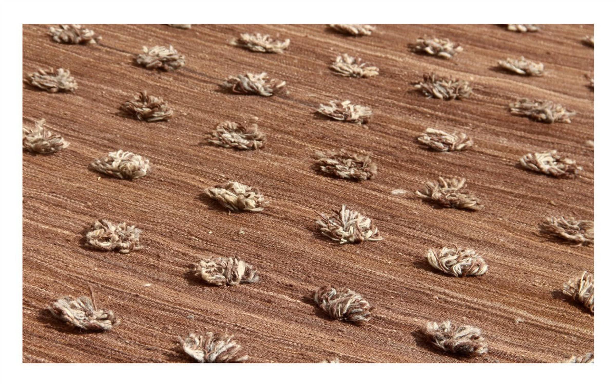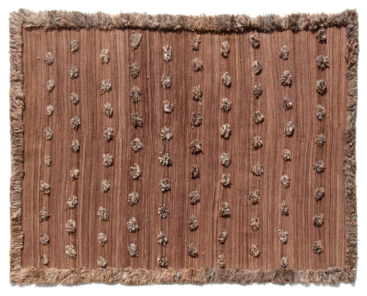 Esta alfombra fue hecha a mano en un telar como un tejido plano. Tejido plano es el término utilizado para describir las alfombras que no tienen pelo. Como el nombre promete, estas alfombras están tejidas y no anudadas. Esto resulta en una alfombra plana con una superficie estructurada. Los tejidos planos no son tan suaves y normalmente más delgados que las alfombras anudadas. Al mismo tiempo, su fabricación es mucho menos compleja y por lo general se pueden disponer por ambos lados (frontal y posterior). Sus patrones suelen ser geométricos, lo cual está determinado por el tejido.