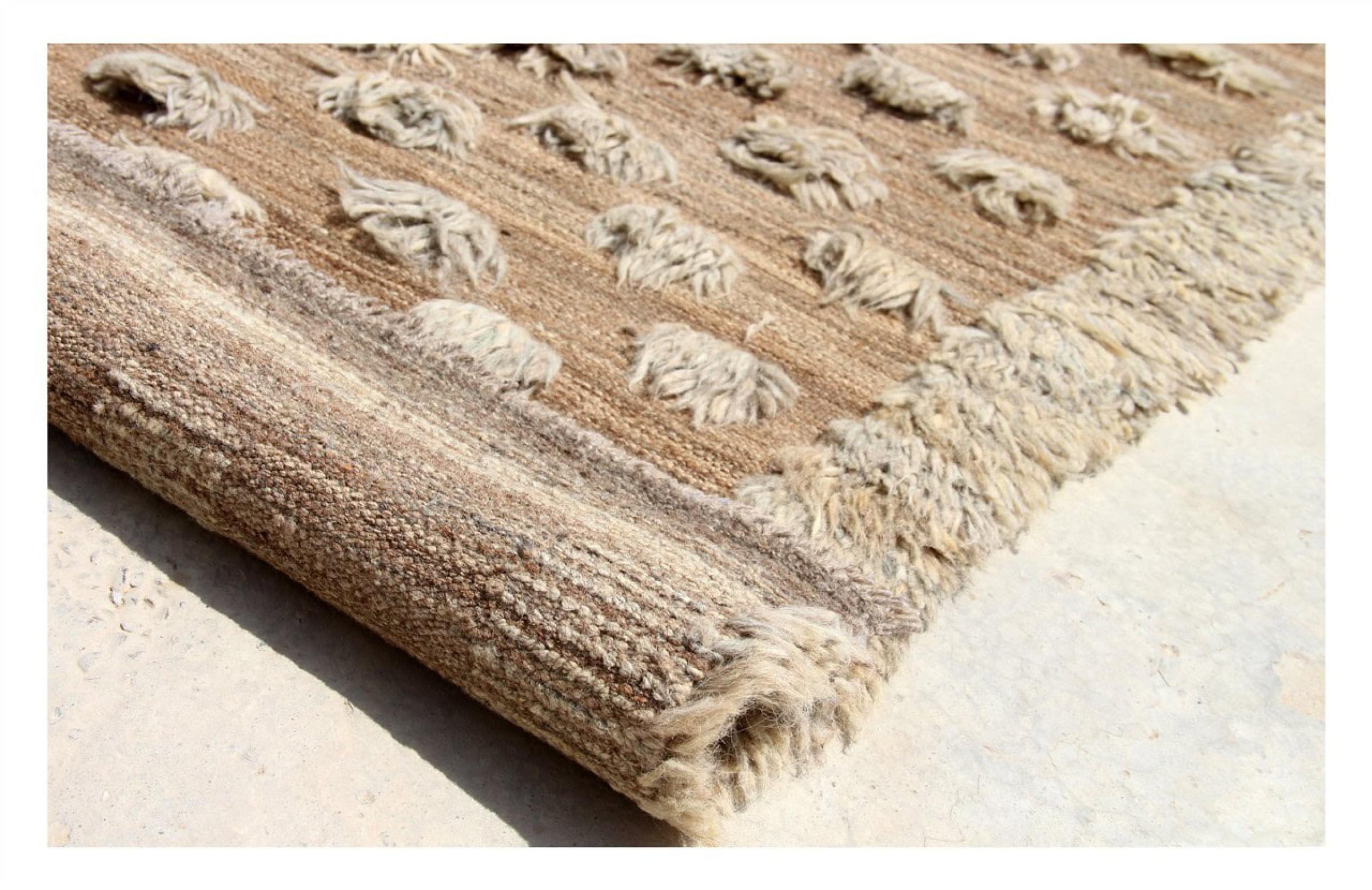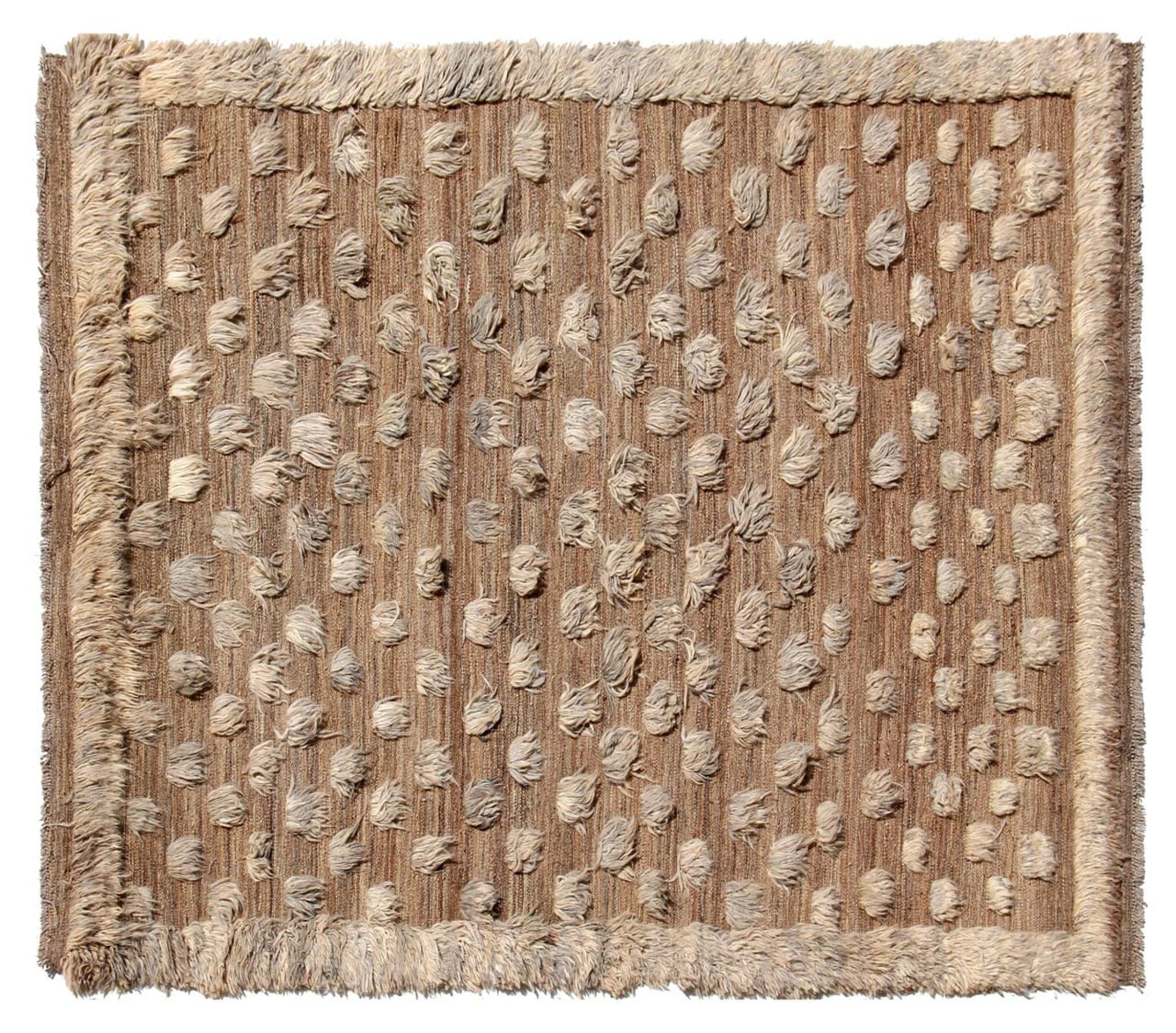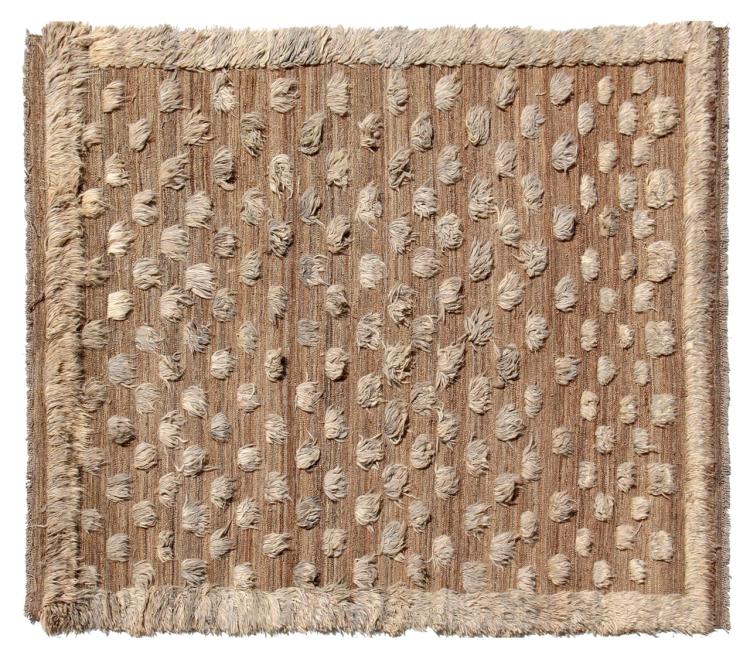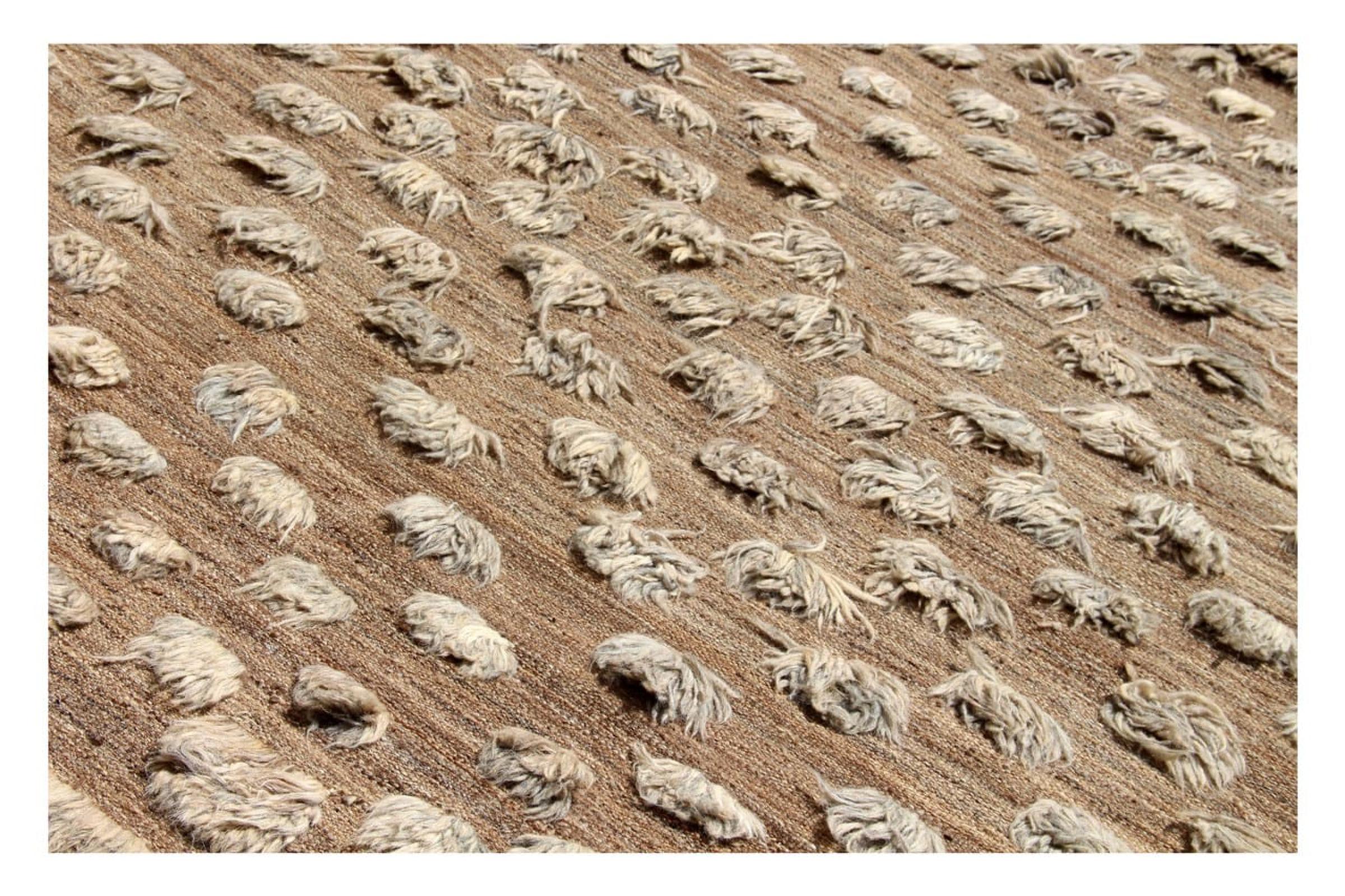 Esta alfombra fue hecha a mano en un telar como un tejido plano. Tejido plano es el término utilizado para describir las alfombras que no tienen pelo. Como el nombre promete, estas alfombras están tejidas y no anudadas. Esto resulta en una alfombra plana con una superficie estructurada. Los tejidos planos no son tan suaves y normalmente más delgados que las alfombras anudadas. Al mismo tiempo, su fabricación es mucho menos compleja y por lo general se pueden disponer por ambos lados (frontal y posterior). Sus patrones suelen ser geométricos, lo cual está determinado por el tejido.