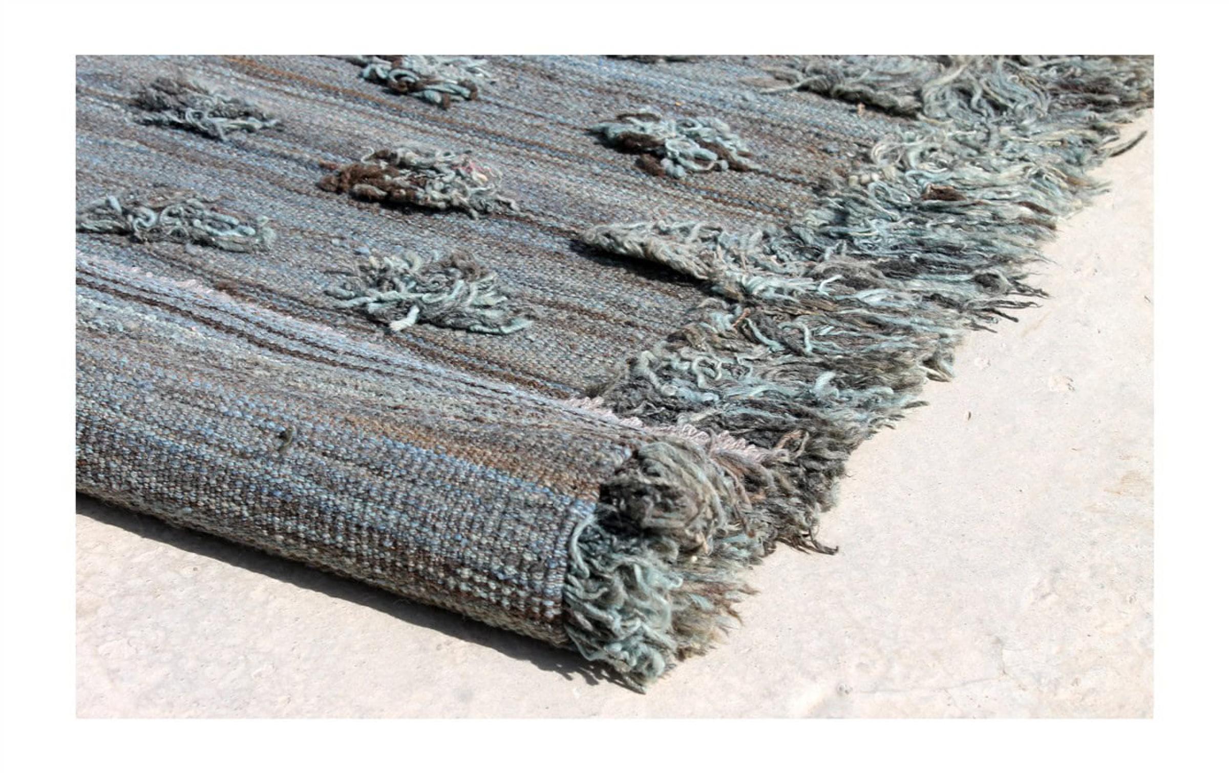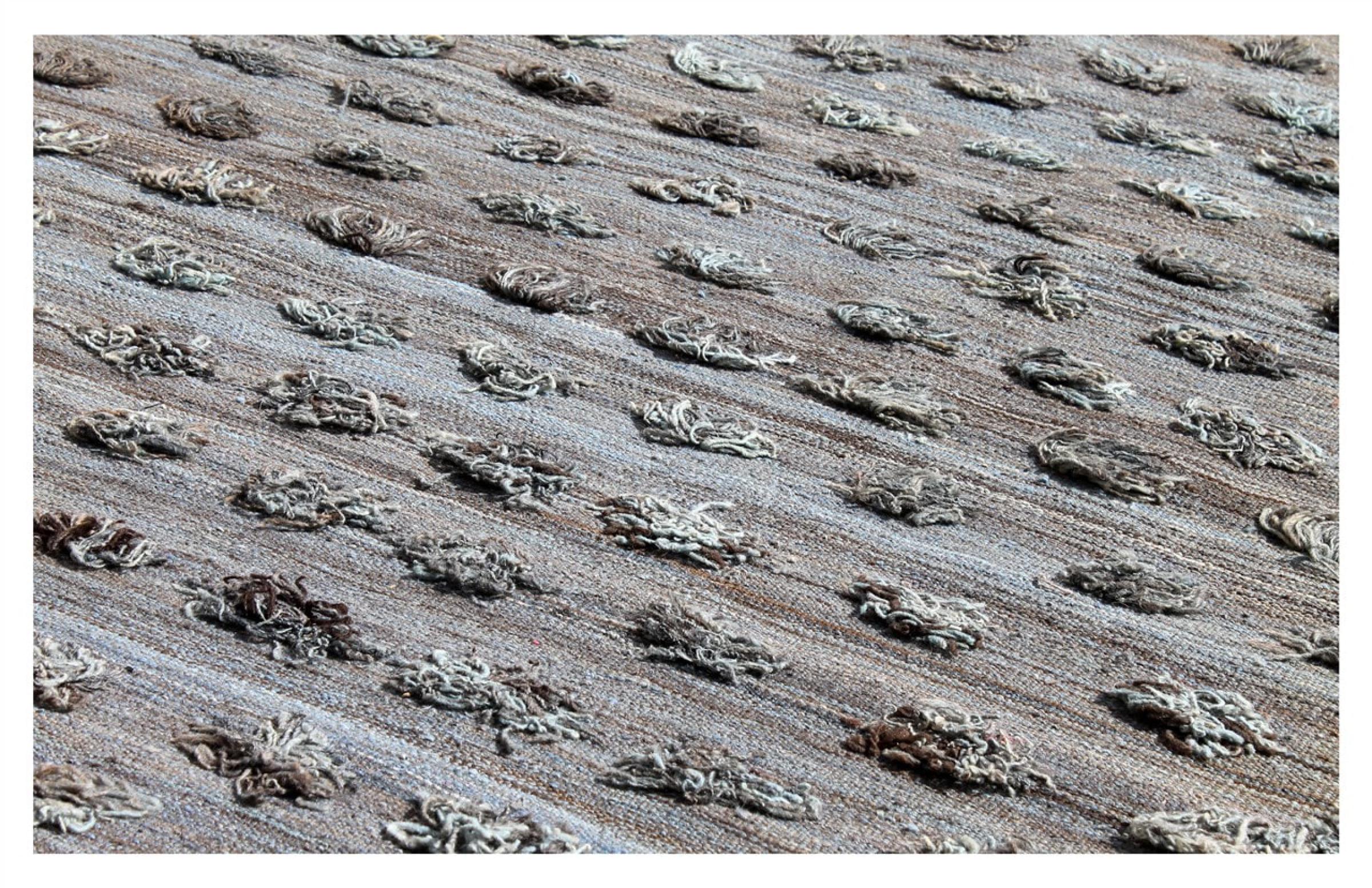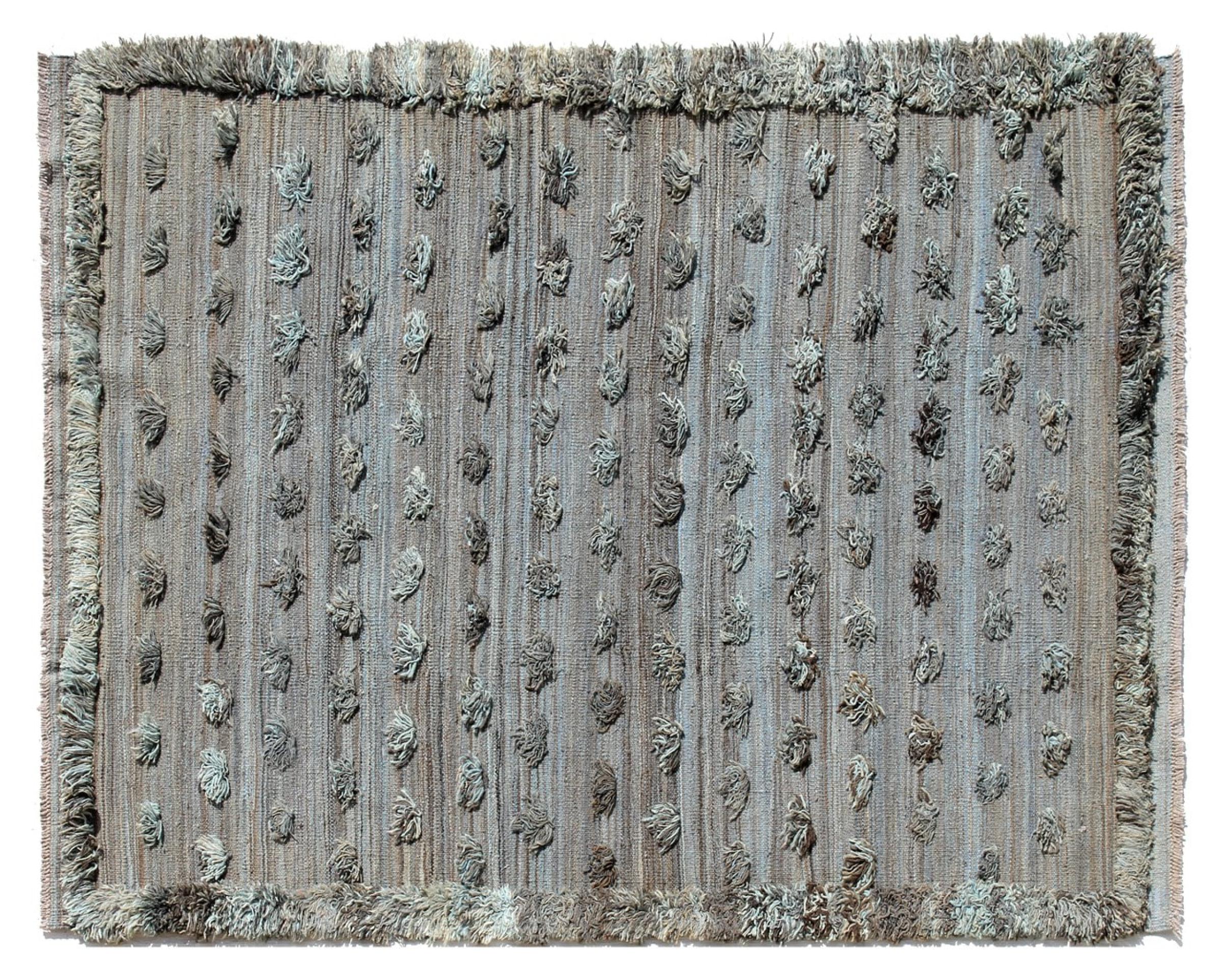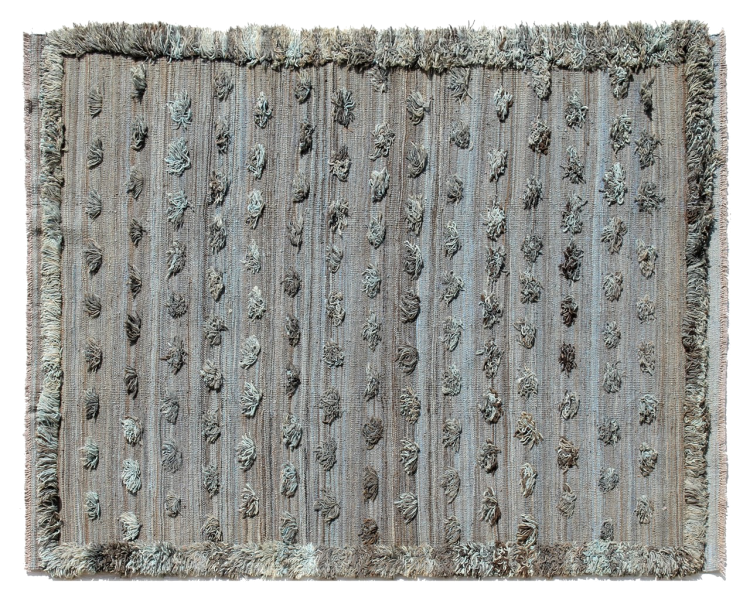 Esta alfombra fue hecha a mano en un telar como un tejido plano. Tejido plano es el término utilizado para describir las alfombras que no tienen pelo. Como el nombre promete, estas alfombras están tejidas y no anudadas. Esto resulta en una alfombra plana con una superficie estructurada. Los tejidos planos no son tan suaves y normalmente más delgados que las alfombras anudadas. Al mismo tiempo, su fabricación es mucho menos compleja y por lo general se pueden disponer por ambos lados (frontal y posterior). Sus patrones suelen ser geométricos, lo cual está determinado por el tejido.