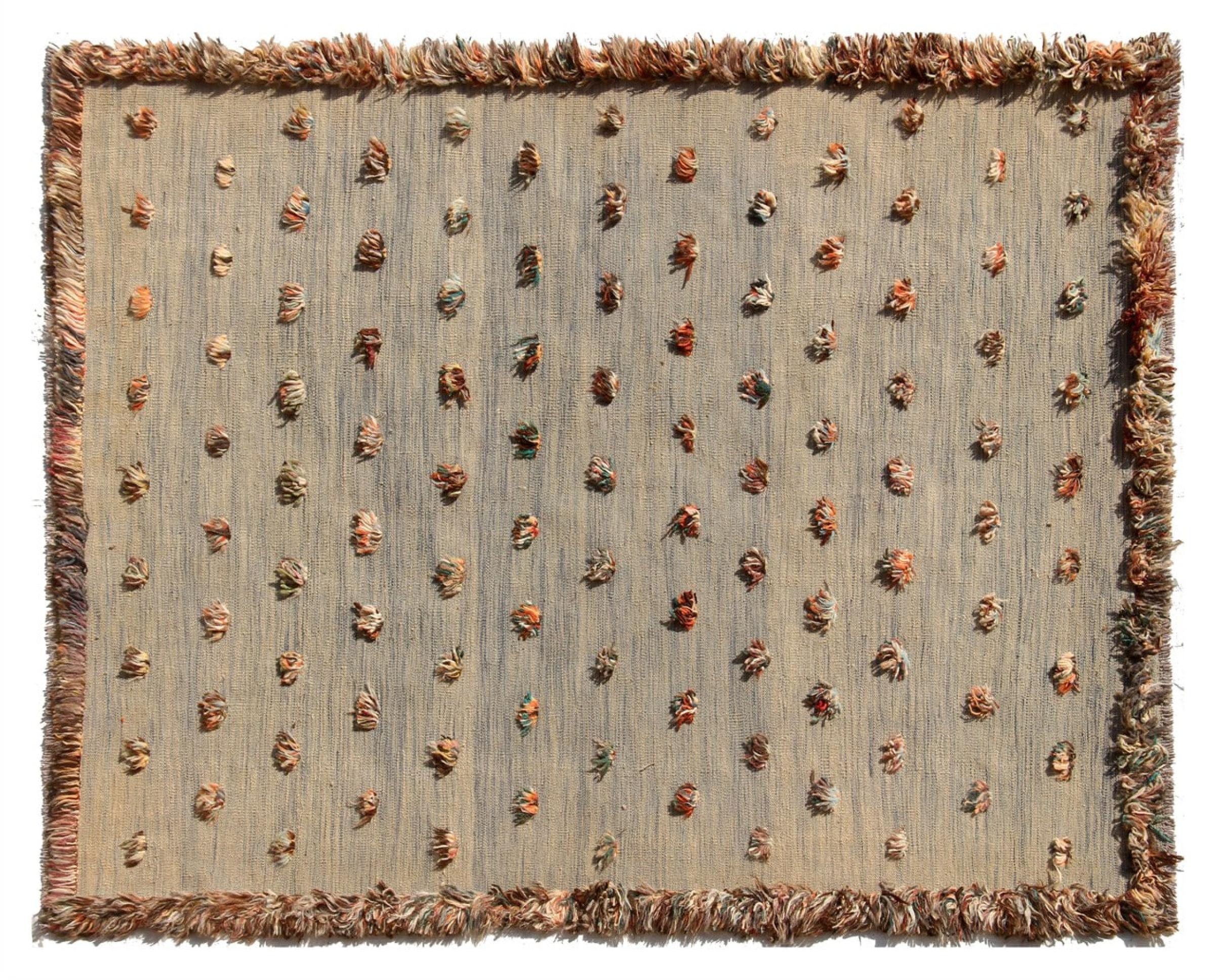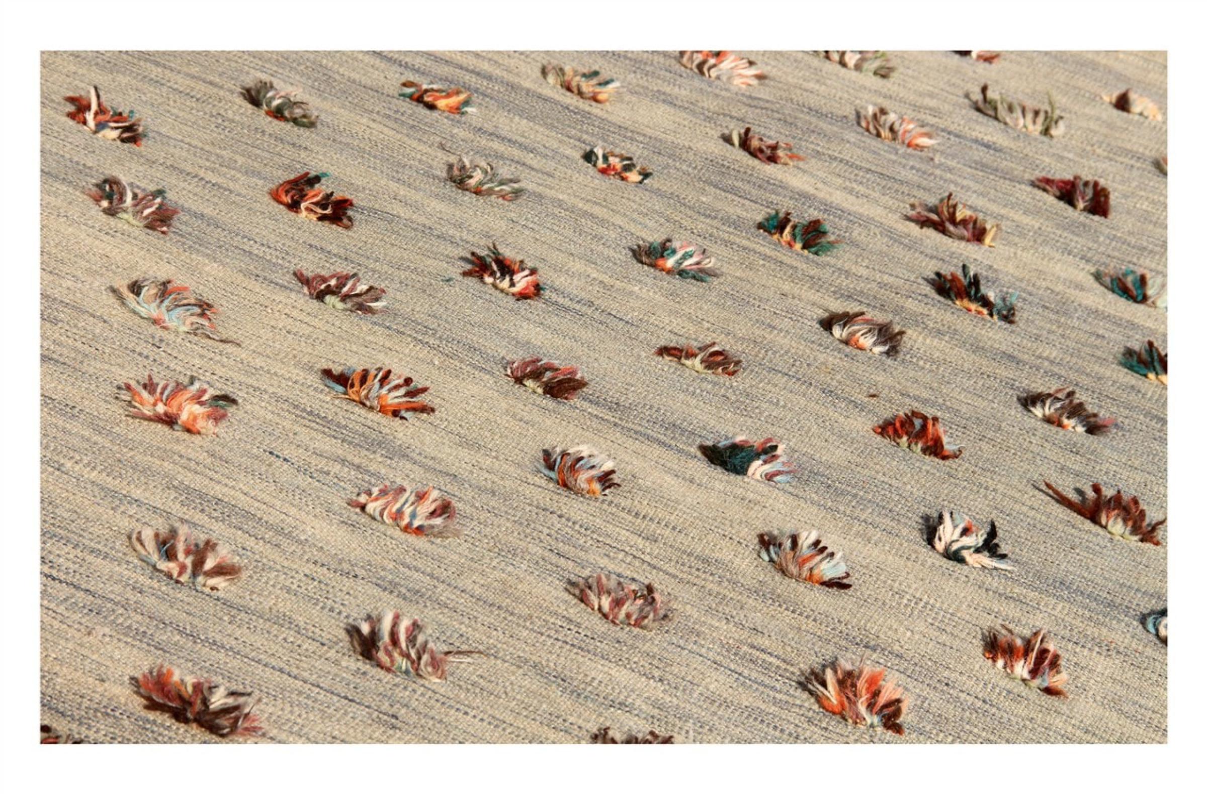 Esta alfombra fue hecha a mano en un telar como un tejido plano. Tejido plano es el término utilizado para describir las alfombras que no tienen pelo. Como el nombre promete, estas alfombras están tejidas y no anudadas. Esto resulta en una alfombra plana con una superficie estructurada. Los tejidos planos no son tan suaves y normalmente más delgados que las alfombras anudadas. Al mismo tiempo, su fabricación es mucho menos compleja y por lo general se pueden disponer por ambos lados (frontal y posterior). Sus patrones suelen ser geométricos, lo cual está determinado por el tejido.