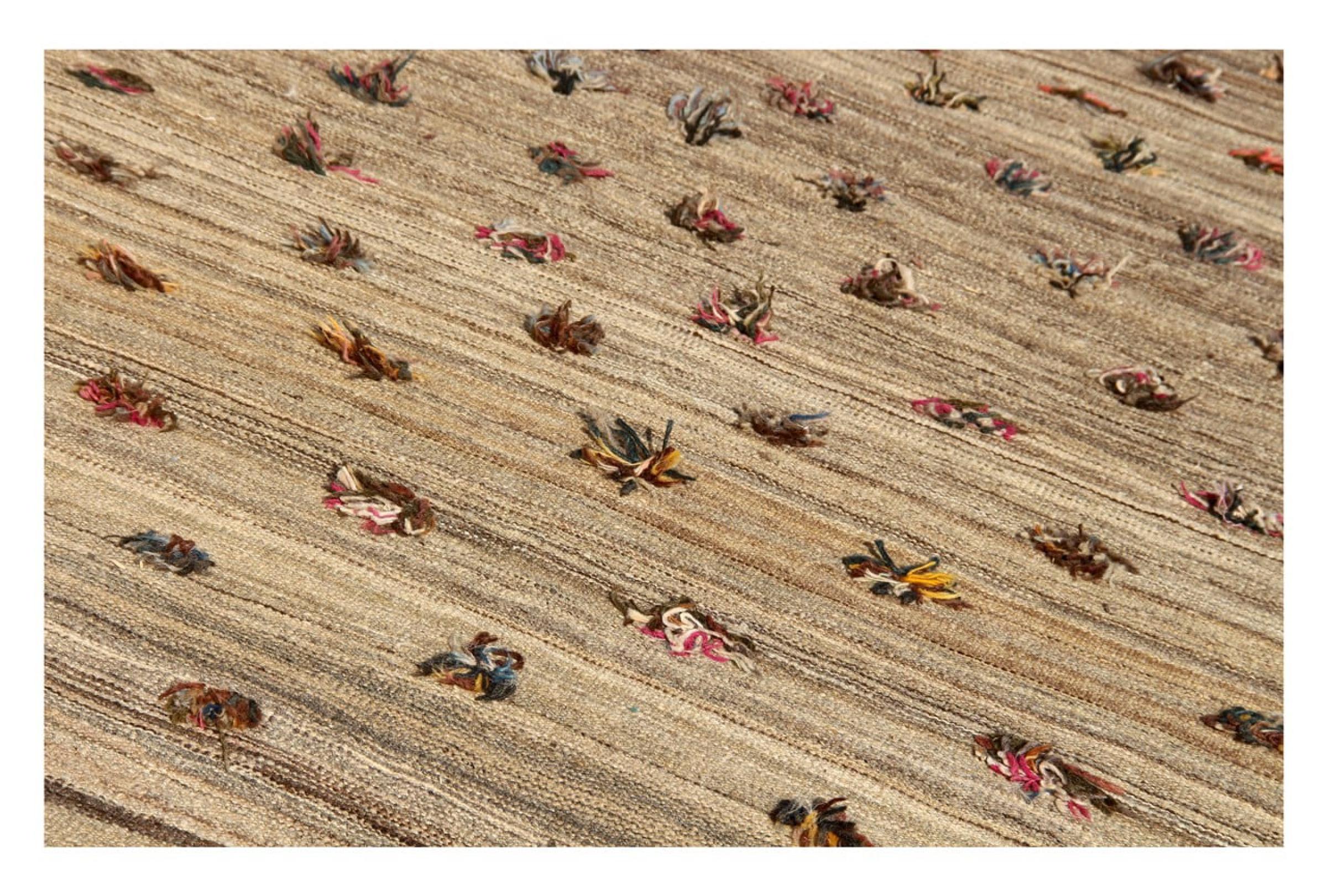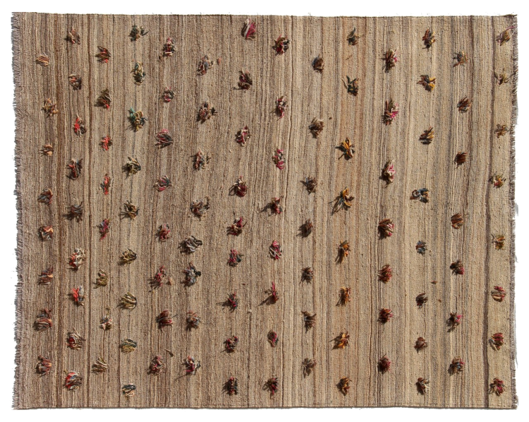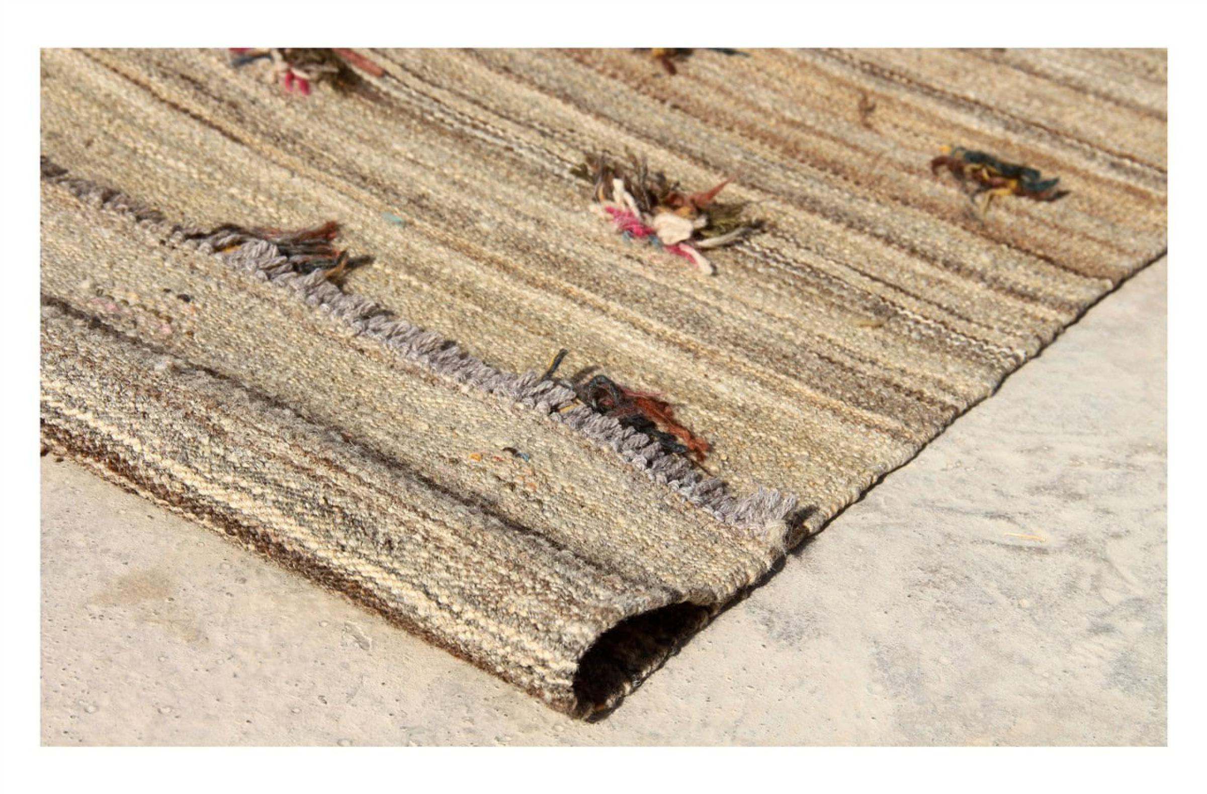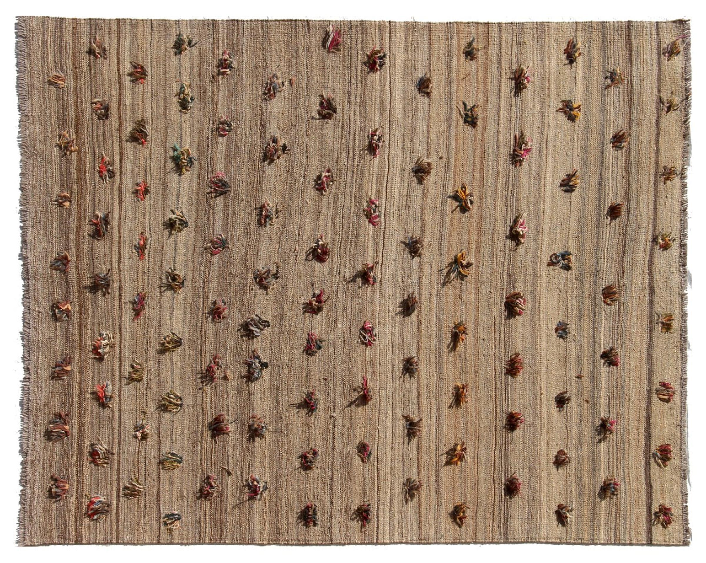 Esta alfombra fue hecha a mano en un telar como un tejido plano. Tejido plano es el término utilizado para describir las alfombras que no tienen pelo. Como el nombre promete, estas alfombras están tejidas y no anudadas. Esto resulta en una alfombra plana con una superficie estructurada. Los tejidos planos no son tan suaves y normalmente más delgados que las alfombras anudadas. Al mismo tiempo, su fabricación es mucho menos compleja y por lo general se pueden disponer por ambos lados (frontal y posterior). Sus patrones suelen ser geométricos, lo cual está determinado por el tejido.