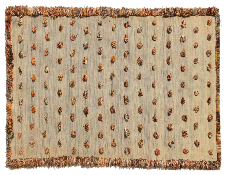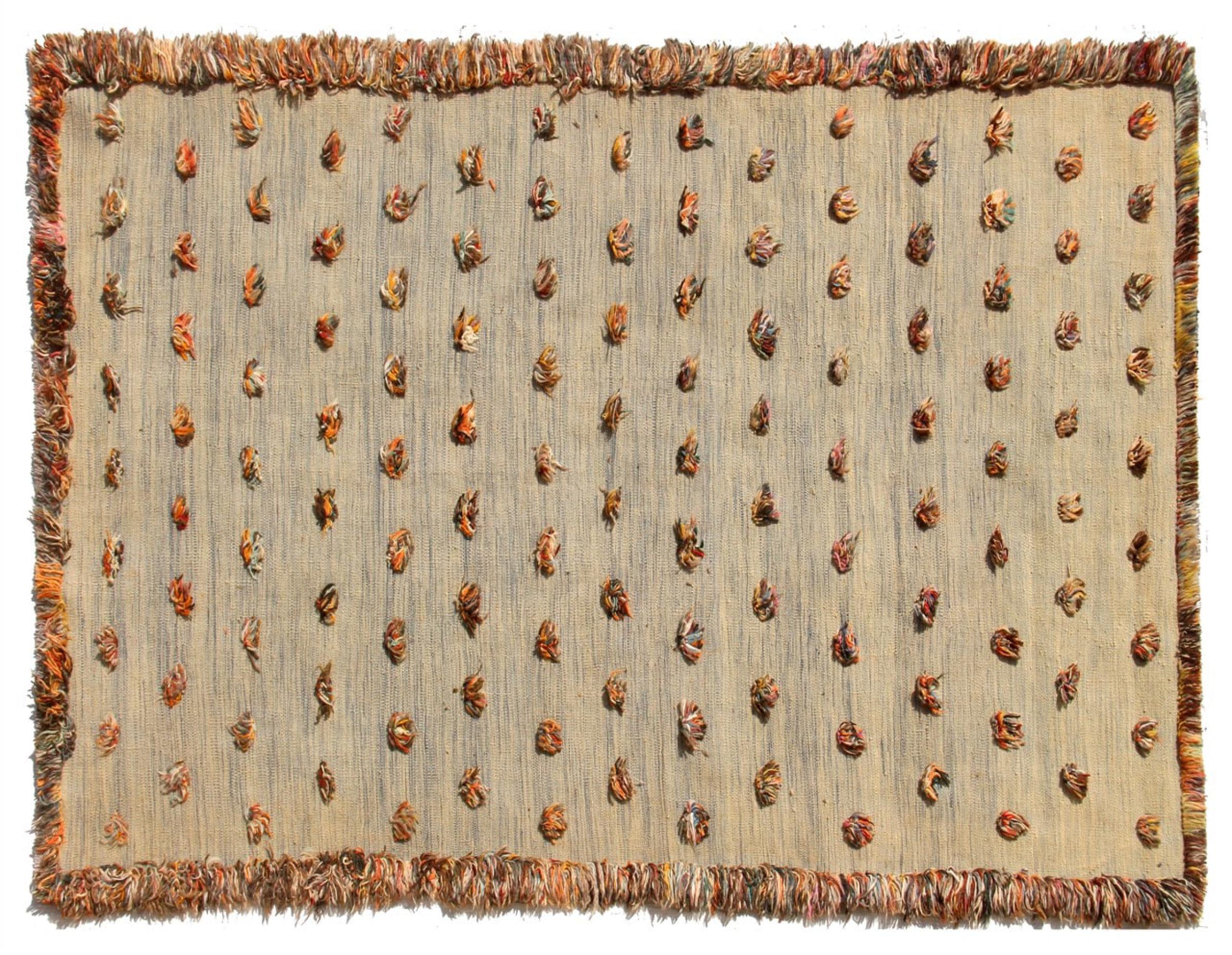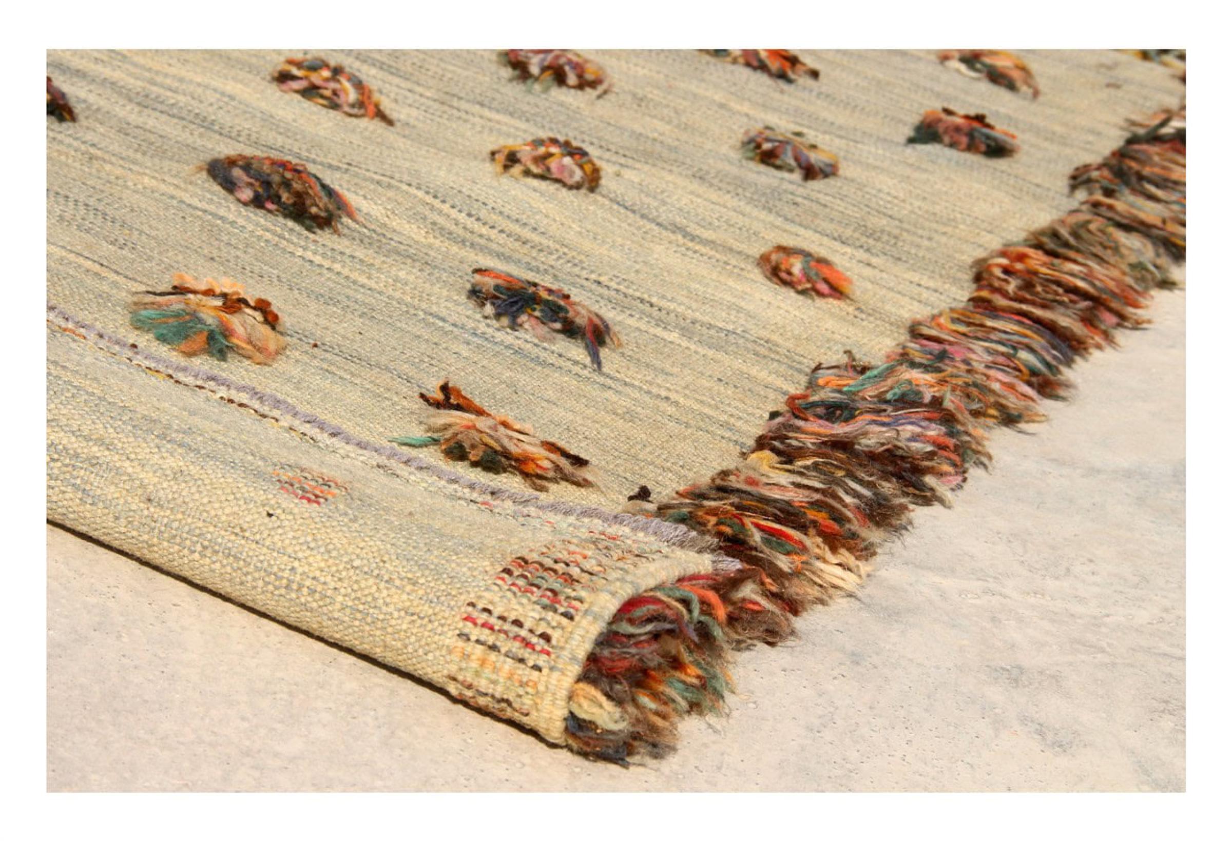 Esta alfombra fue hecha a mano en un telar como un tejido plano. Tejido plano es el término utilizado para describir las alfombras que no tienen pelo. Como el nombre promete, estas alfombras están tejidas y no anudadas. Esto resulta en una alfombra plana con una superficie estructurada. Los tejidos planos no son tan suaves y normalmente más delgados que las alfombras anudadas. Al mismo tiempo, su fabricación es mucho menos compleja y por lo general se pueden disponer por ambos lados (frontal y posterior). Sus patrones suelen ser geométricos, lo cual está determinado por el tejido.