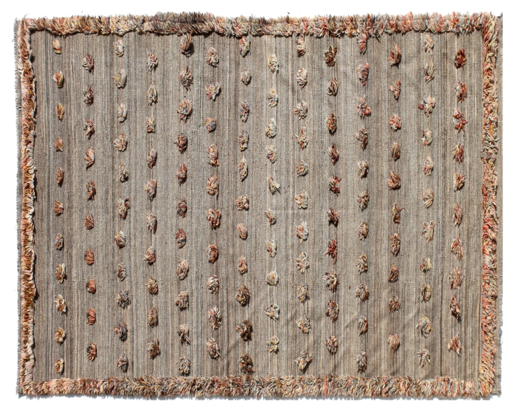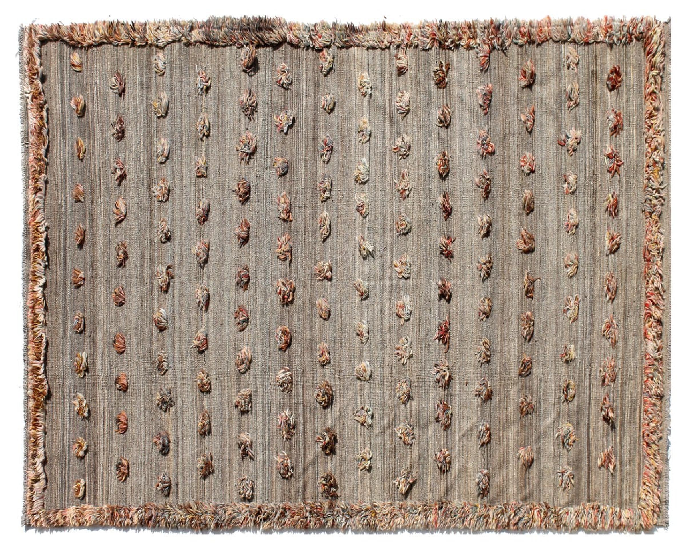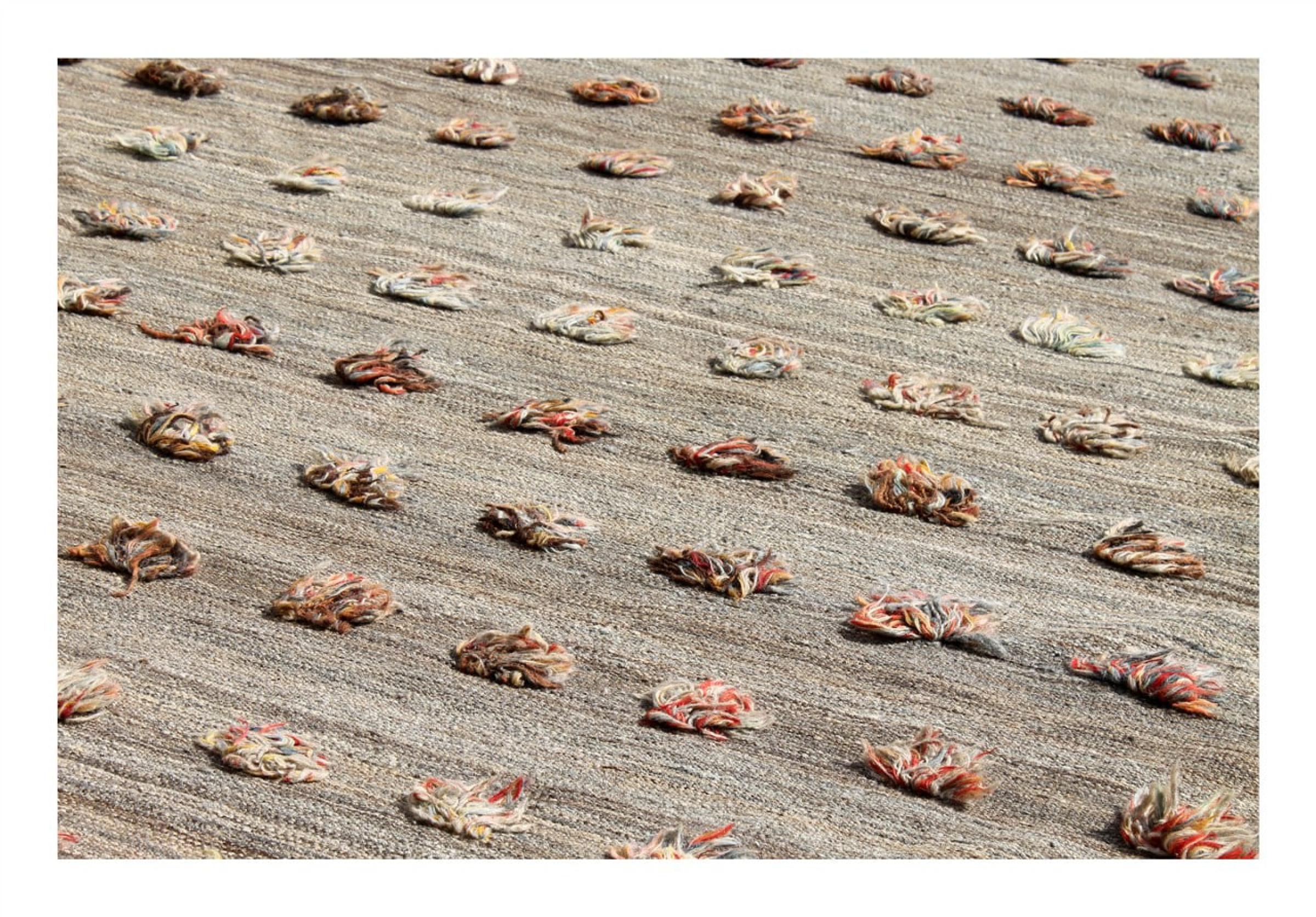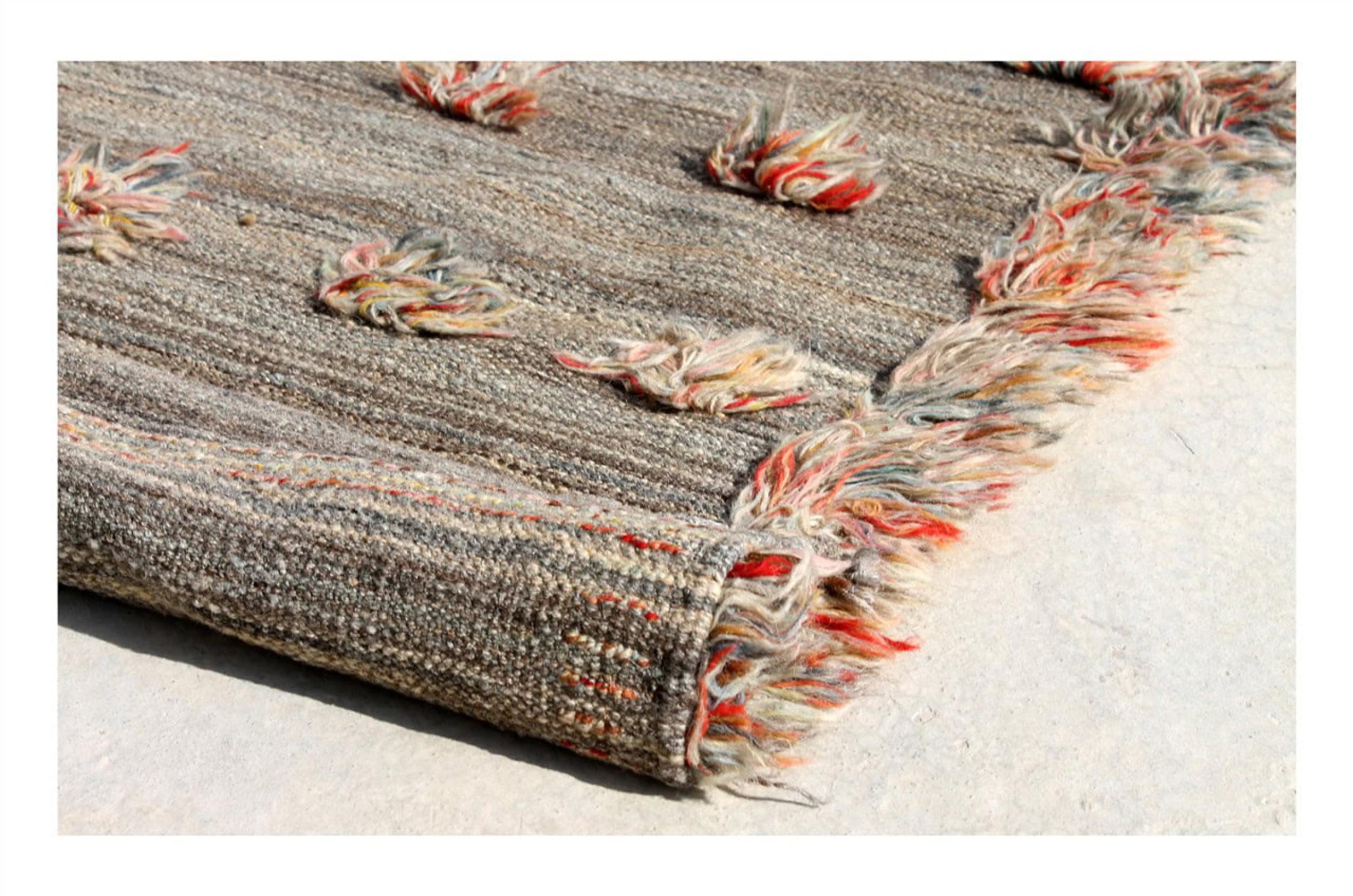 Esta alfombra fue hecha a mano en un telar como un tejido plano. Tejido plano es el término utilizado para describir las alfombras que no tienen pelo. Como el nombre promete, estas alfombras están tejidas y no anudadas. Esto resulta en una alfombra plana con una superficie estructurada. Los tejidos planos no son tan suaves y normalmente más delgados que las alfombras anudadas. Al mismo tiempo, su fabricación es mucho menos compleja y por lo general se pueden disponer por ambos lados (frontal y posterior). Sus patrones suelen ser geométricos, lo cual está determinado por el tejido.