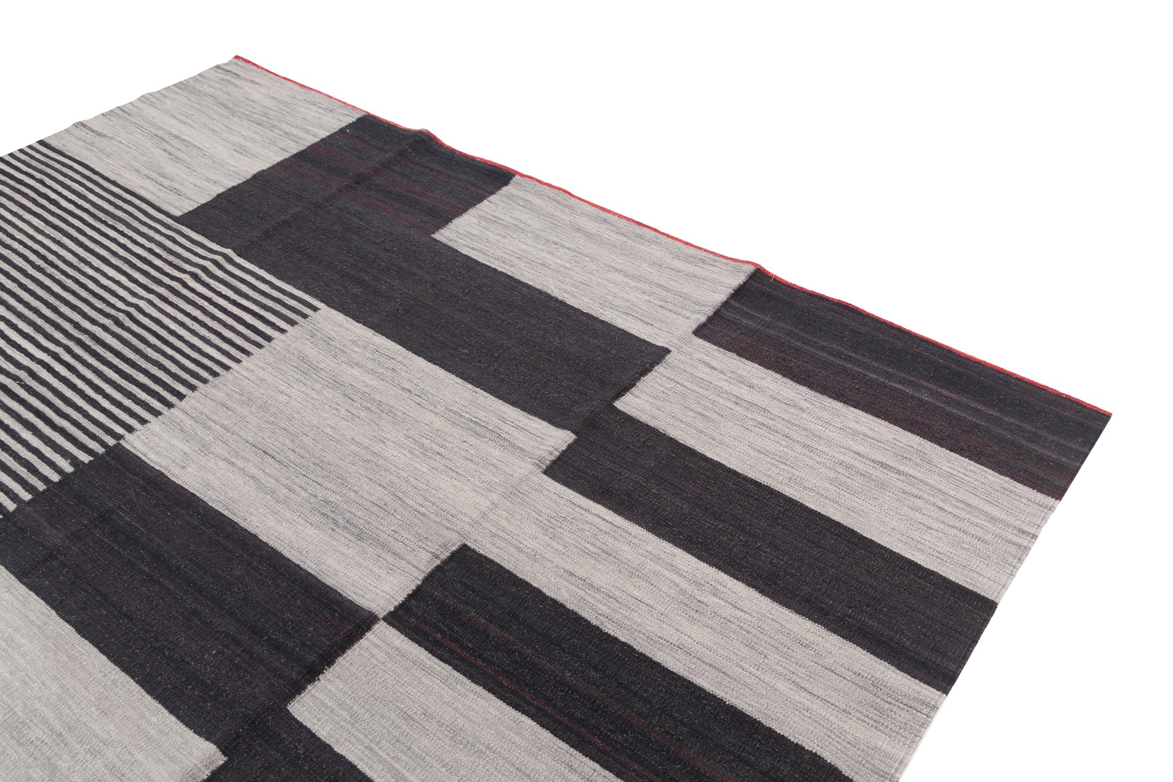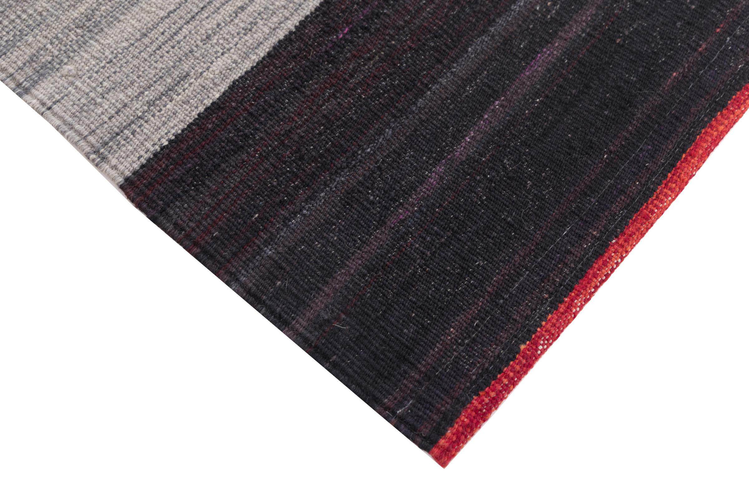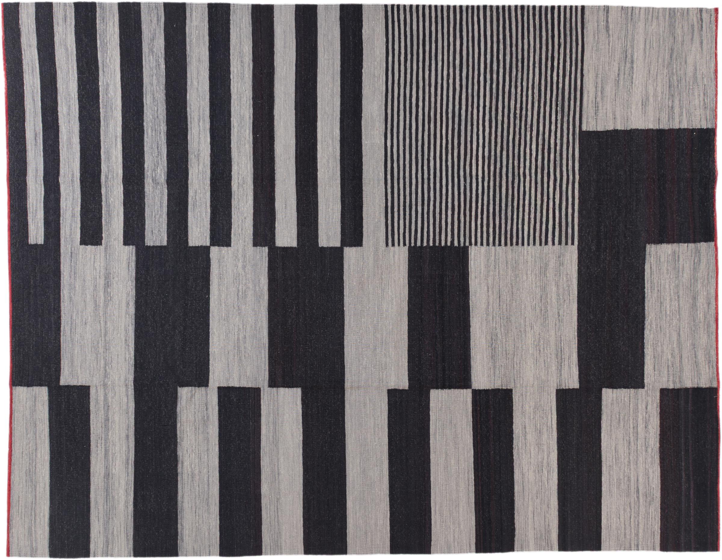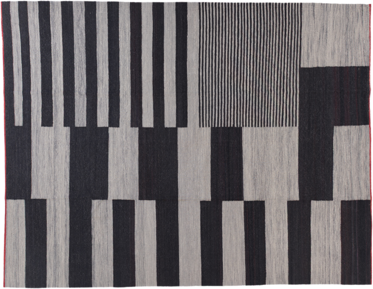 Esta alfombra fue hecha a mano en un telar como un tejido plano. Tejido plano es el término utilizado para describir las alfombras que no tienen pelo. Como el nombre promete, estas alfombras están tejidas y no anudadas. Esto resulta en una alfombra plana con una superficie estructurada. Los tejidos planos no son tan suaves y normalmente más delgados que las alfombras anudadas. Al mismo tiempo, su fabricación es mucho menos compleja y por lo general se pueden disponer por ambos lados (frontal y posterior). Sus patrones suelen ser geométricos, lo cual está determinado por el tejido.