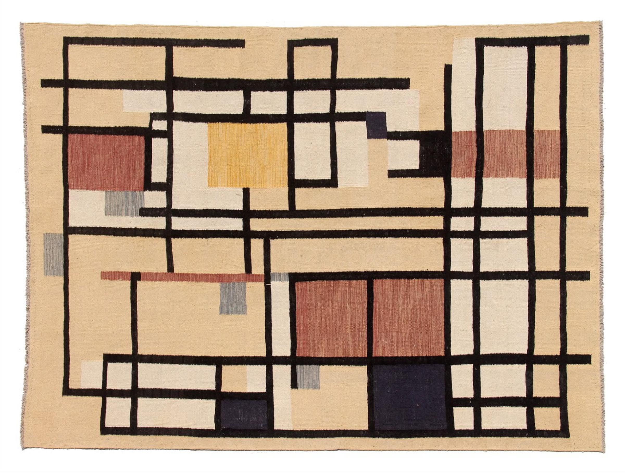 Esta alfombra fue hecha a mano en un telar como un tejido plano. Tejido plano es el término utilizado para describir las alfombras que no tienen pelo. Como el nombre promete, estas alfombras están tejidas y no anudadas. Esto resulta en una alfombra plana con una superficie estructurada. Los tejidos planos no son tan suaves y normalmente más delgados que las alfombras anudadas. Al mismo tiempo, su fabricación es mucho menos compleja y por lo general se pueden disponer por ambos lados (frontal y posterior). Sus patrones suelen ser geométricos, lo cual está determinado por el tejido.