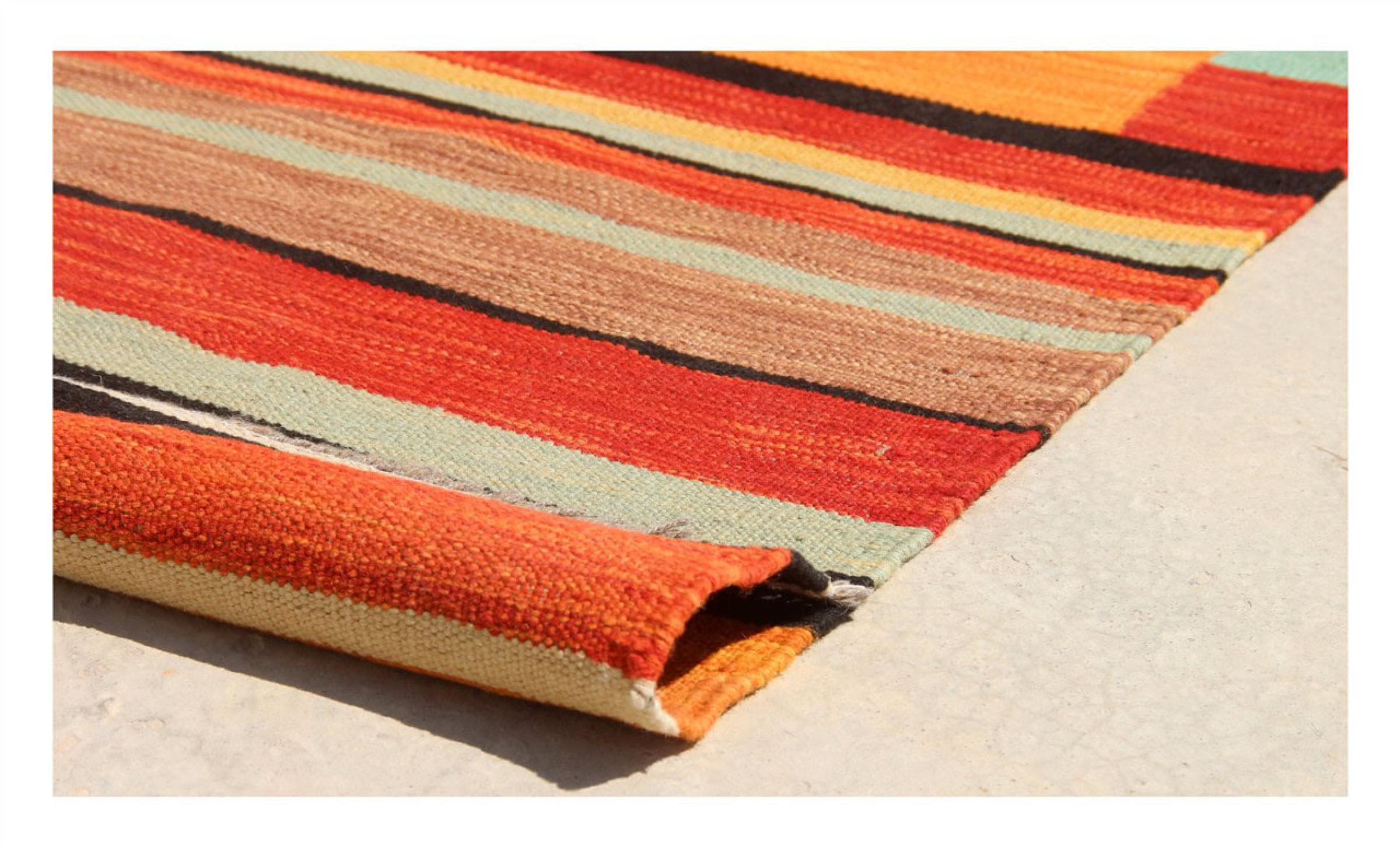 Esta alfombra fue hecha a mano en un telar como un tejido plano. Tejido plano es el término utilizado para describir las alfombras que no tienen pelo. Como el nombre promete, estas alfombras están tejidas y no anudadas. Esto resulta en una alfombra plana con una superficie estructurada. Los tejidos planos no son tan suaves y normalmente más delgados que las alfombras anudadas. Al mismo tiempo, su fabricación es mucho menos compleja y por lo general se pueden disponer por ambos lados (frontal y posterior). Sus patrones suelen ser geométricos, lo cual está determinado por el tejido.