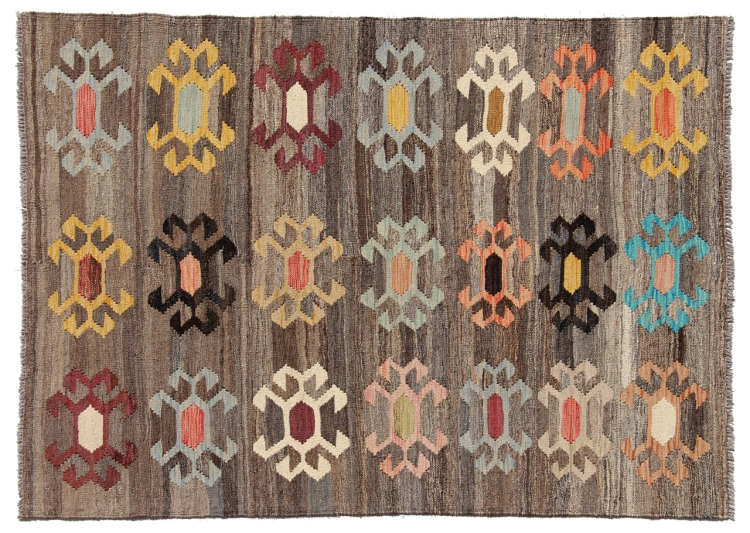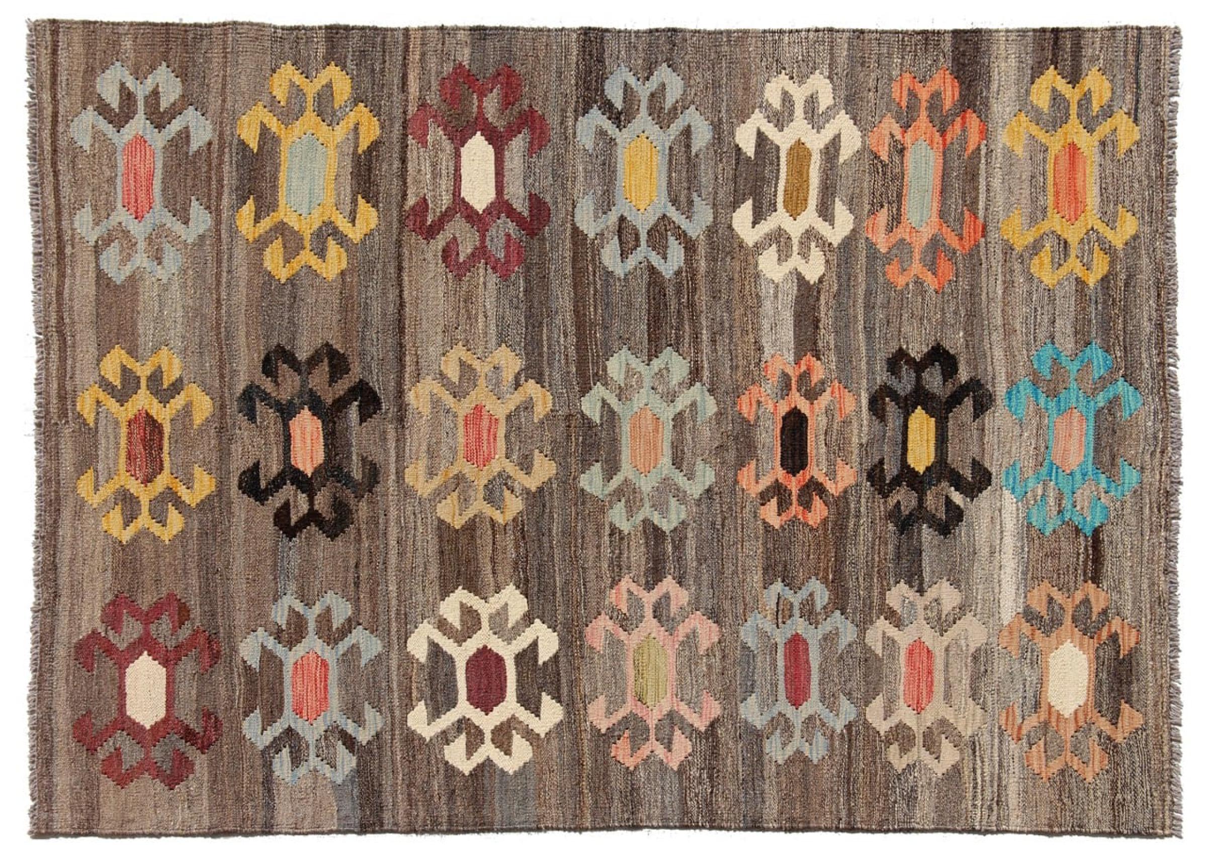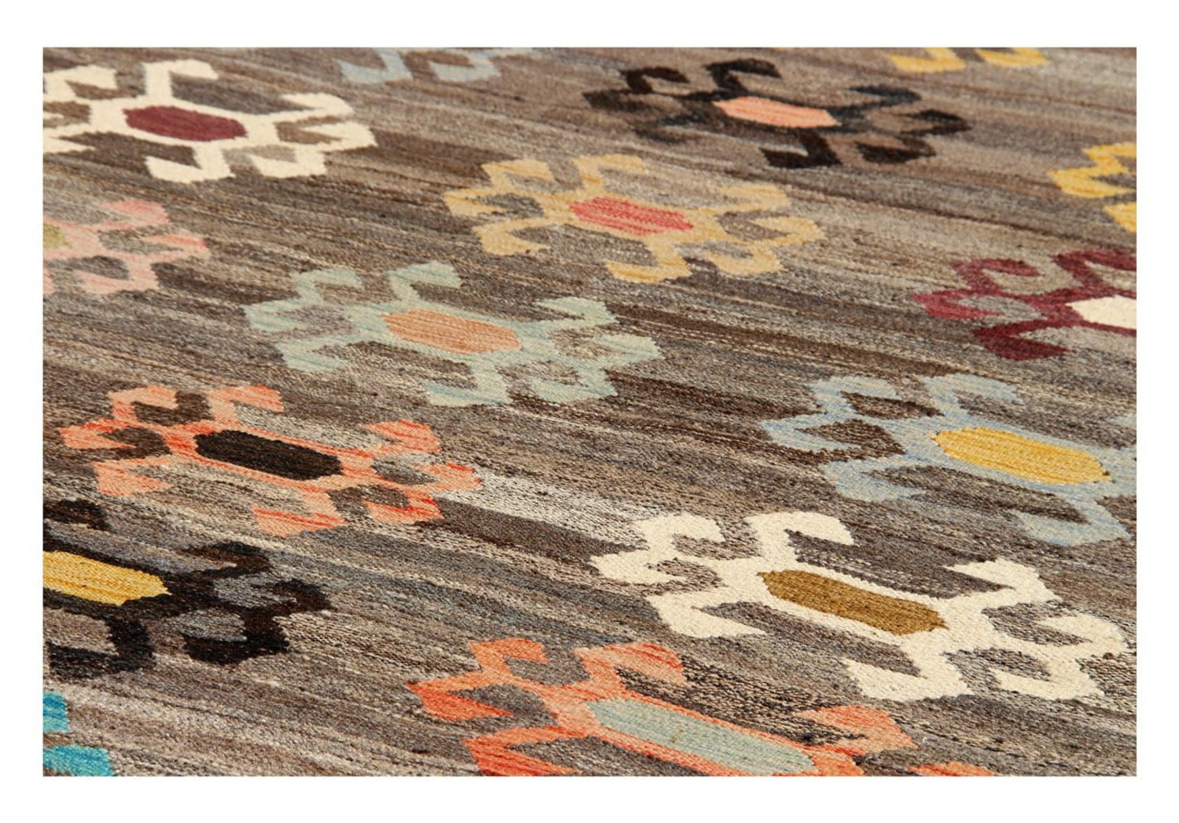Estas alfombras kilim muestran una diferencia decisiva con las alfombras anudadas a mano - son tejidas a mano. Por lo tanto, no tienen un montón alto de lana y son a menudo más planos y más ásperos que las alfombras de lana anudada. Su fabricación es menos elaborada y por eso suelen ser mucho más baratas. Como ventaja, las alfombras de kilim son también mucho más ligeras y pueden ser colocadas por delante y por detrás. Los kilims tejidos a mano provienen originalmente de la antigua Persia y ahora también se fabrican a menudo en el Afganistán. Tienen patrones bastante simples y directos, que se deben a su técnica de tejido.