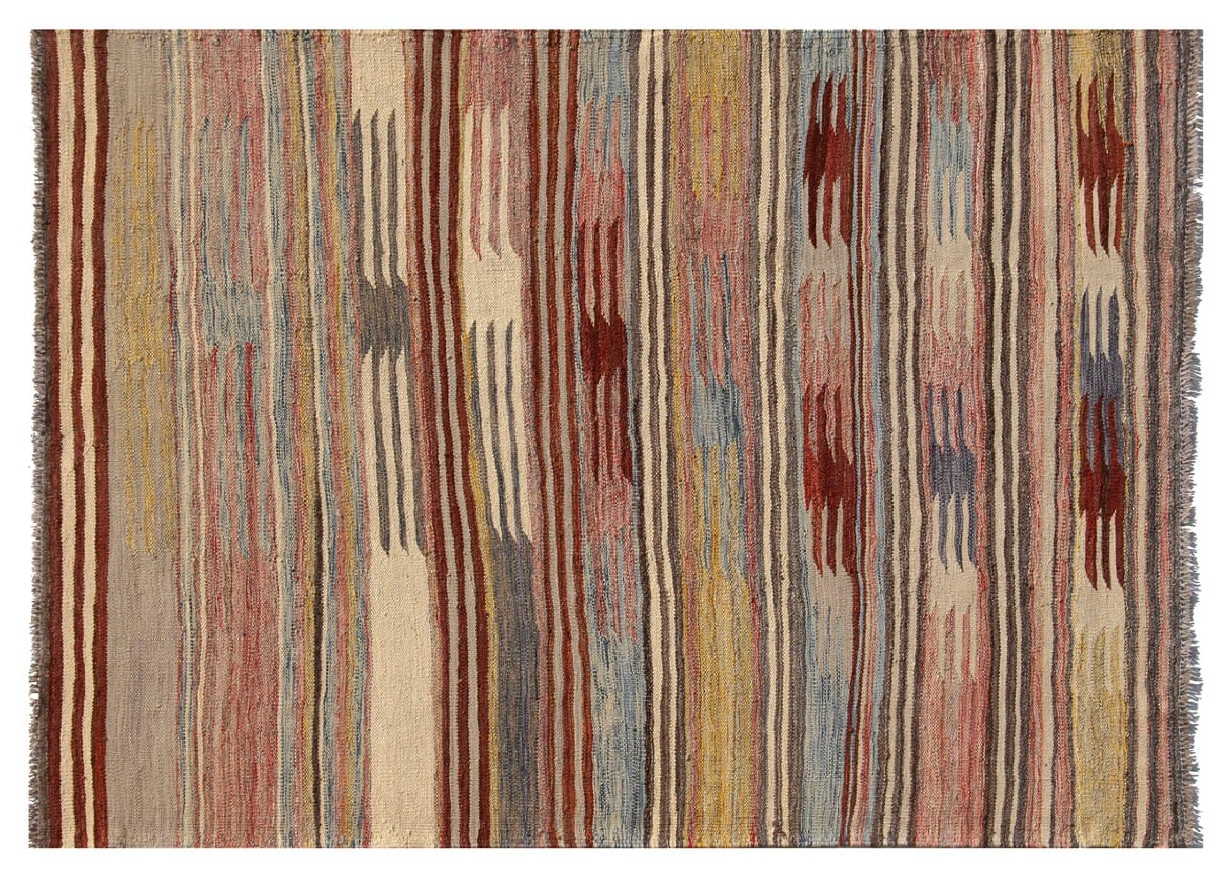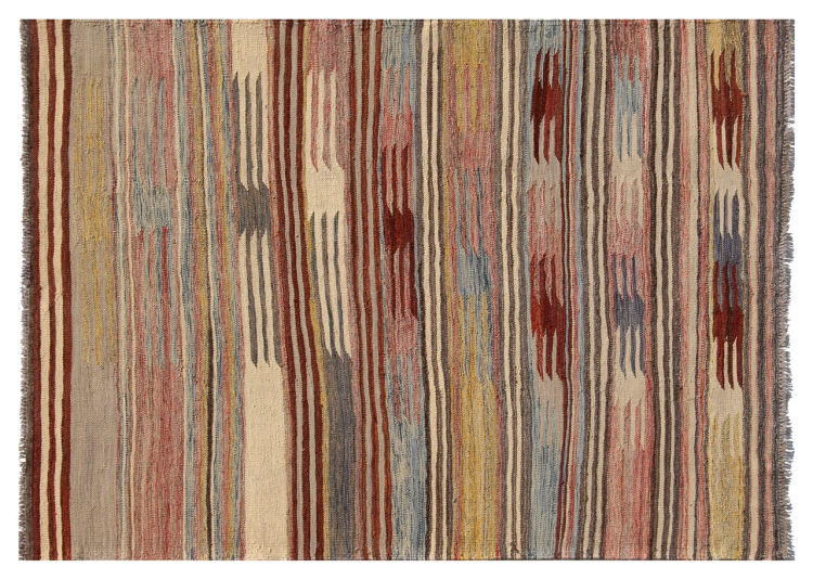 Esta alfombra fue hecha a mano en un telar como un tejido plano. Tejido plano es el término utilizado para describir las alfombras que no tienen pelo. Como el nombre promete, estas alfombras están tejidas y no anudadas. Esto resulta en una alfombra plana con una superficie estructurada. Los tejidos planos no son tan suaves y normalmente más delgados que las alfombras anudadas. Al mismo tiempo, su fabricación es mucho menos compleja y por lo general se pueden disponer por ambos lados (frontal y posterior). Sus patrones suelen ser geométricos, lo cual está determinado por el tejido.