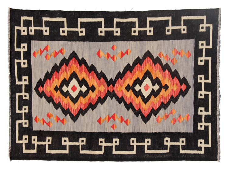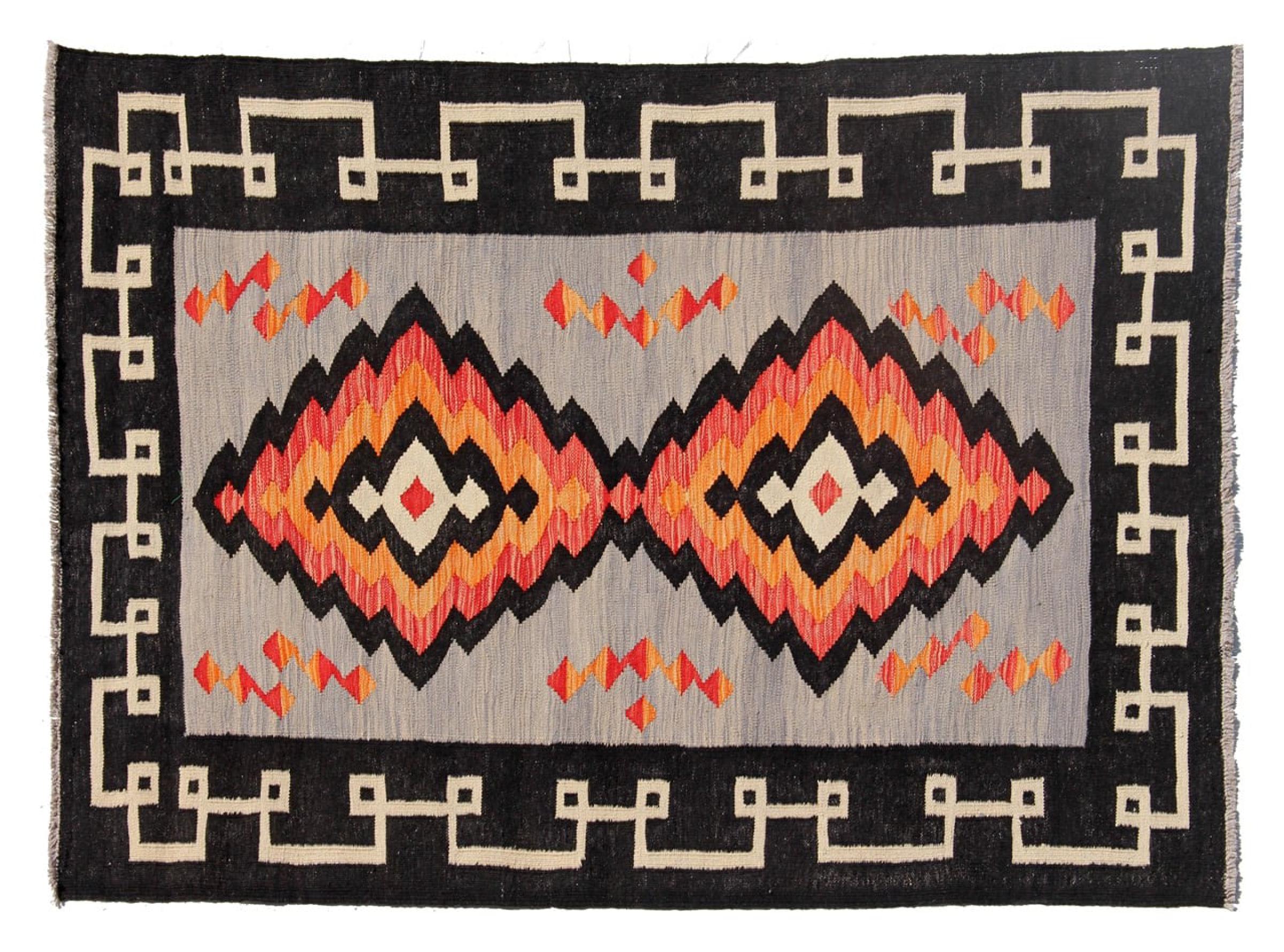 Esta alfombra fue hecha a mano en un telar como un tejido plano. Tejido plano es el término utilizado para describir las alfombras que no tienen pelo. Como el nombre promete, estas alfombras están tejidas y no anudadas. Esto resulta en una alfombra plana con una superficie estructurada. Los tejidos planos no son tan suaves y normalmente más delgados que las alfombras anudadas. Al mismo tiempo, su fabricación es mucho menos compleja y por lo general se pueden disponer por ambos lados (frontal y posterior). Sus patrones suelen ser geométricos, lo cual está determinado por el tejido.