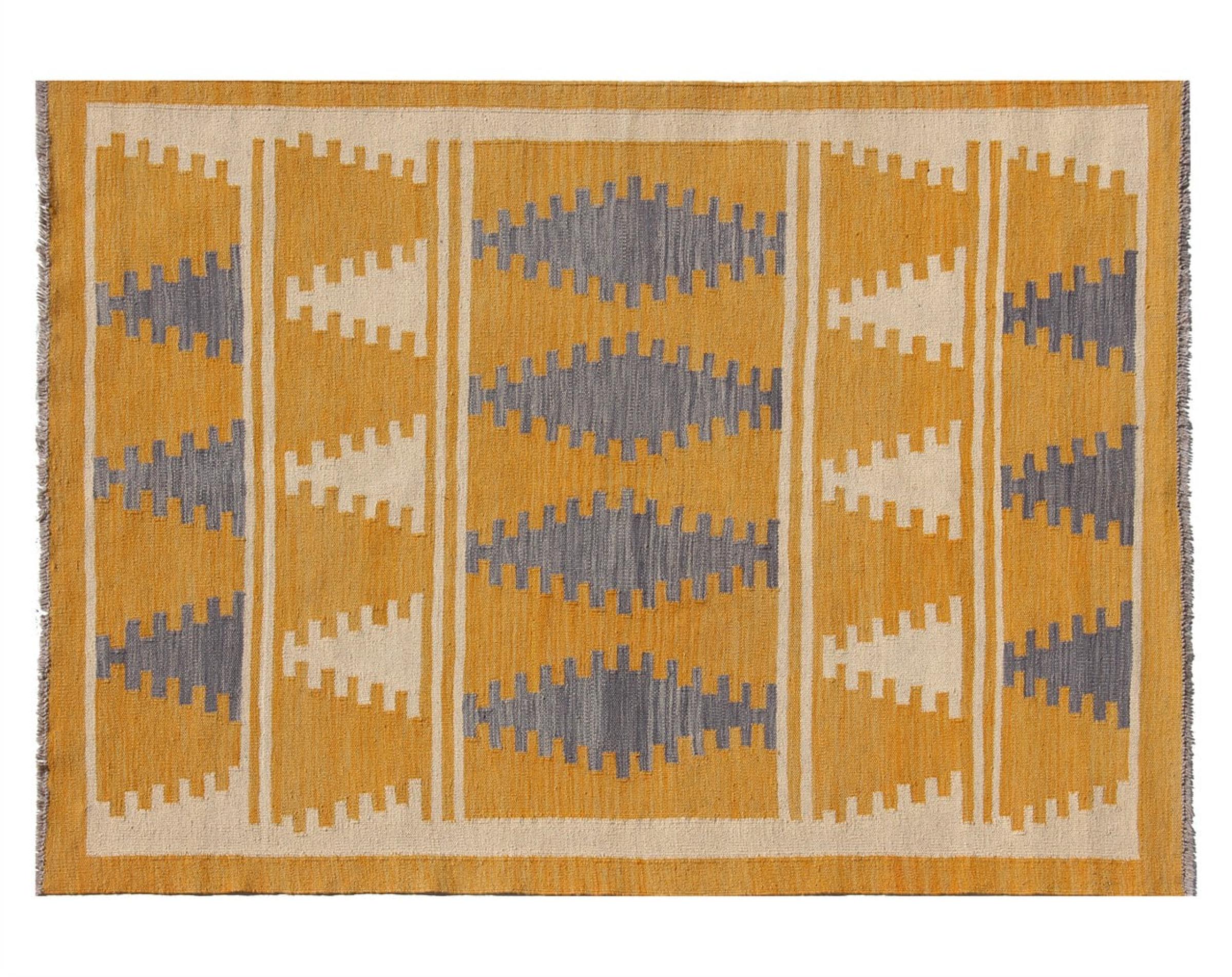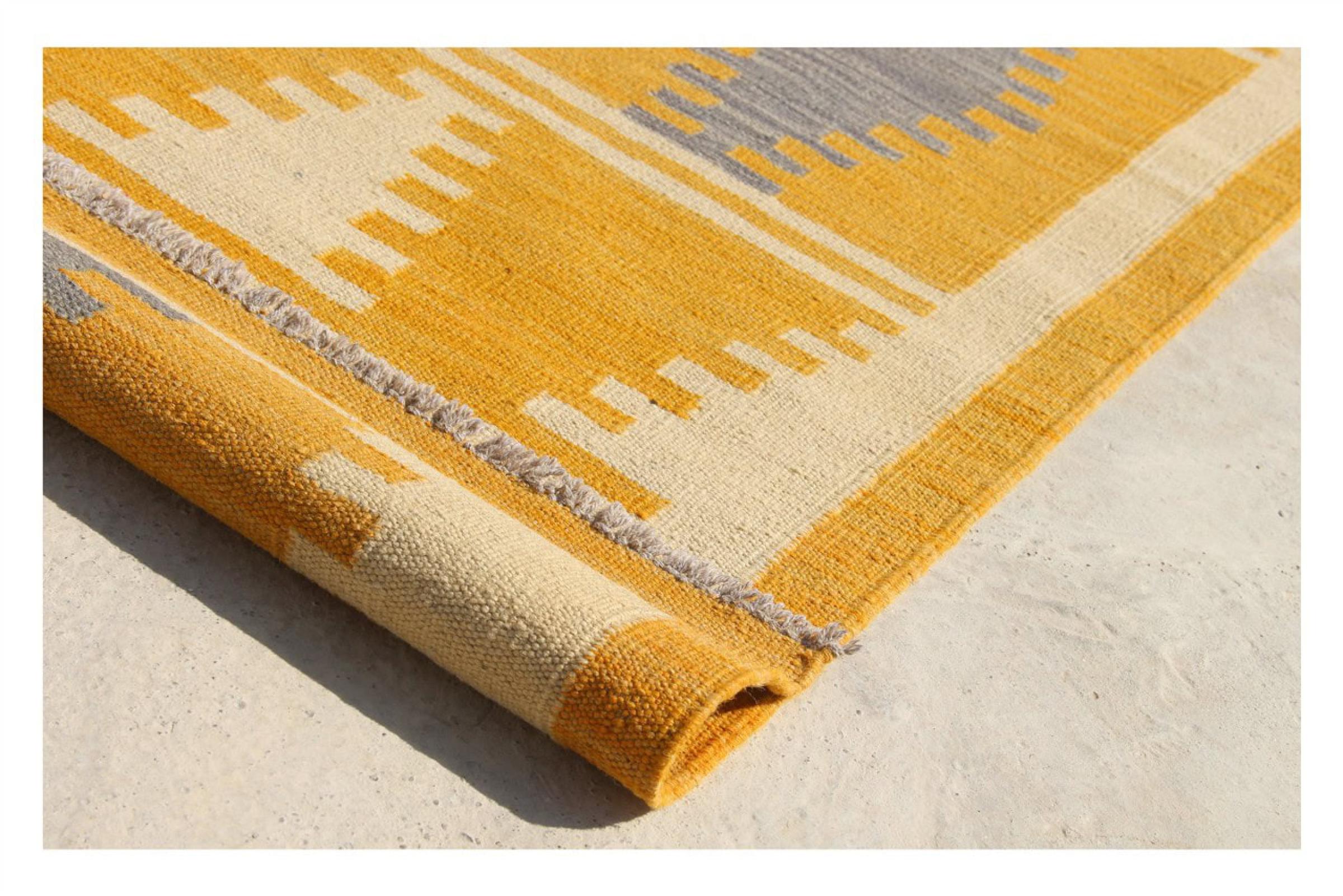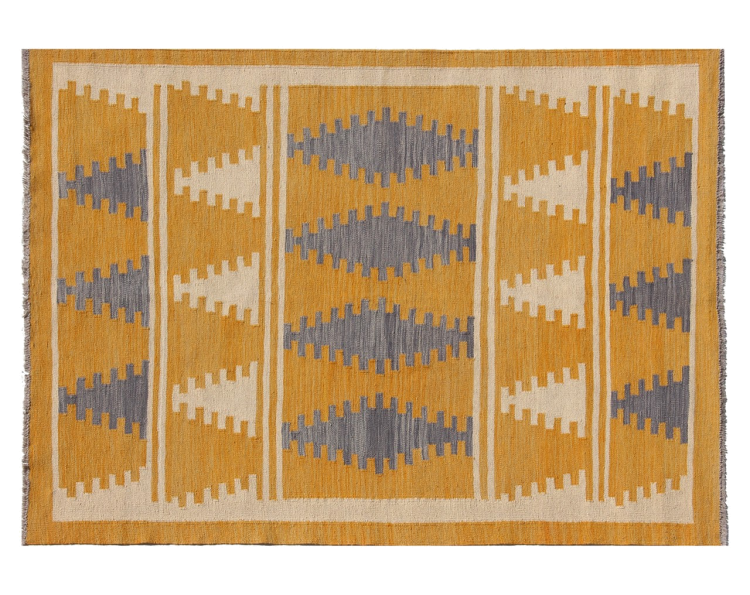 Esta alfombra fue hecha a mano en un telar como un tejido plano. Tejido plano es el término utilizado para describir las alfombras que no tienen pelo. Como el nombre promete, estas alfombras están tejidas y no anudadas. Esto resulta en una alfombra plana con una superficie estructurada. Los tejidos planos no son tan suaves y normalmente más delgados que las alfombras anudadas. Al mismo tiempo, su fabricación es mucho menos compleja y por lo general se pueden disponer por ambos lados (frontal y posterior). Sus patrones suelen ser geométricos, lo cual está determinado por el tejido.
