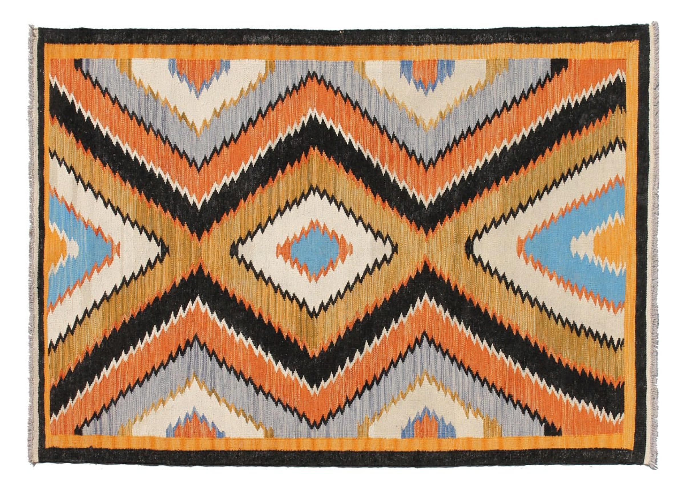 Estas alfombras kilim muestran una diferencia decisiva con las alfombras anudadas a mano - son tejidas a mano. Por lo tanto, no tienen un montón alto de lana y son a menudo más planos y más ásperos que las alfombras de lana anudada. Su fabricación es menos elaborada y por eso suelen ser mucho más baratas. Como ventaja, las alfombras de kilim son también mucho más ligeras y pueden ser colocadas por delante y por detrás. Los kilims tejidos a mano provienen originalmente de la antigua Persia y ahora también se fabrican a menudo en el Afganistán. Tienen patrones bastante simples y directos, que se deben a su técnica de tejido.