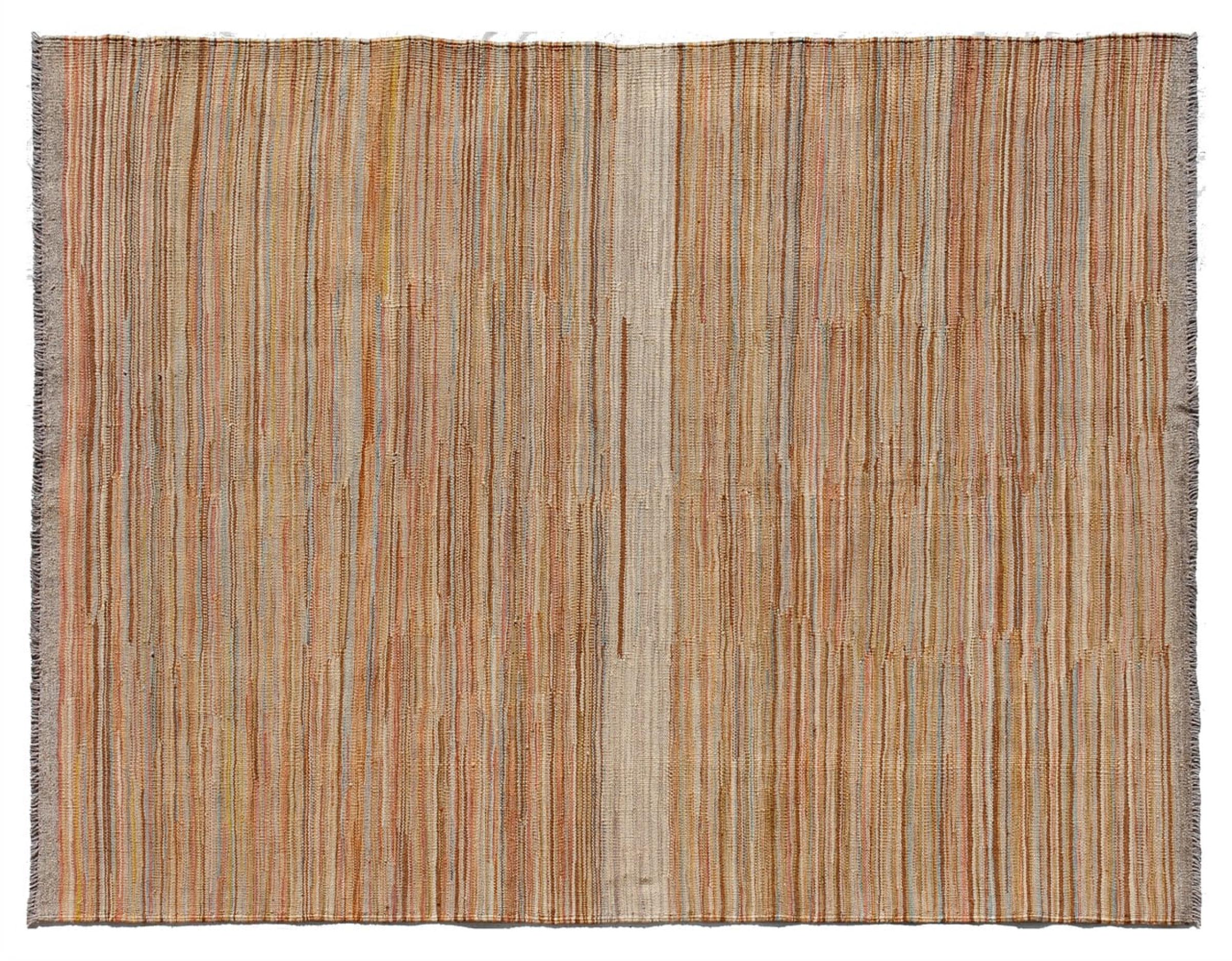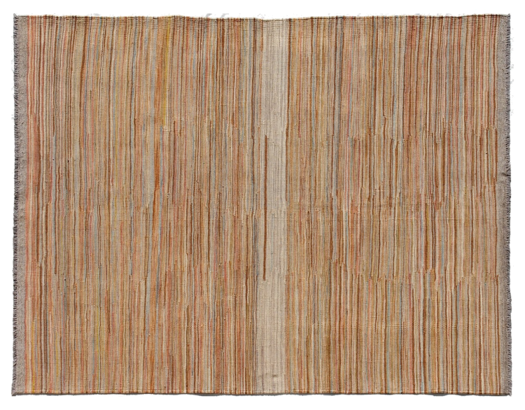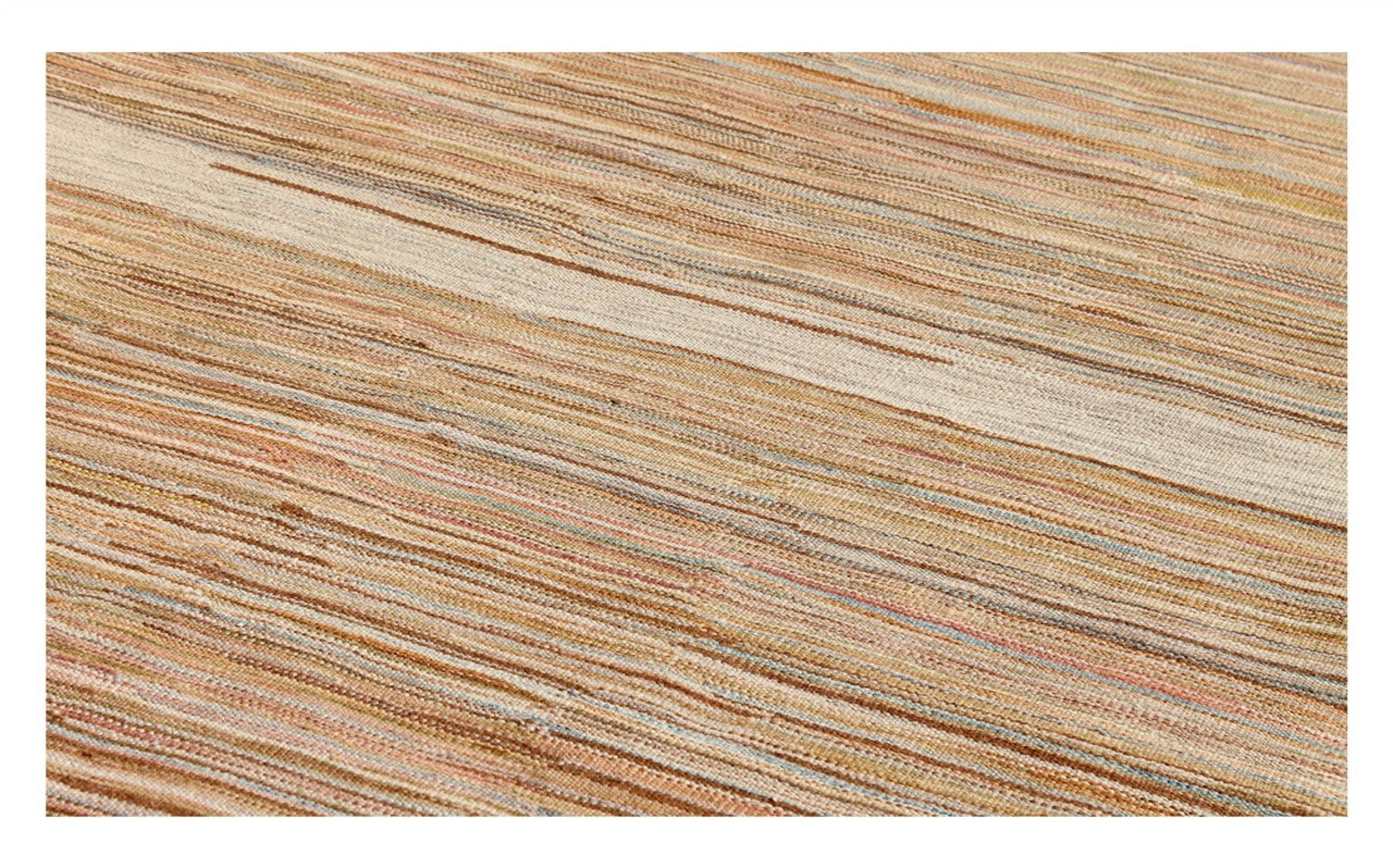 Esta alfombra fue hecha a mano en un telar como un tejido plano. Tejido plano es el término utilizado para describir las alfombras que no tienen pelo. Como el nombre promete, estas alfombras están tejidas y no anudadas. Esto resulta en una alfombra plana con una superficie estructurada. Los tejidos planos no son tan suaves y normalmente más delgados que las alfombras anudadas. Al mismo tiempo, su fabricación es mucho menos compleja y por lo general se pueden disponer por ambos lados (frontal y posterior). Sus patrones suelen ser geométricos, lo cual está determinado por el tejido.