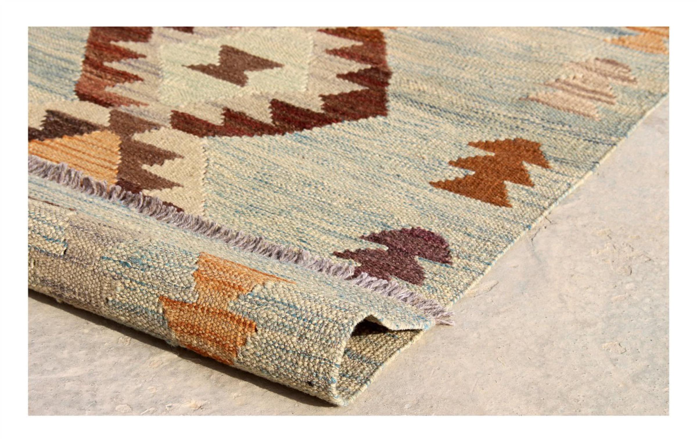 Estas alfombras kilim muestran una diferencia decisiva con las alfombras anudadas a mano - son tejidas a mano. Por lo tanto, no tienen un montón alto de lana y son a menudo más planos y más ásperos que las alfombras de lana anudada. Su fabricación es menos elaborada y por eso suelen ser mucho más baratas. Como ventaja, las alfombras de kilim son también mucho más ligeras y pueden ser colocadas por delante y por detrás. Los kilims tejidos a mano provienen originalmente de la antigua Persia y ahora también se fabrican a menudo en el Afganistán. Tienen patrones bastante simples y directos, que se deben a su técnica de tejido.