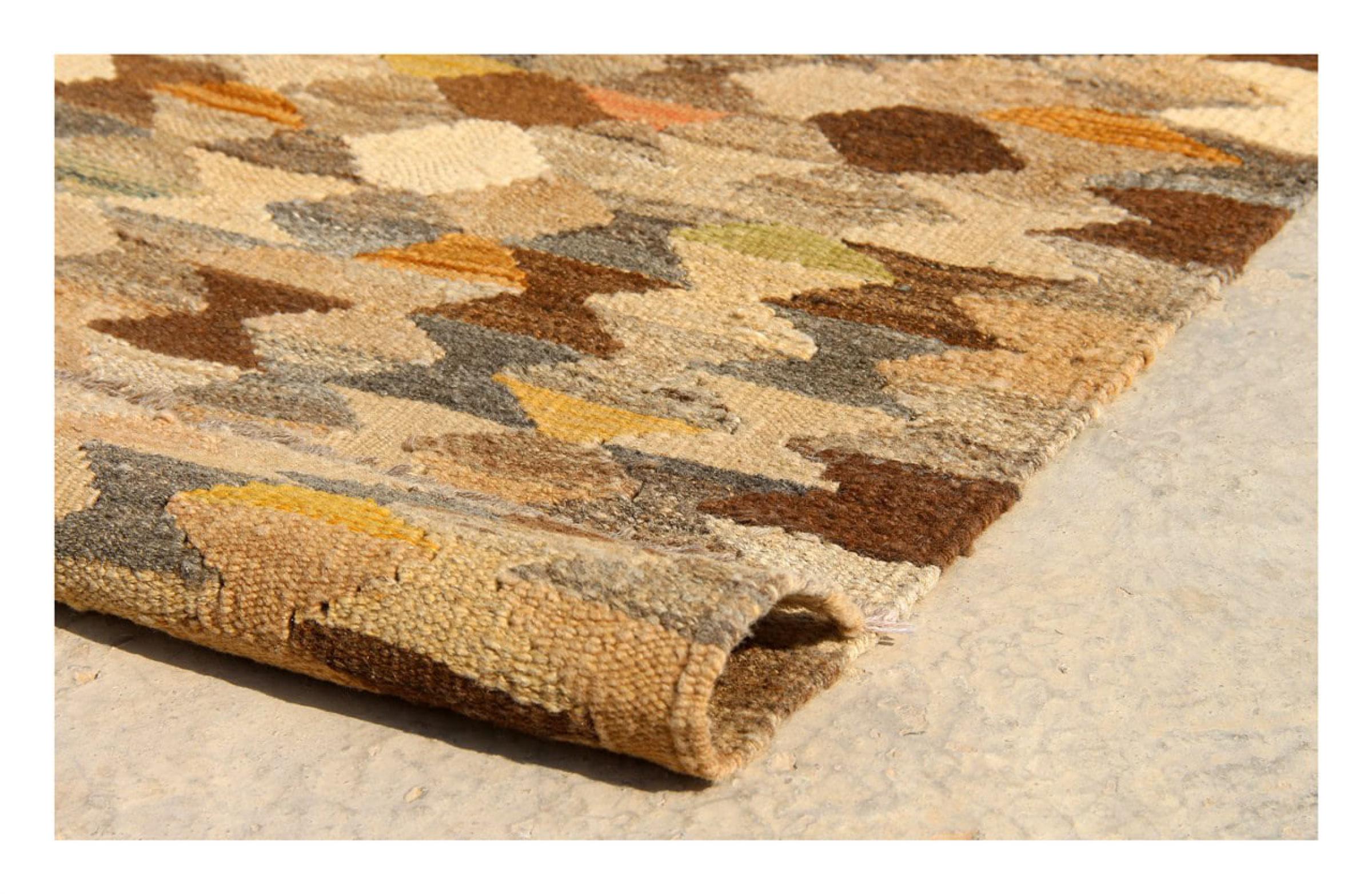 Esta alfombra fue hecha a mano en un telar como un tejido plano. Tejido plano es el término utilizado para describir las alfombras que no tienen pelo. Como el nombre promete, estas alfombras están tejidas y no anudadas. Esto resulta en una alfombra plana con una superficie estructurada. Los tejidos planos no son tan suaves y normalmente más delgados que las alfombras anudadas. Al mismo tiempo, su fabricación es mucho menos compleja y por lo general se pueden disponer por ambos lados (frontal y posterior). Sus patrones suelen ser geométricos, lo cual está determinado por el tejido.
