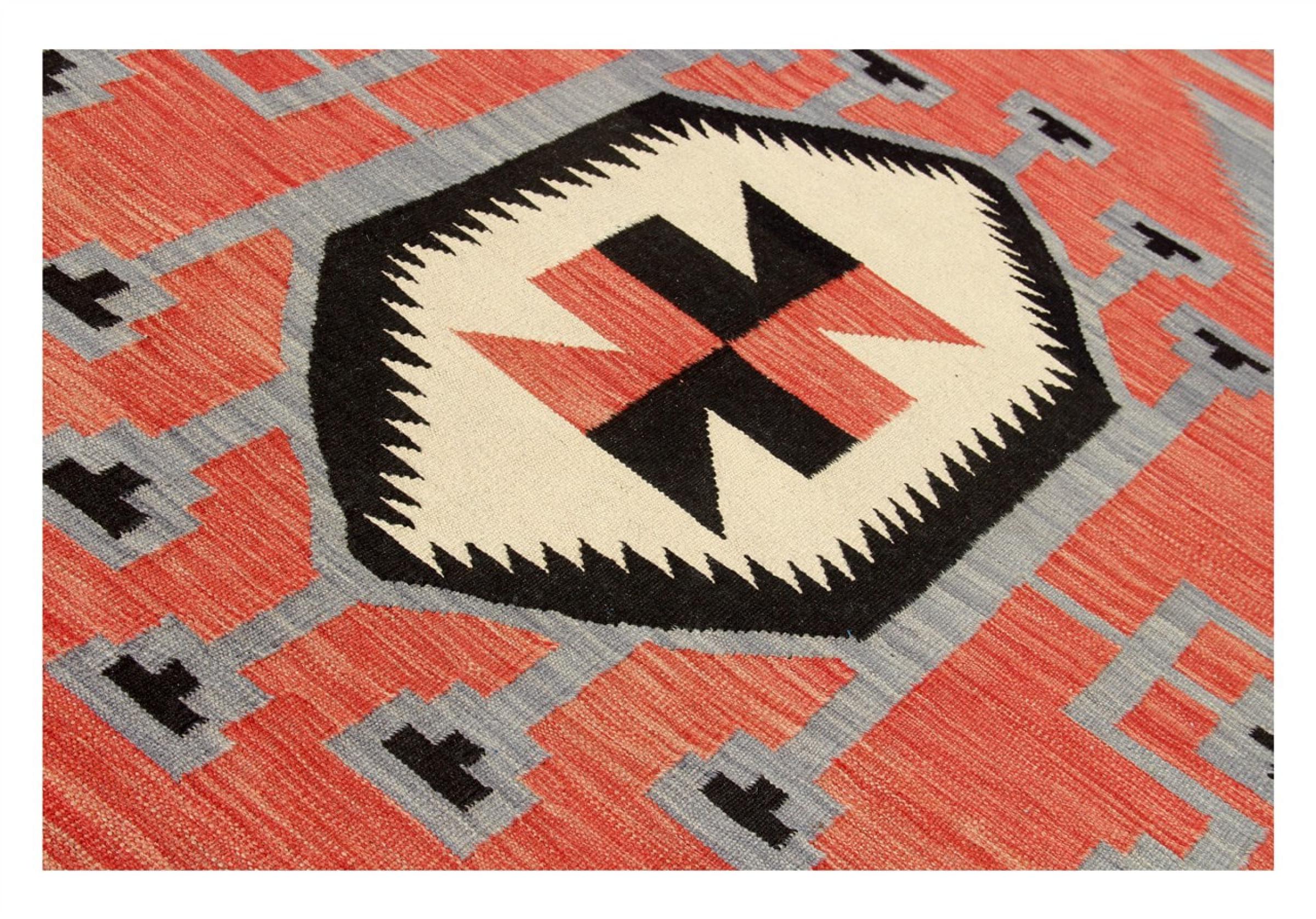 Estas alfombras kilim muestran una diferencia decisiva con las alfombras anudadas a mano - son tejidas a mano. Por lo tanto, no tienen un montón alto de lana y son a menudo más planos y más ásperos que las alfombras de lana anudada. Su fabricación es menos elaborada y por eso suelen ser mucho más baratas. Como ventaja, las alfombras de kilim son también mucho más ligeras y pueden ser colocadas por delante y por detrás. Los kilims tejidos a mano provienen originalmente de la antigua Persia y ahora también se fabrican a menudo en el Afganistán. Tienen patrones bastante simples y directos, que se deben a su técnica de tejido.