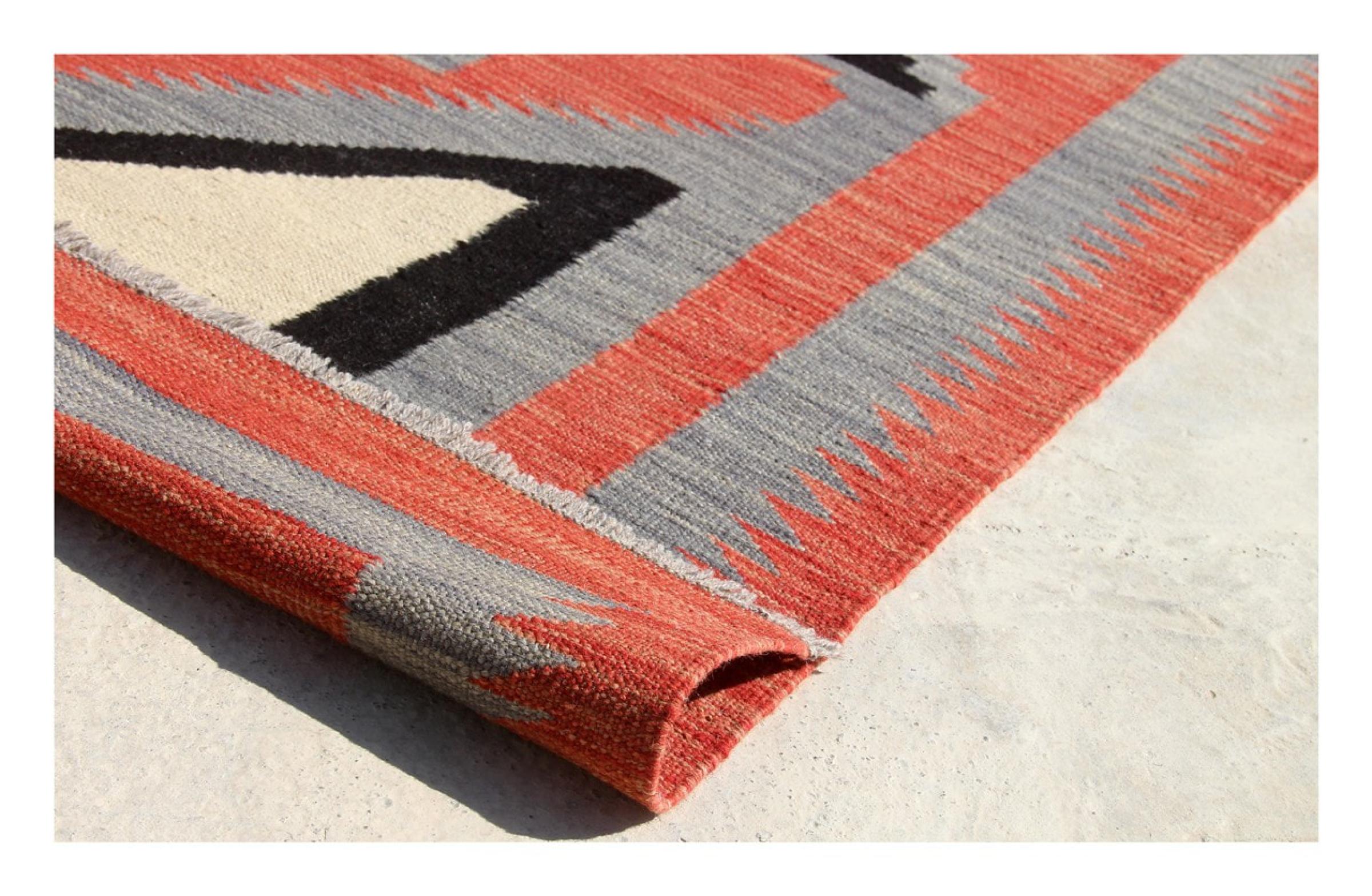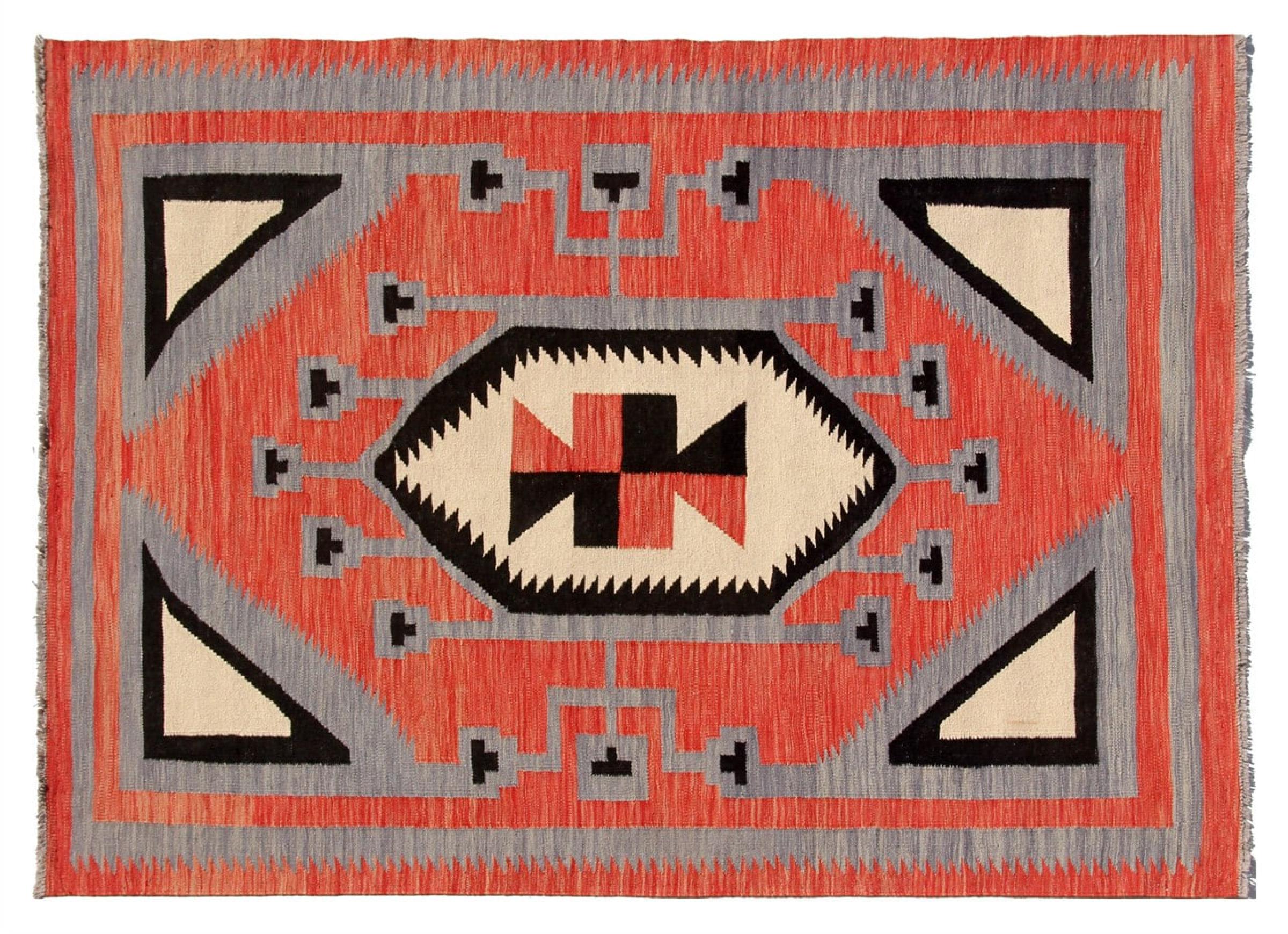Esta alfombra fue hecha a mano en un telar como un tejido plano. Tejido plano es el término utilizado para describir las alfombras que no tienen pelo. Como el nombre promete, estas alfombras están tejidas y no anudadas. Esto resulta en una alfombra plana con una superficie estructurada. Los tejidos planos no son tan suaves y normalmente más delgados que las alfombras anudadas. Al mismo tiempo, su fabricación es mucho menos compleja y por lo general se pueden disponer por ambos lados (frontal y posterior). Sus patrones suelen ser geométricos, lo cual está determinado por el tejido.