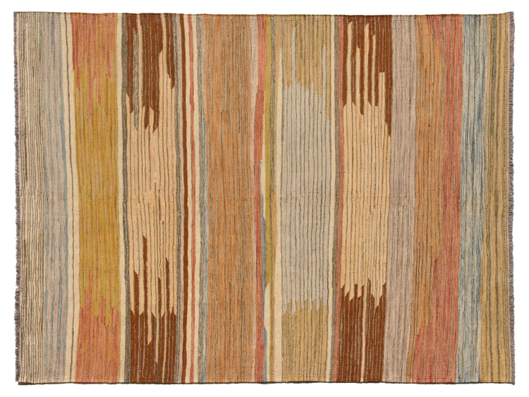 Esta alfombra fue hecha a mano en un telar como un tejido plano. Tejido plano es el término utilizado para describir las alfombras que no tienen pelo. Como el nombre promete, estas alfombras están tejidas y no anudadas. Esto resulta en una alfombra plana con una superficie estructurada. Los tejidos planos no son tan suaves y normalmente más delgados que las alfombras anudadas. Al mismo tiempo, su fabricación es mucho menos compleja y por lo general se pueden disponer por ambos lados (frontal y posterior). Sus patrones suelen ser geométricos, lo cual está determinado por el tejido.