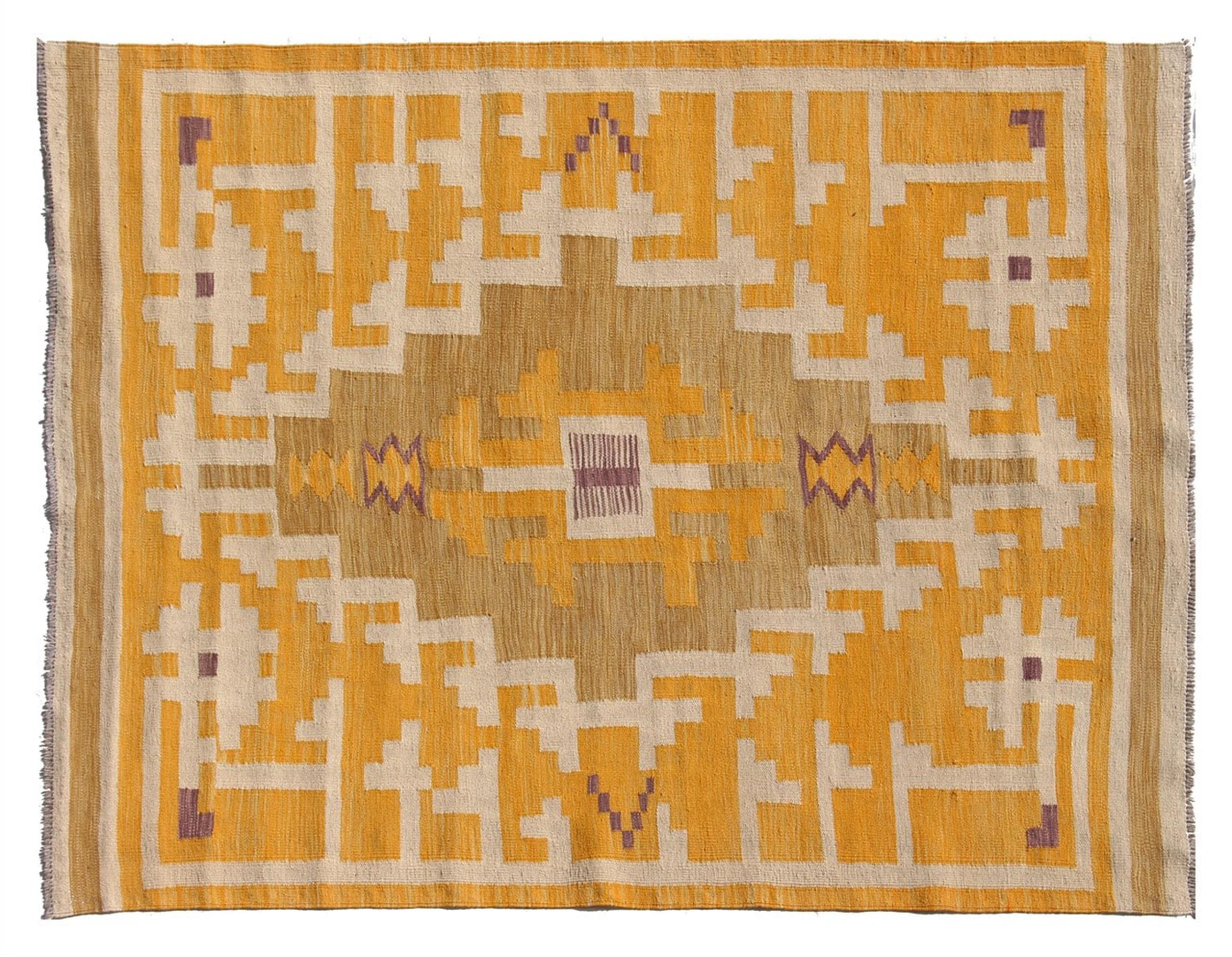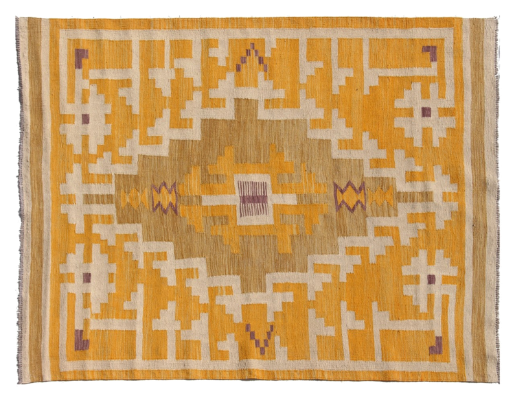 Esta alfombra fue hecha a mano en un telar como un tejido plano. Tejido plano es el término utilizado para describir las alfombras que no tienen pelo. Como el nombre promete, estas alfombras están tejidas y no anudadas. Esto resulta en una alfombra plana con una superficie estructurada. Los tejidos planos no son tan suaves y normalmente más delgados que las alfombras anudadas. Al mismo tiempo, su fabricación es mucho menos compleja y por lo general se pueden disponer por ambos lados (frontal y posterior). Sus patrones suelen ser geométricos, lo cual está determinado por el tejido.