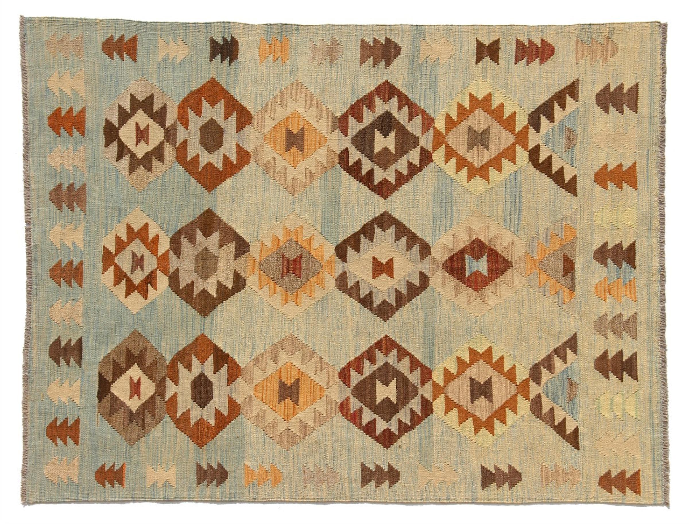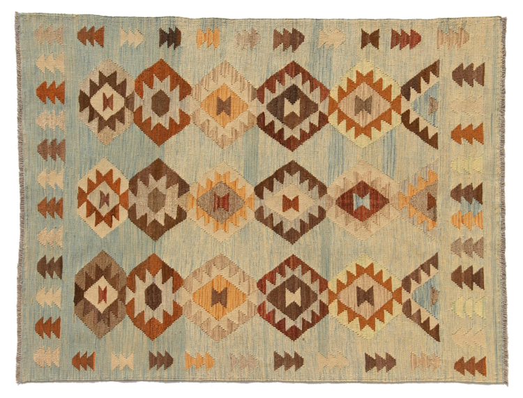 Estas alfombras kilim muestran una diferencia decisiva con las alfombras anudadas a mano - son tejidas a mano. Por lo tanto, no tienen un montón alto de lana y son a menudo más planos y más ásperos que las alfombras de lana anudada. Su fabricación es menos elaborada y por eso suelen ser mucho más baratas. Como ventaja, las alfombras de kilim son también mucho más ligeras y pueden ser colocadas por delante y por detrás. Los kilims tejidos a mano provienen originalmente de la antigua Persia y ahora también se fabrican a menudo en el Afganistán. Tienen patrones bastante simples y directos, que se deben a su técnica de tejido.
