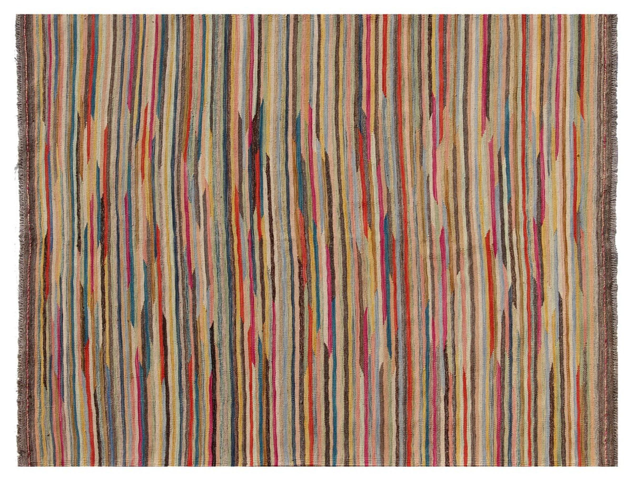 Esta alfombra fue hecha a mano en un telar como un tejido plano. Tejido plano es el término utilizado para describir las alfombras que no tienen pelo. Como el nombre promete, estas alfombras están tejidas y no anudadas. Esto resulta en una alfombra plana con una superficie estructurada. Los tejidos planos no son tan suaves y normalmente más delgados que las alfombras anudadas. Al mismo tiempo, su fabricación es mucho menos compleja y por lo general se pueden disponer por ambos lados (frontal y posterior). Sus patrones suelen ser geométricos, lo cual está determinado por el tejido.
