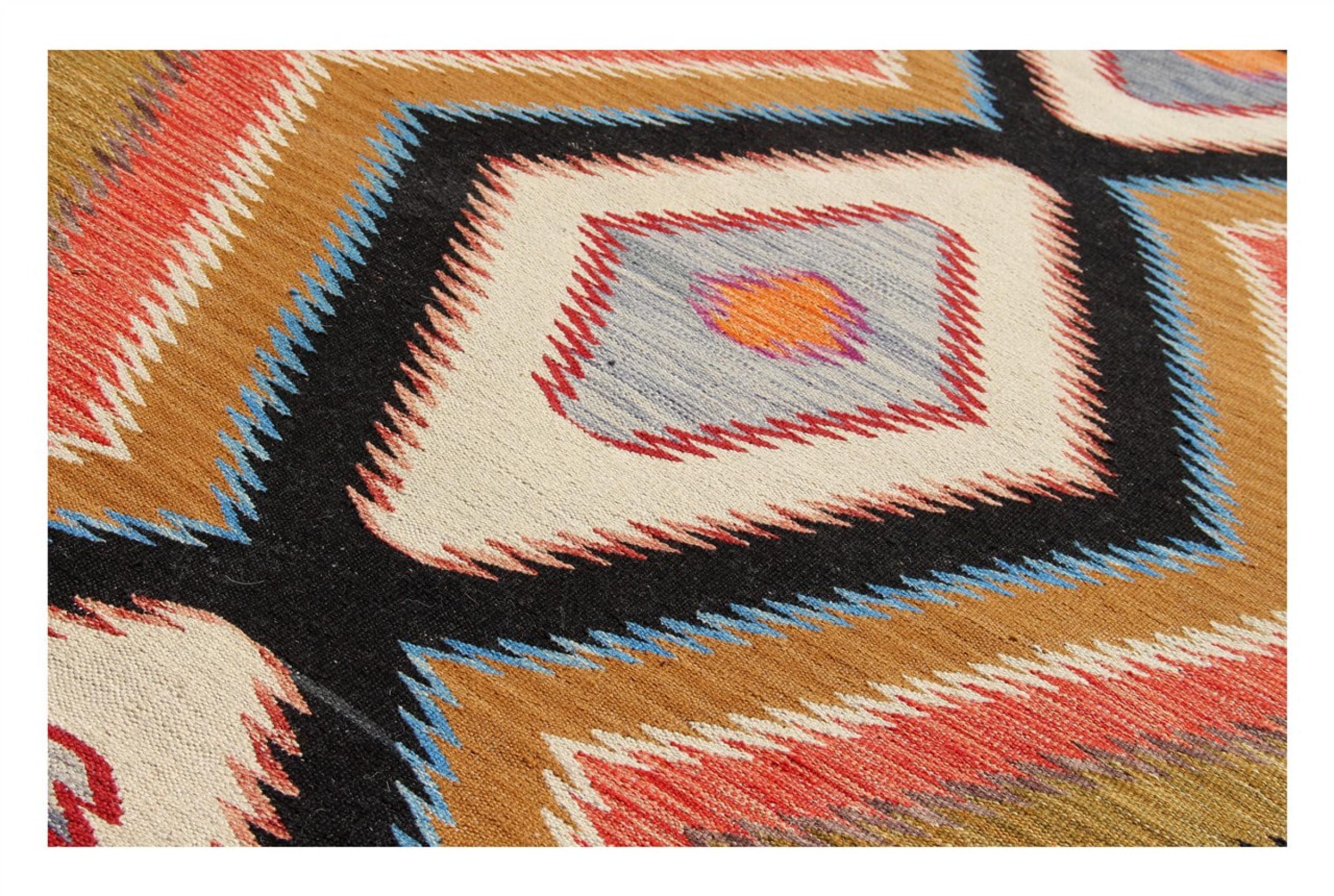 Estas alfombras kilim muestran una diferencia decisiva con las alfombras anudadas a mano - son tejidas a mano. Por lo tanto, no tienen un montón alto de lana y son a menudo más planos y más ásperos que las alfombras de lana anudada. Su fabricación es menos elaborada y por eso suelen ser mucho más baratas. Como ventaja, las alfombras de kilim son también mucho más ligeras y pueden ser colocadas por delante y por detrás. Los kilims tejidos a mano provienen originalmente de la antigua Persia y ahora también se fabrican a menudo en el Afganistán. Tienen patrones bastante simples y directos, que se deben a su técnica de tejido.