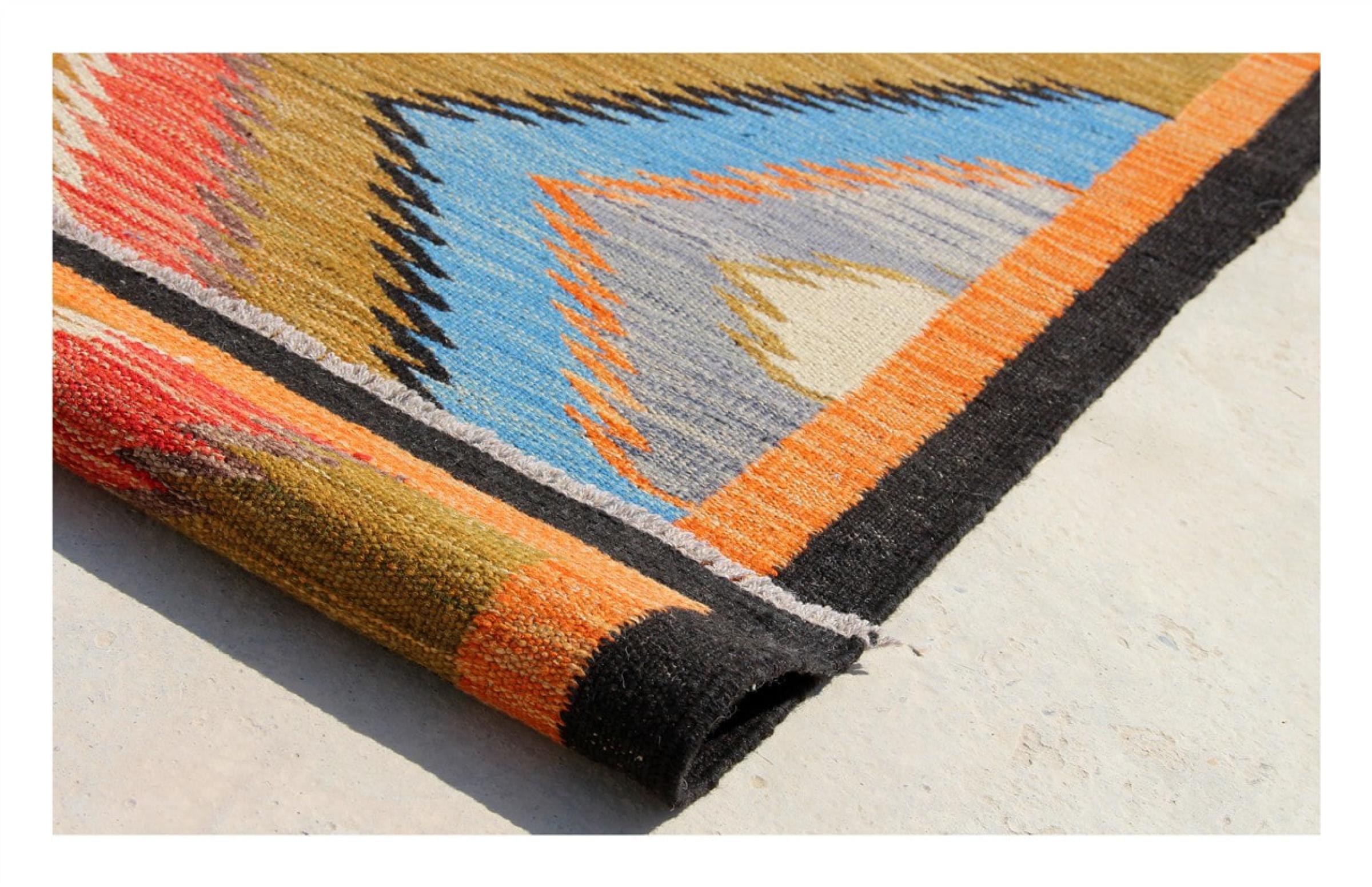 Esta alfombra fue hecha a mano en un telar como un tejido plano. Tejido plano es el término utilizado para describir las alfombras que no tienen pelo. Como el nombre promete, estas alfombras están tejidas y no anudadas. Esto resulta en una alfombra plana con una superficie estructurada. Los tejidos planos no son tan suaves y normalmente más delgados que las alfombras anudadas. Al mismo tiempo, su fabricación es mucho menos compleja y por lo general se pueden disponer por ambos lados (frontal y posterior). Sus patrones suelen ser geométricos, lo cual está determinado por el tejido.