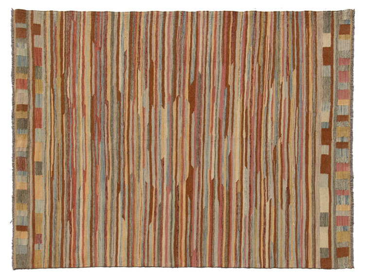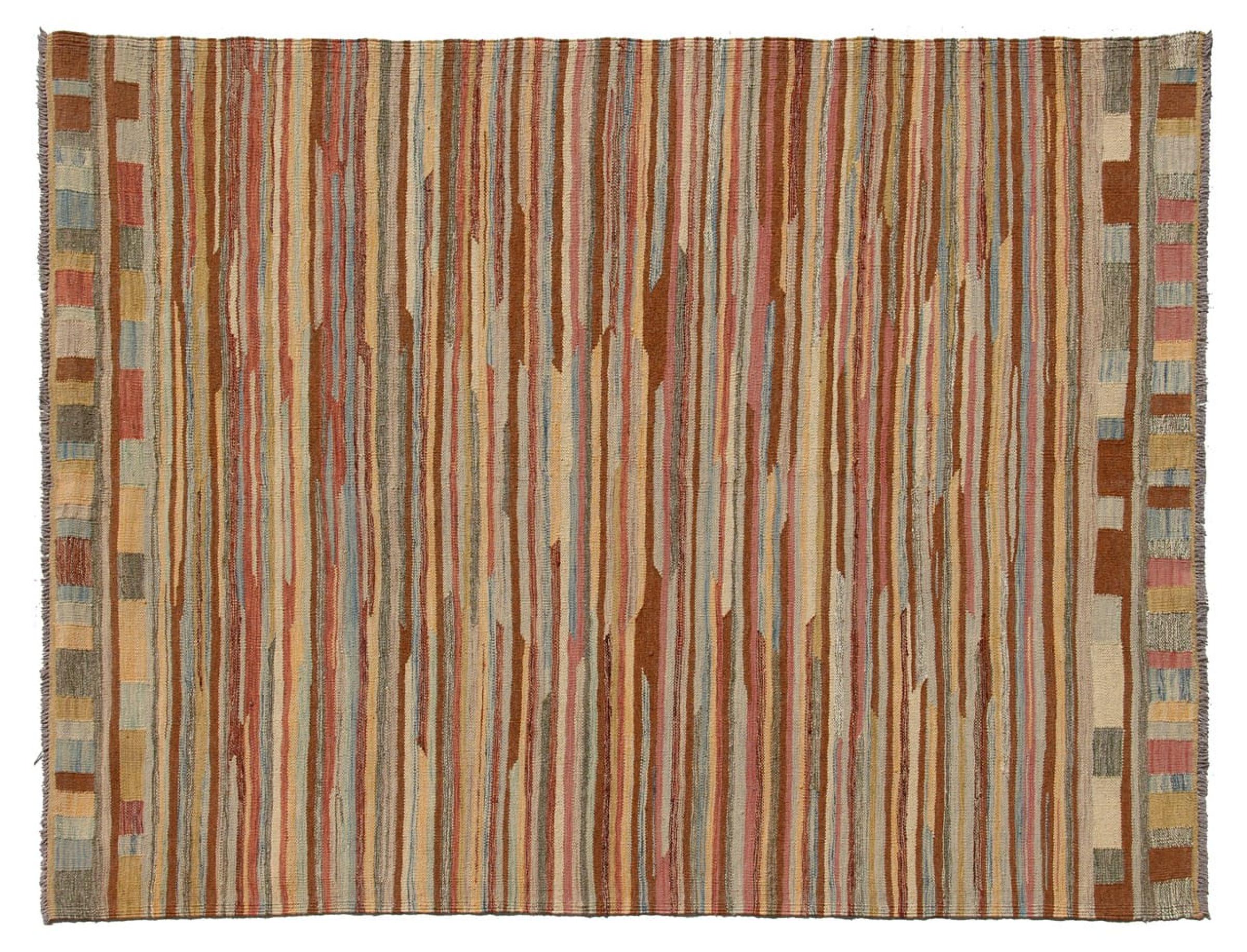 Esta alfombra fue hecha a mano en un telar como un tejido plano. Tejido plano es el término utilizado para describir las alfombras que no tienen pelo. Como el nombre promete, estas alfombras están tejidas y no anudadas. Esto resulta en una alfombra plana con una superficie estructurada. Los tejidos planos no son tan suaves y normalmente más delgados que las alfombras anudadas. Al mismo tiempo, su fabricación es mucho menos compleja y por lo general se pueden disponer por ambos lados (frontal y posterior). Sus patrones suelen ser geométricos, lo cual está determinado por el tejido.