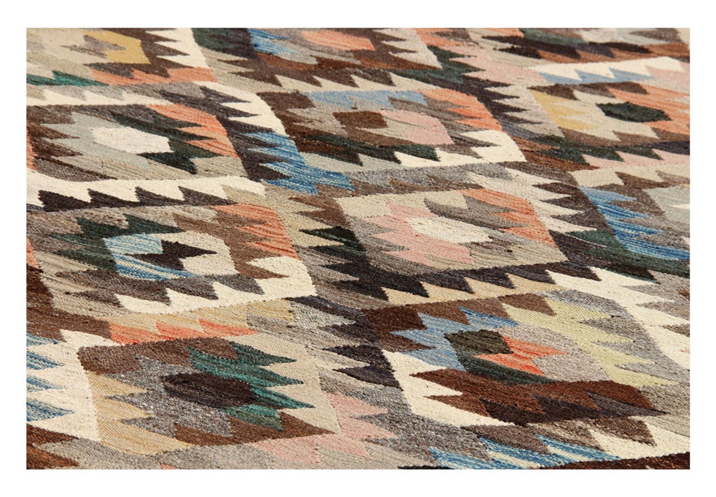 Esta alfombra fue hecha a mano en un telar como un tejido plano. Tejido plano es el término utilizado para describir las alfombras que no tienen pelo. Como el nombre promete, estas alfombras están tejidas y no anudadas. Esto resulta en una alfombra plana con una superficie estructurada. Los tejidos planos no son tan suaves y normalmente más delgados que las alfombras anudadas. Al mismo tiempo, su fabricación es mucho menos compleja y por lo general se pueden disponer por ambos lados (frontal y posterior). Sus patrones suelen ser geométricos, lo cual está determinado por el tejido.