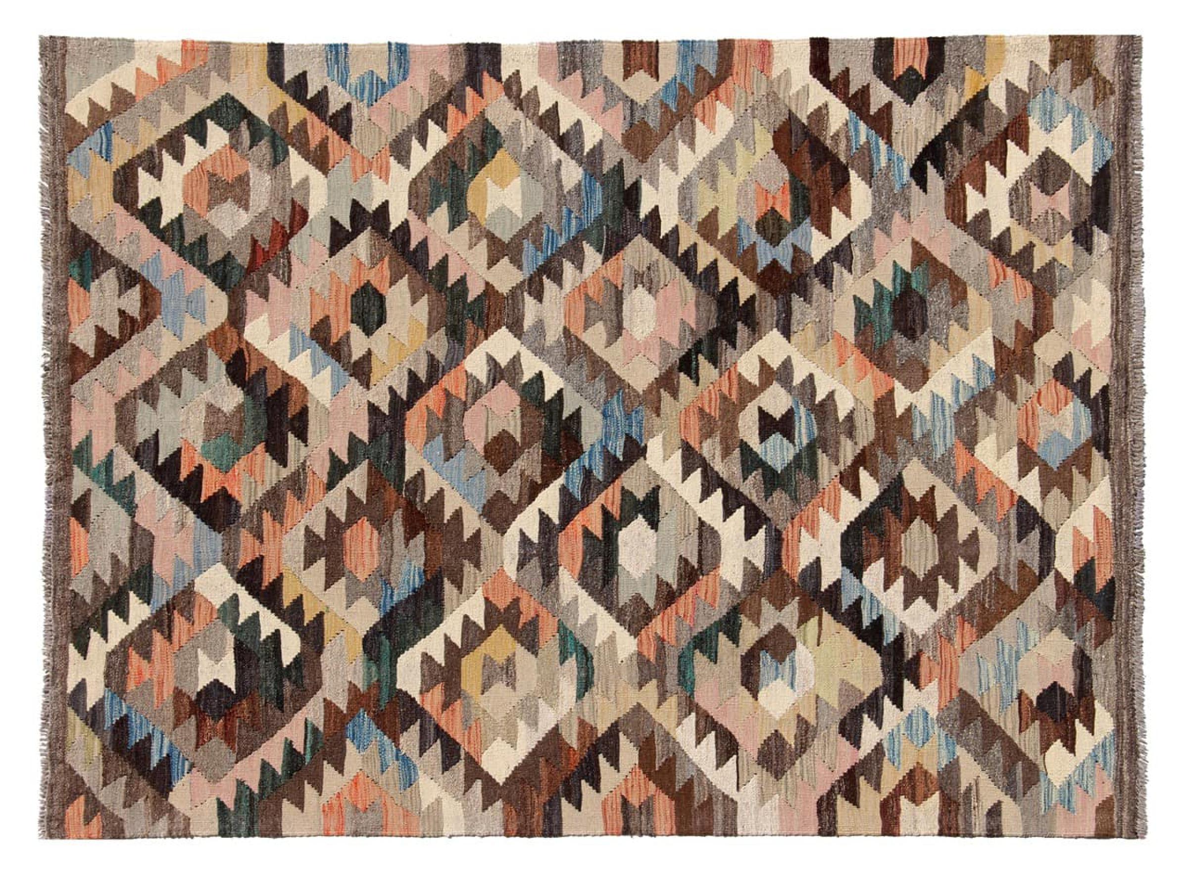 Estas alfombras kilim muestran una diferencia decisiva con las alfombras anudadas a mano - son tejidas a mano. Por lo tanto, no tienen un montón alto de lana y son a menudo más planos y más ásperos que las alfombras de lana anudada. Su fabricación es menos elaborada y por eso suelen ser mucho más baratas. Como ventaja, las alfombras de kilim son también mucho más ligeras y pueden ser colocadas por delante y por detrás. Los kilims tejidos a mano provienen originalmente de la antigua Persia y ahora también se fabrican a menudo en el Afganistán. Tienen patrones bastante simples y directos, que se deben a su técnica de tejido.