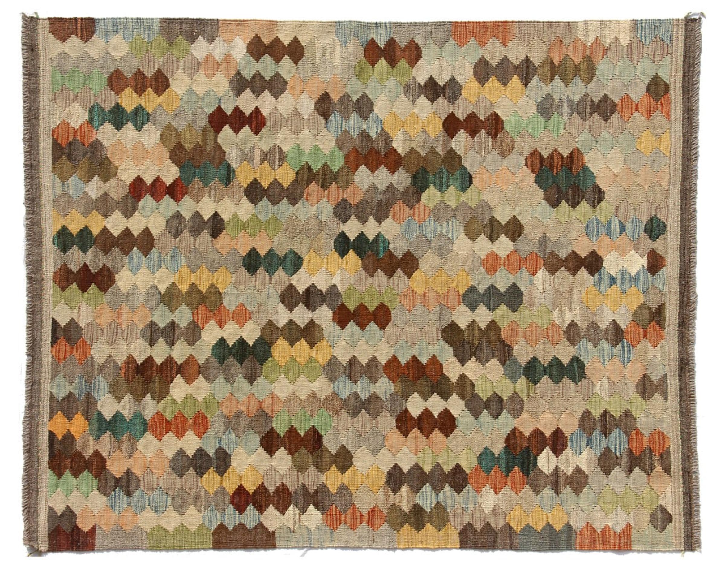 Esta alfombra fue hecha a mano en un telar como un tejido plano. Tejido plano es el término utilizado para describir las alfombras que no tienen pelo. Como el nombre promete, estas alfombras están tejidas y no anudadas. Esto resulta en una alfombra plana con una superficie estructurada. Los tejidos planos no son tan suaves y normalmente más delgados que las alfombras anudadas. Al mismo tiempo, su fabricación es mucho menos compleja y por lo general se pueden disponer por ambos lados (frontal y posterior). Sus patrones suelen ser geométricos, lo cual está determinado por el tejido.