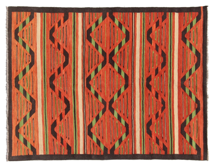 Esta alfombra fue hecha a mano en un telar como un tejido plano. Tejido plano es el término utilizado para describir las alfombras que no tienen pelo. Como el nombre promete, estas alfombras están tejidas y no anudadas. Esto resulta en una alfombra plana con una superficie estructurada. Los tejidos planos no son tan suaves y normalmente más delgados que las alfombras anudadas. Al mismo tiempo, su fabricación es mucho menos compleja y por lo general se pueden disponer por ambos lados (frontal y posterior). Sus patrones suelen ser geométricos, lo cual está determinado por el tejido.