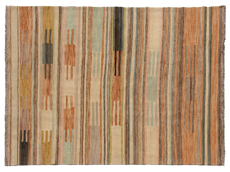 Estas alfombras kilim muestran una diferencia decisiva con las alfombras anudadas a mano - son tejidas a mano. Por lo tanto, no tienen un montón alto de lana y son a menudo más planos y más ásperos que las alfombras de lana anudada. Su fabricación es menos elaborada y por eso suelen ser mucho más baratas. Como ventaja, las alfombras de kilim son también mucho más ligeras y pueden ser colocadas por delante y por detrás. Los kilims tejidos a mano provienen originalmente de la antigua Persia y ahora también se fabrican a menudo en el Afganistán. Tienen patrones bastante simples y directos, que se deben a su técnica de tejido.