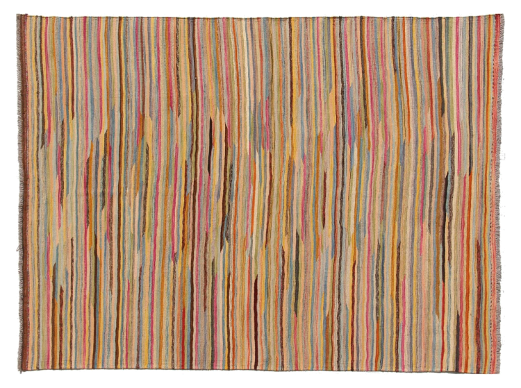 Esta alfombra fue hecha a mano en un telar como un tejido plano. Tejido plano es el término utilizado para describir las alfombras que no tienen pelo. Como el nombre promete, estas alfombras están tejidas y no anudadas. Esto resulta en una alfombra plana con una superficie estructurada. Los tejidos planos no son tan suaves y normalmente más delgados que las alfombras anudadas. Al mismo tiempo, su fabricación es mucho menos compleja y por lo general se pueden disponer por ambos lados (frontal y posterior). Sus patrones suelen ser geométricos, lo cual está determinado por el tejido.