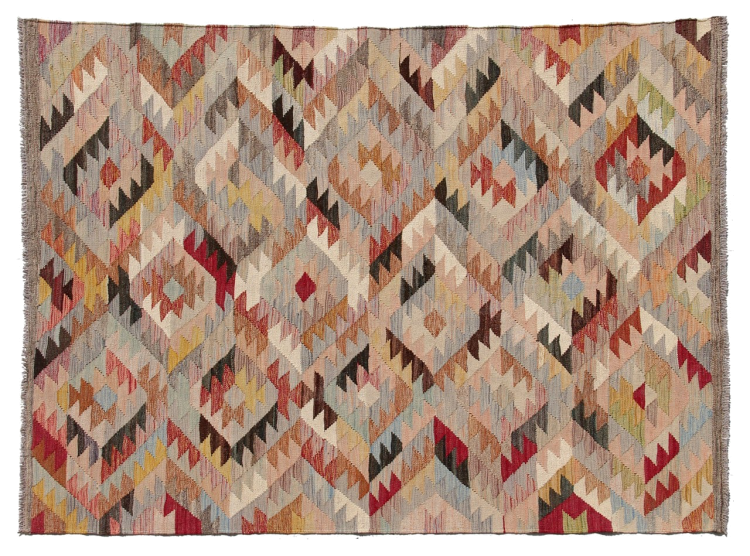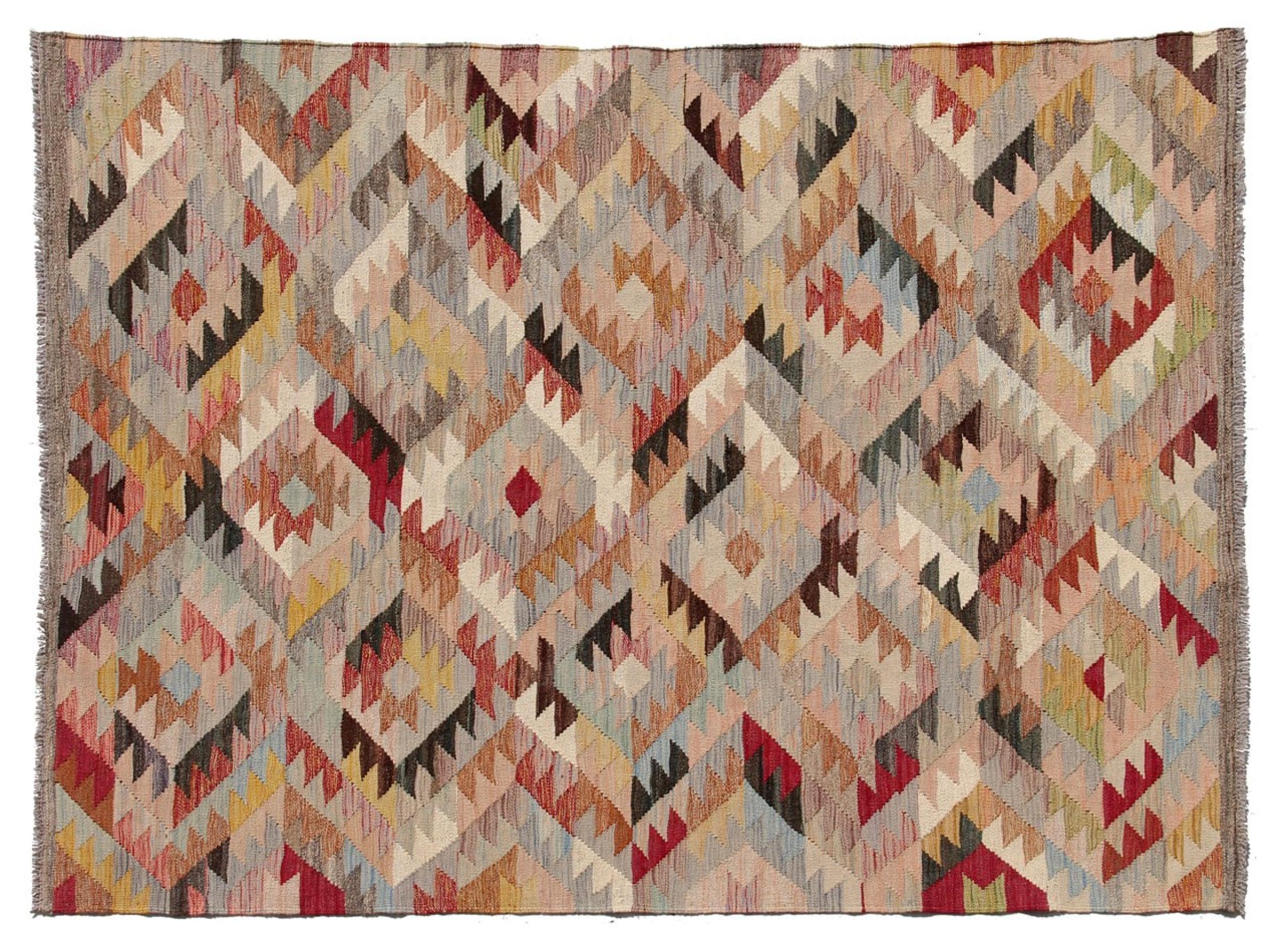 Estas alfombras kilim muestran una diferencia decisiva con las alfombras anudadas a mano - son tejidas a mano. Por lo tanto, no tienen un montón alto de lana y son a menudo más planos y más ásperos que las alfombras de lana anudada. Su fabricación es menos elaborada y por eso suelen ser mucho más baratas. Como ventaja, las alfombras de kilim son también mucho más ligeras y pueden ser colocadas por delante y por detrás. Los kilims tejidos a mano provienen originalmente de la antigua Persia y ahora también se fabrican a menudo en el Afganistán. Tienen patrones bastante simples y directos, que se deben a su técnica de tejido.